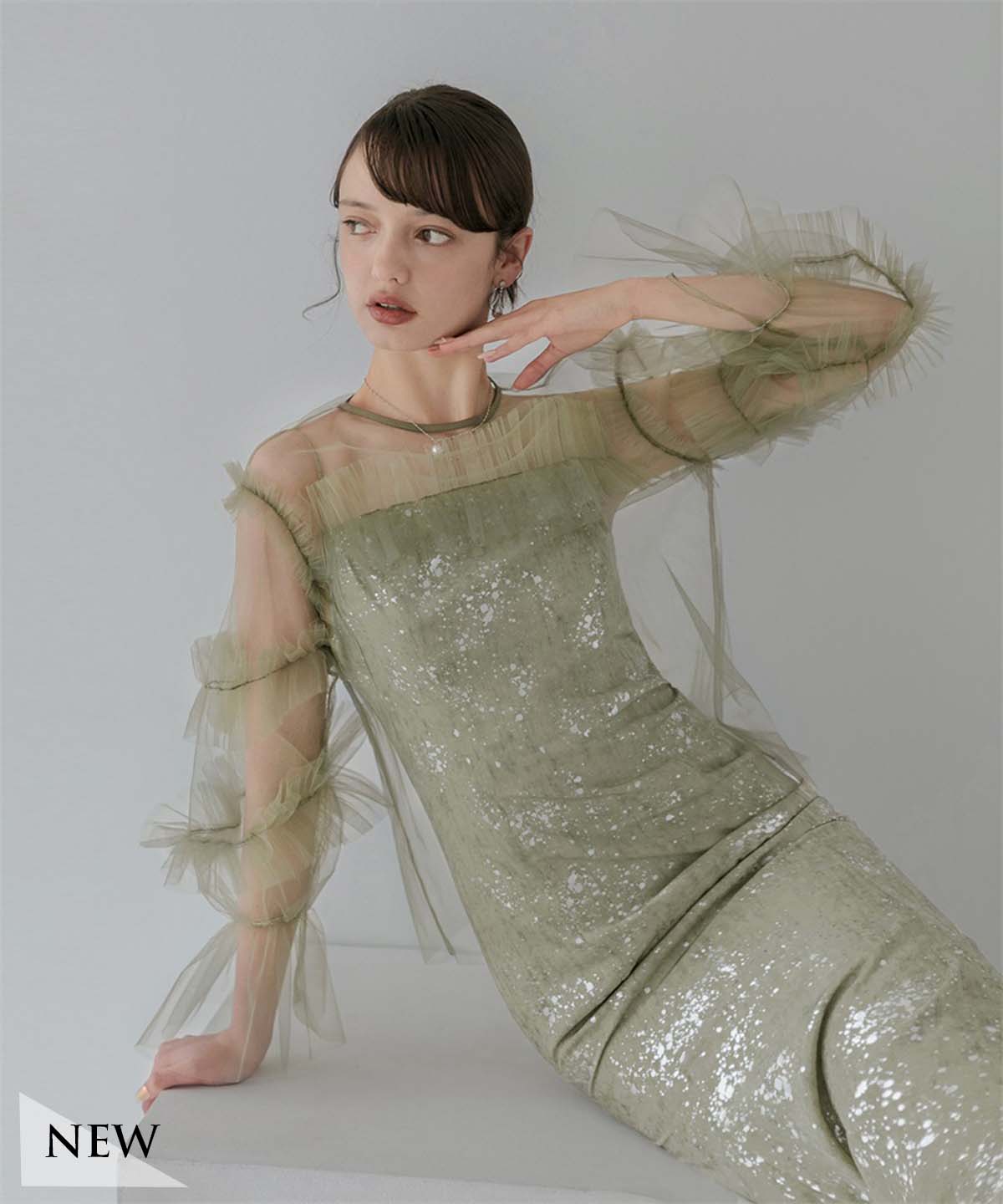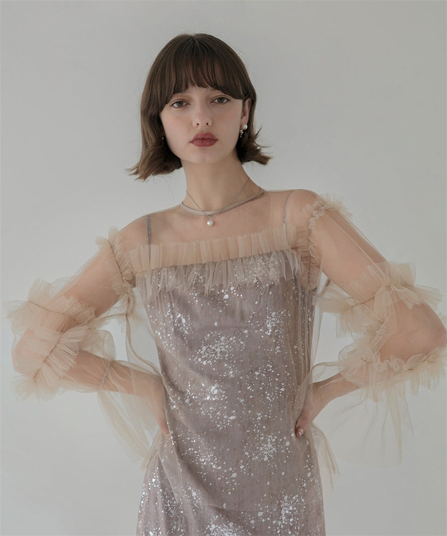 【一部当日発送】シアーチュールベルスリーブペイントIラインワンピースドレス