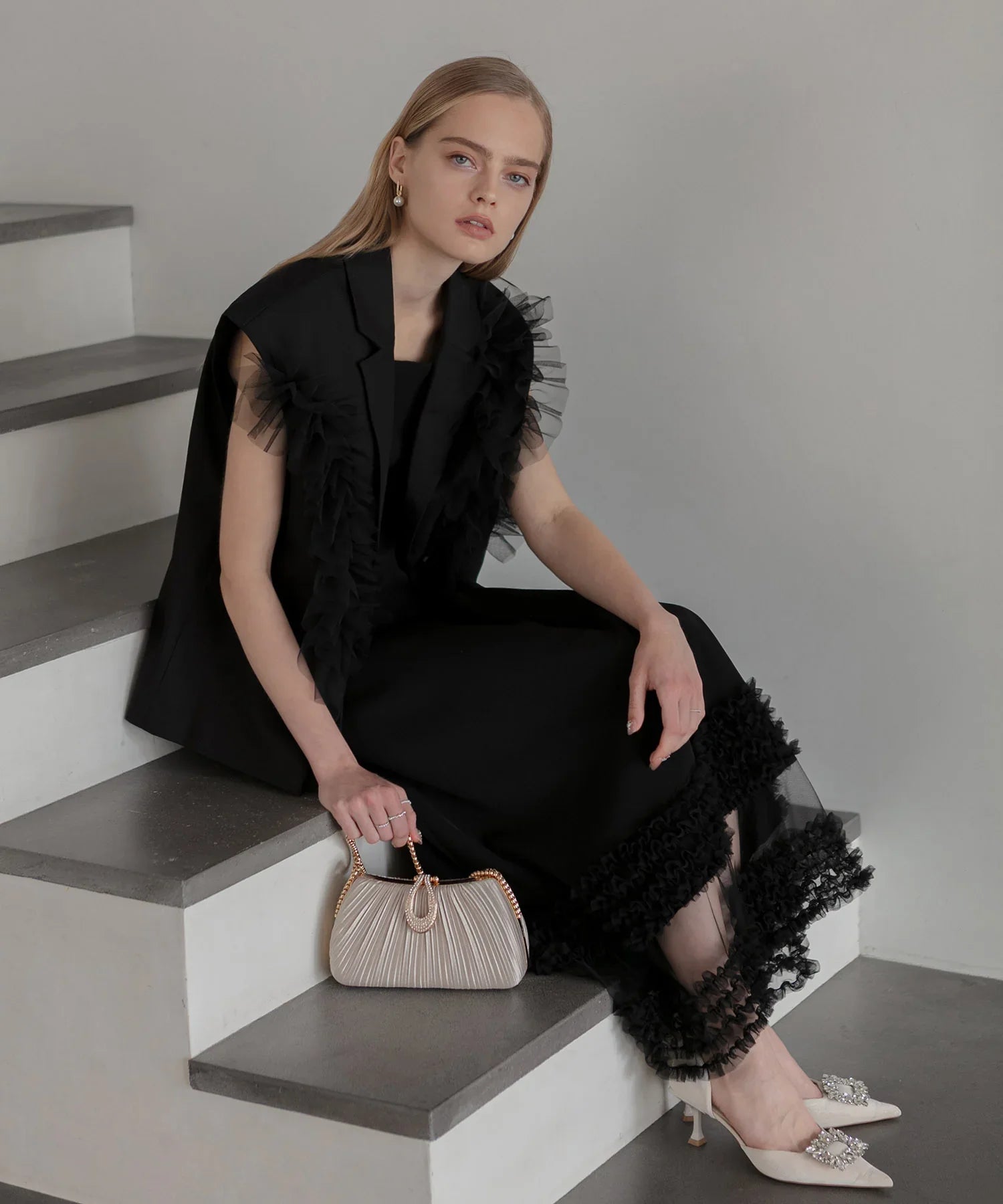 【当日発送】ボリュームチュールスリーブベストセットアップドレス