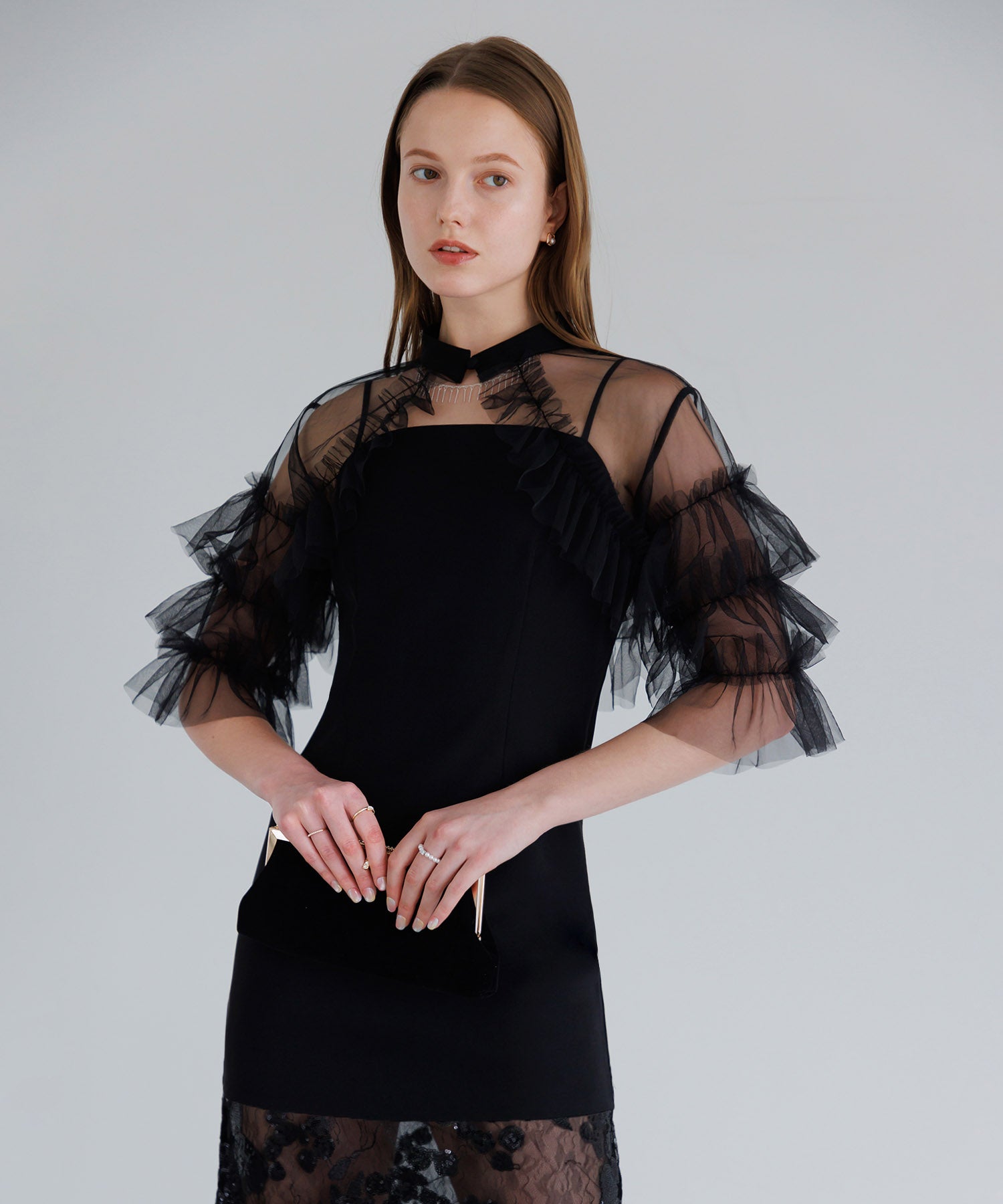 【当日発送】チュールフリルショルダーシアーIラインワンピースドレス
