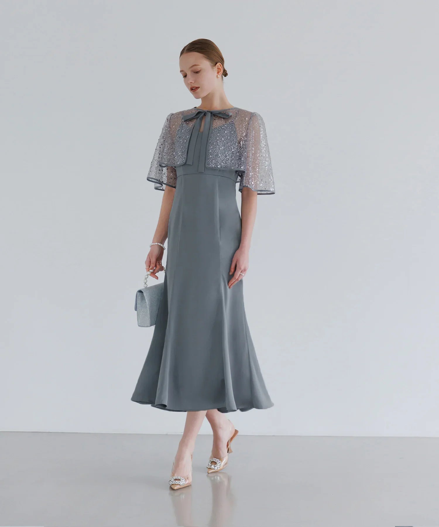 【当日発送】シアーケープスパンコールIラインワンピースドレス