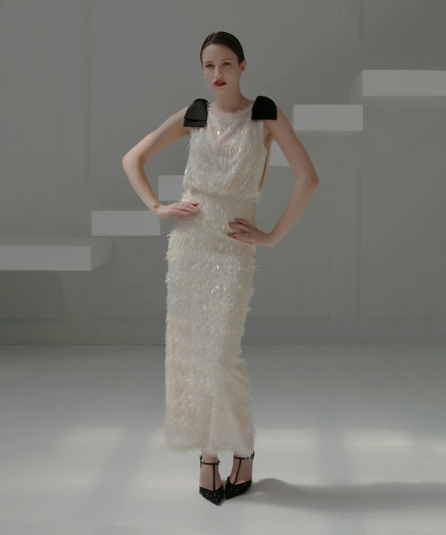 【LEJA LUXE】ビッグリボンシアーショルダードレープロングドレス