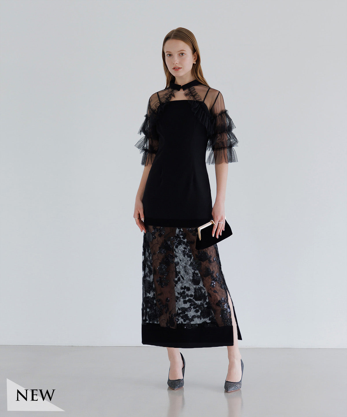 【一部当日発送】フラワースパンコールシアーフリルスリーブIラインワンピースドレス