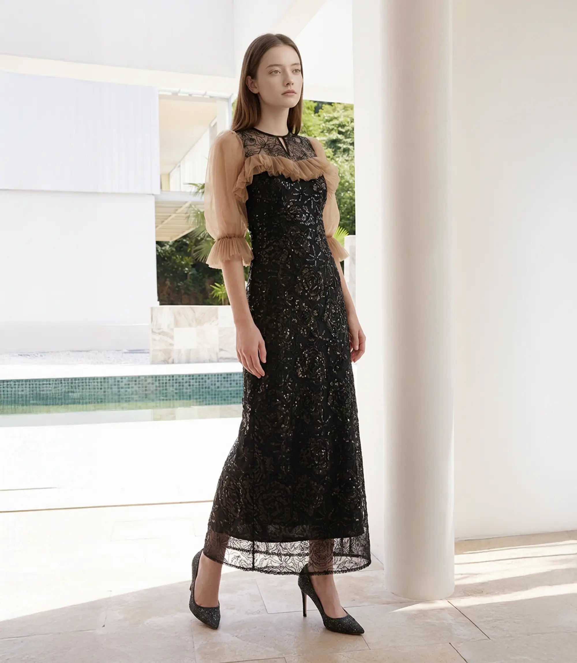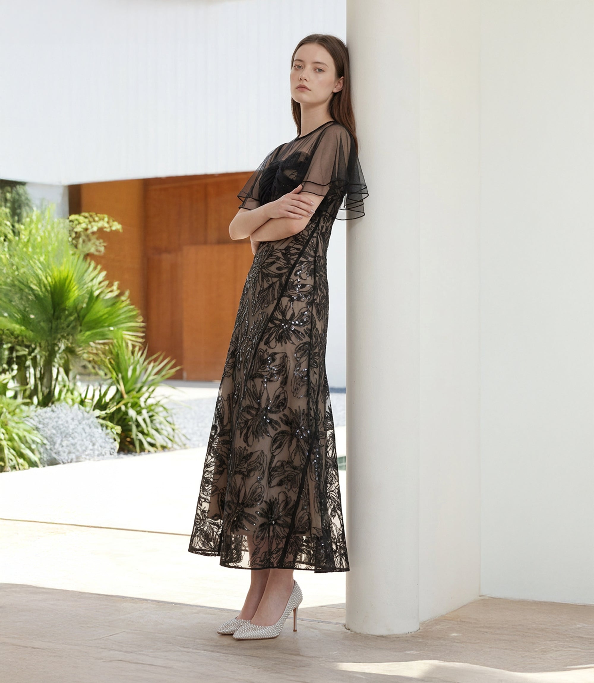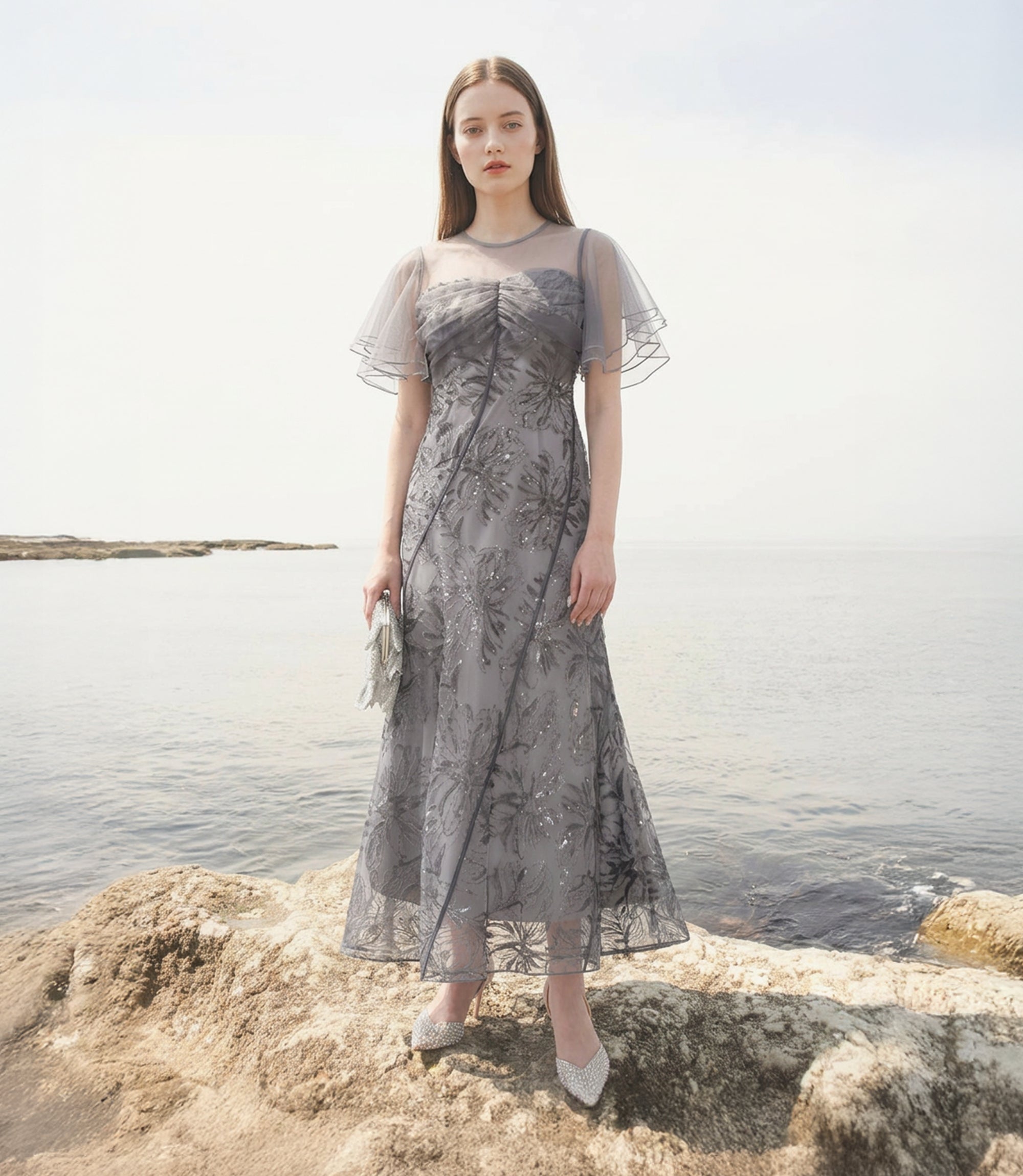 Floral Sequin Tulle Flare Sleeve Mermaid Dress | ¥20,700 (tax-in)