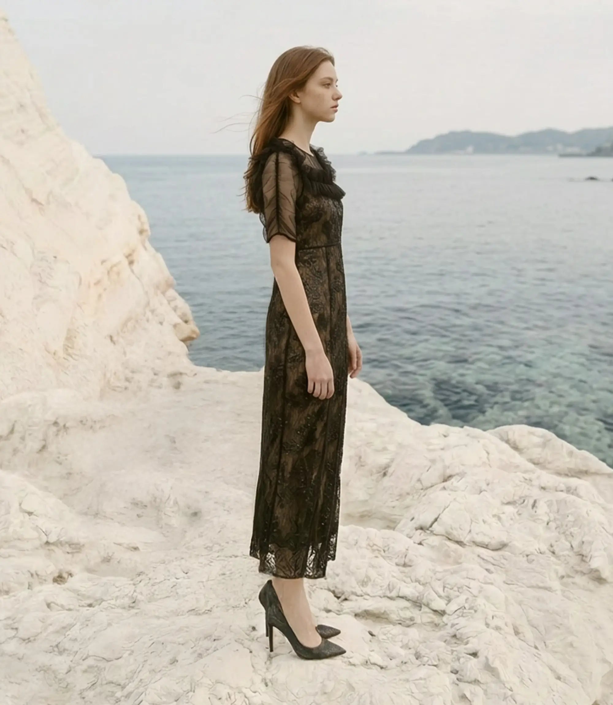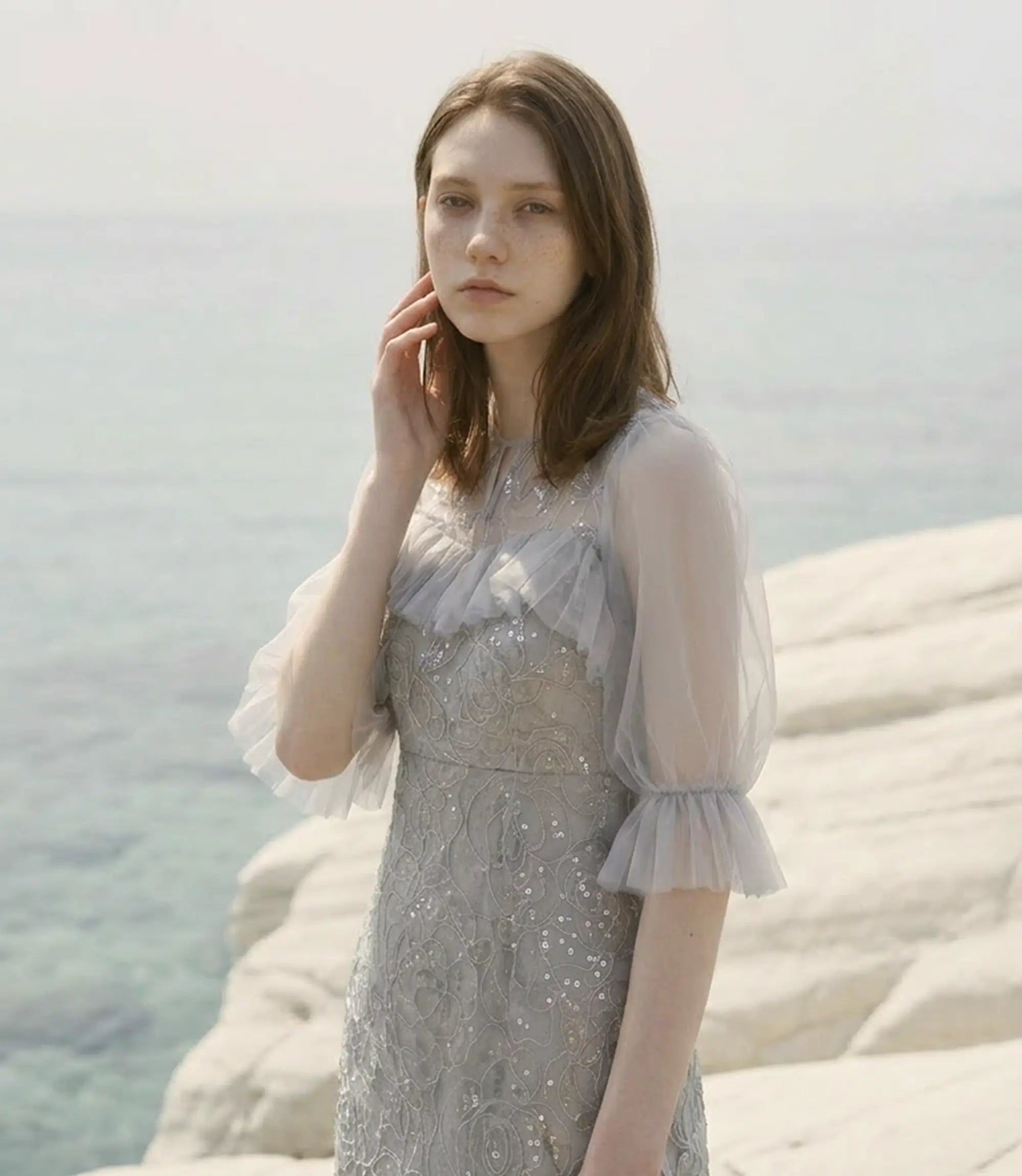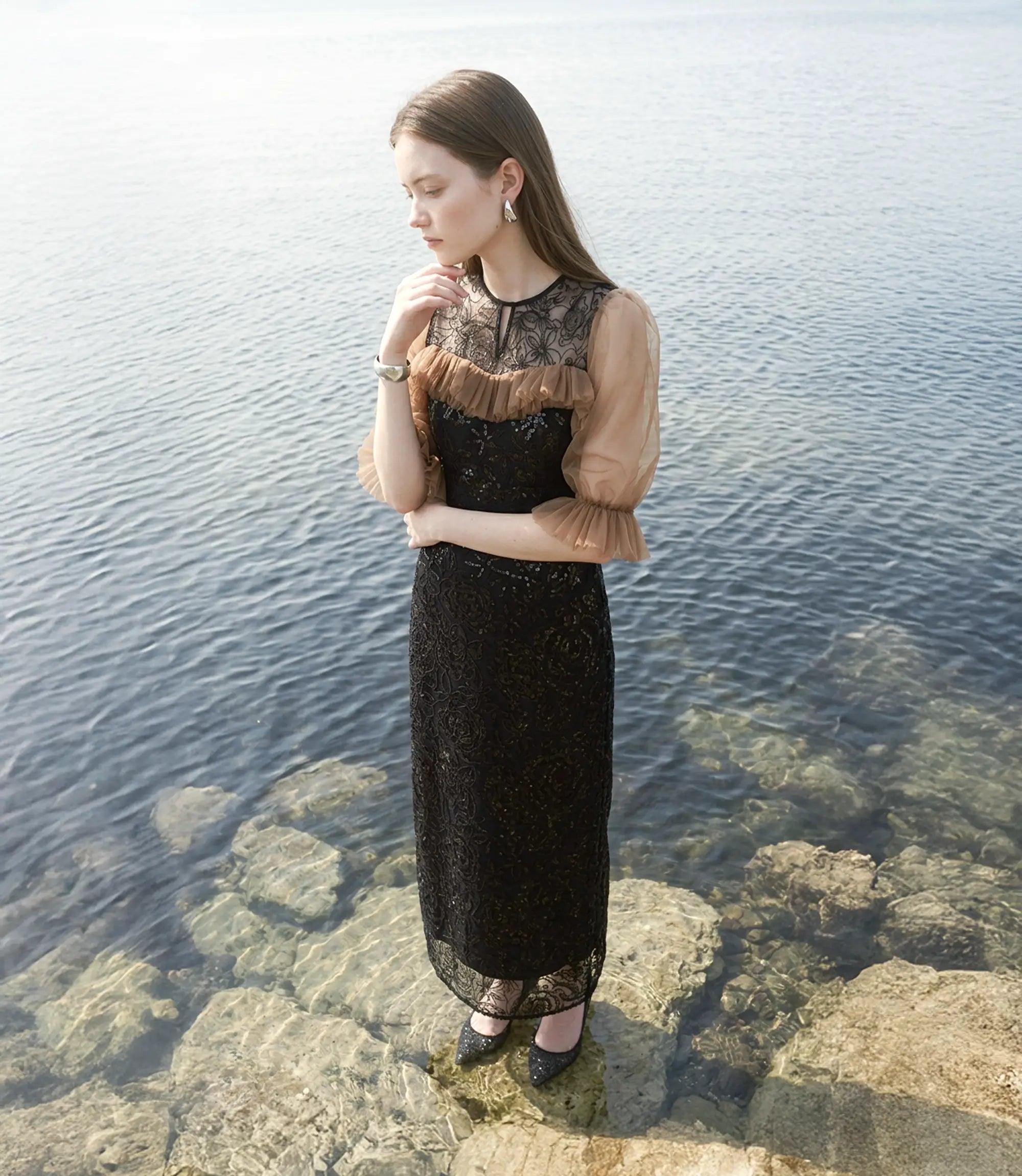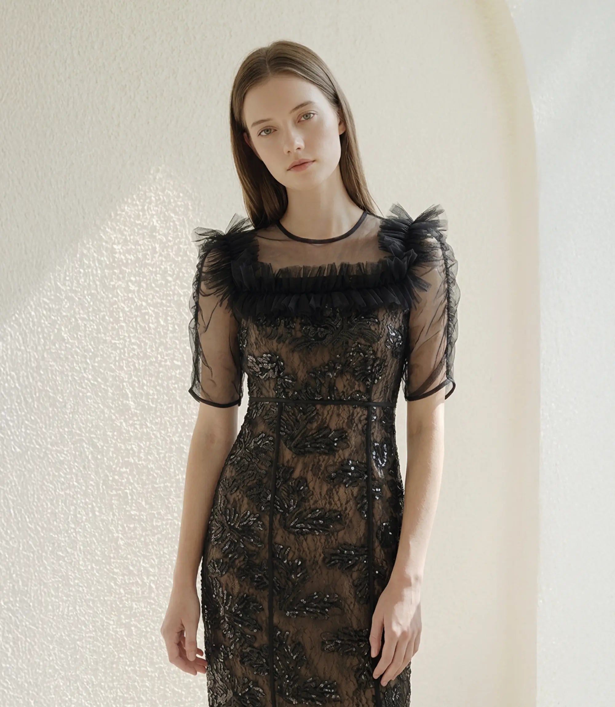 Tulle Gathered Floral Sequin I-Line Dress | ¥19,700 (tax-in)
