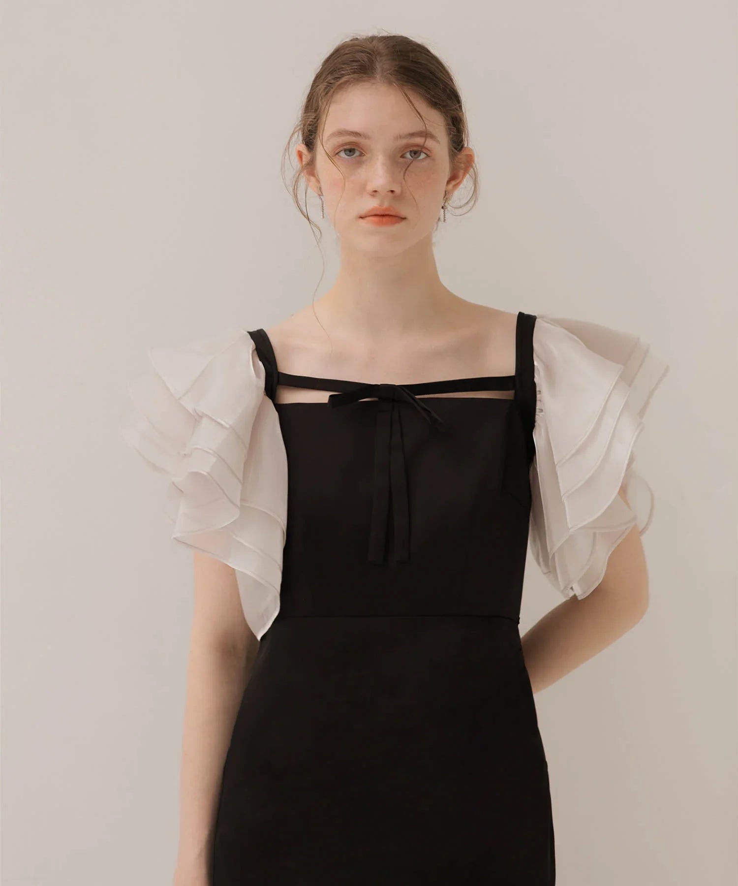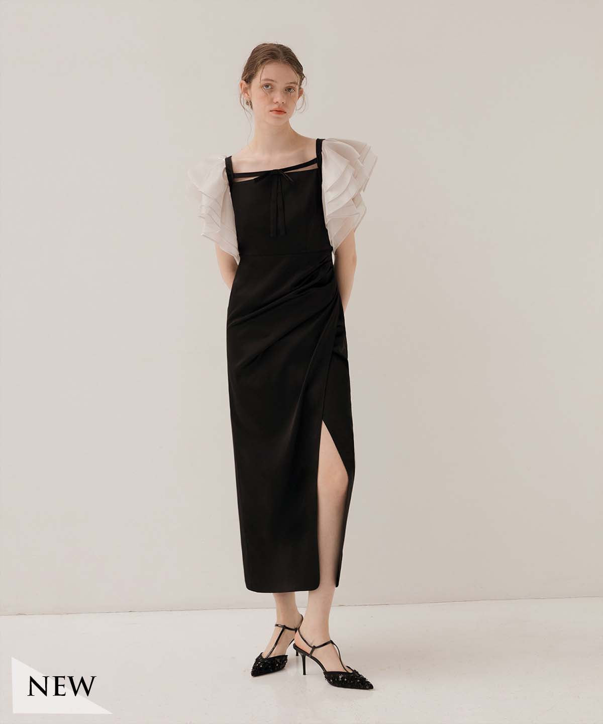 【一部当日発送】フリルチュールスリーブリボンIラインワンピースドレス