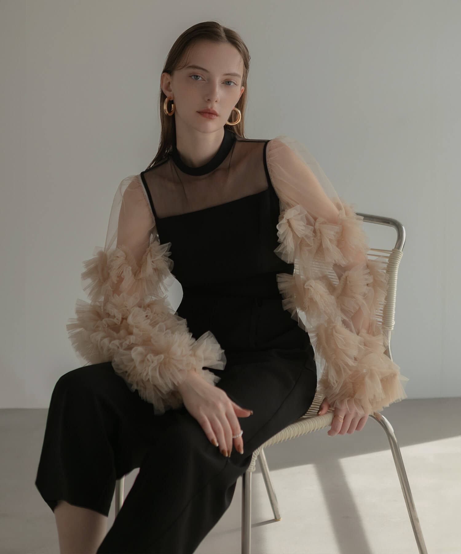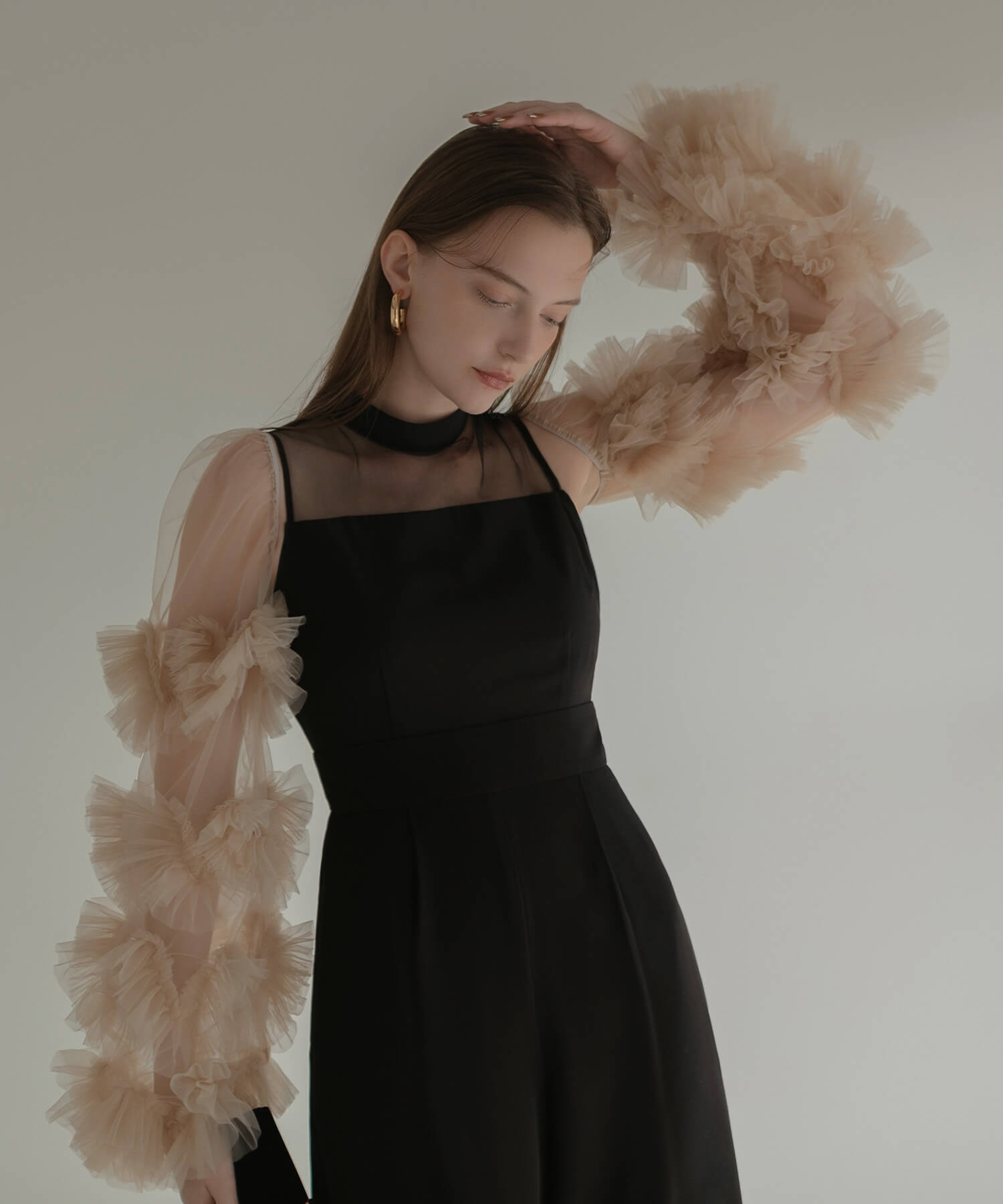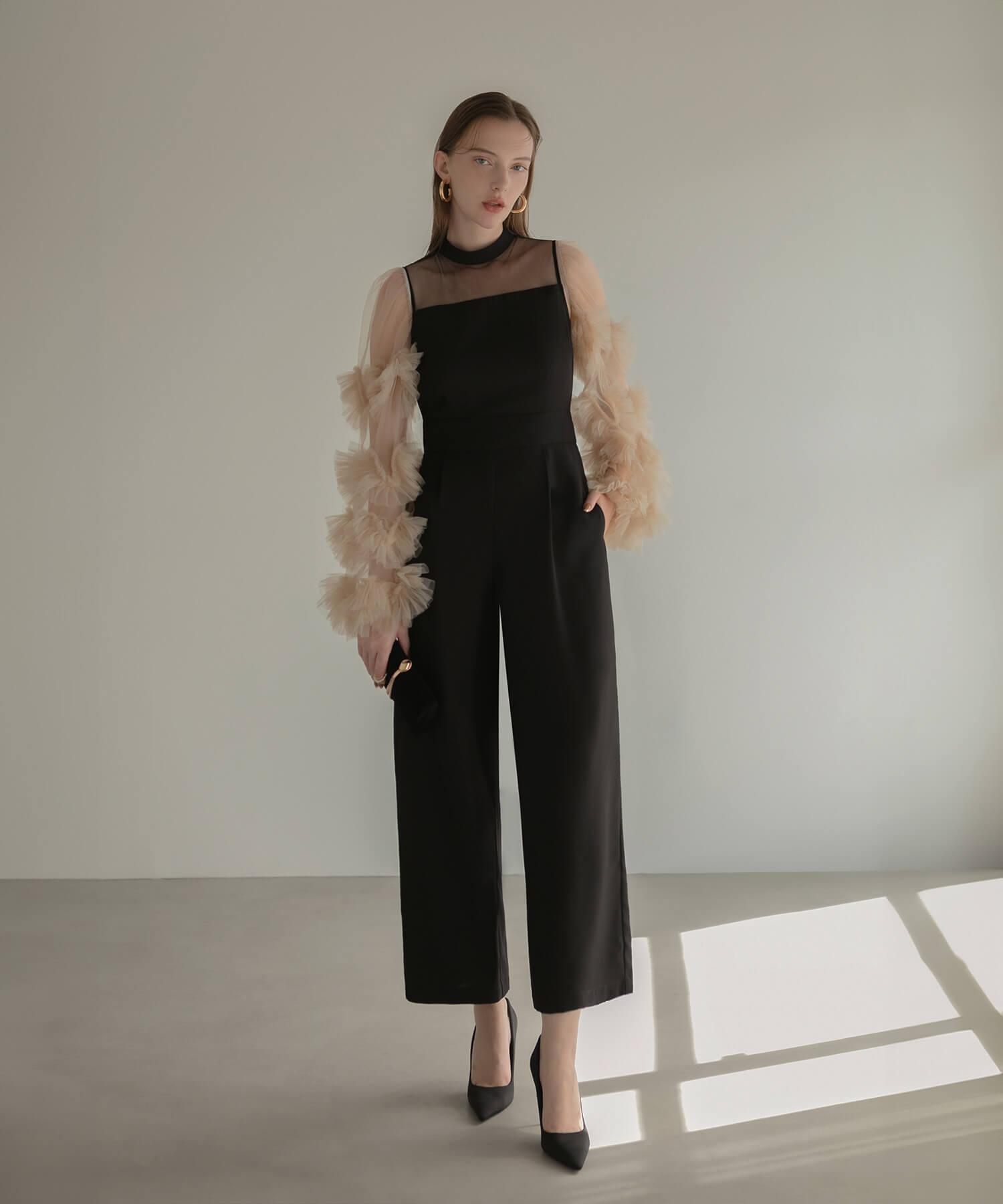 [Some items will be shipped the same day] Volume tulle sleeve all-in-one pants dress