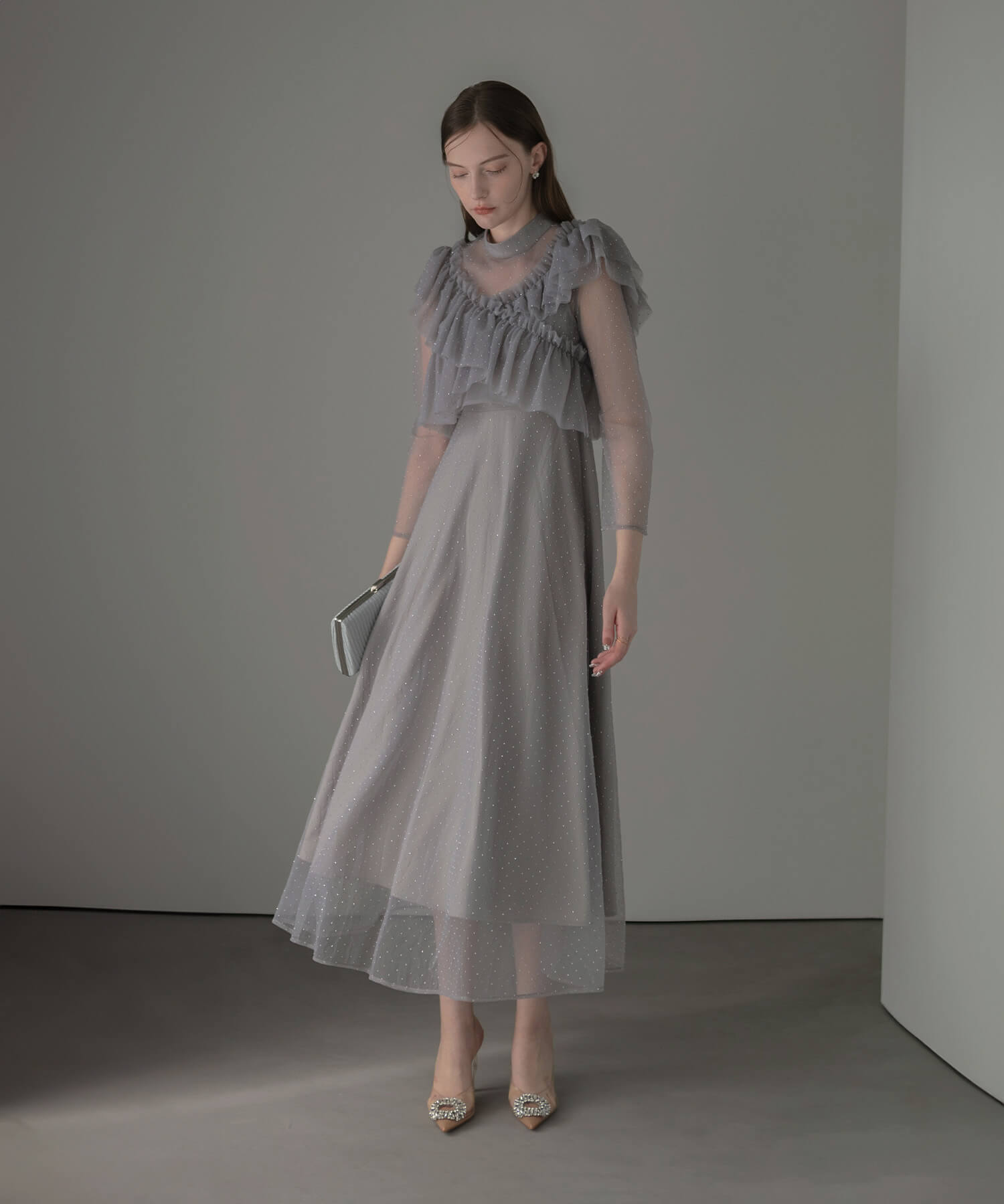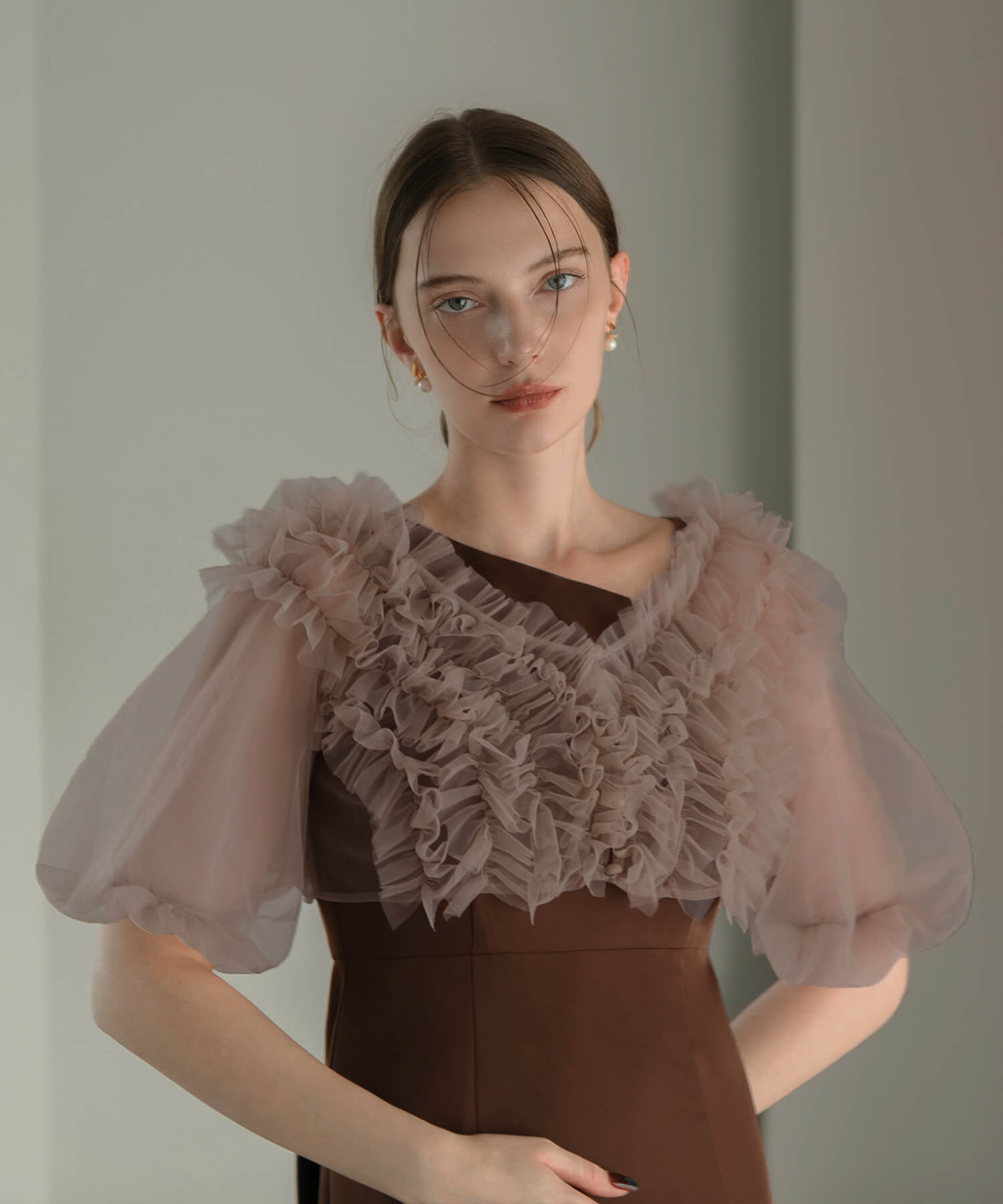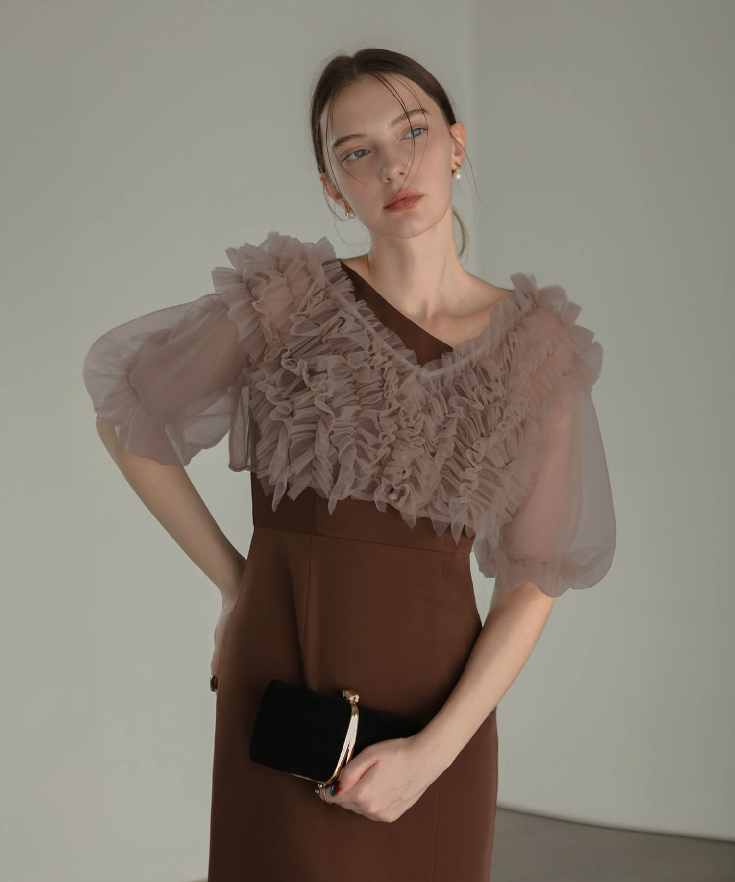 [Some items will be shipped the same day] Volume tulle sleeve all-in-one pants dress