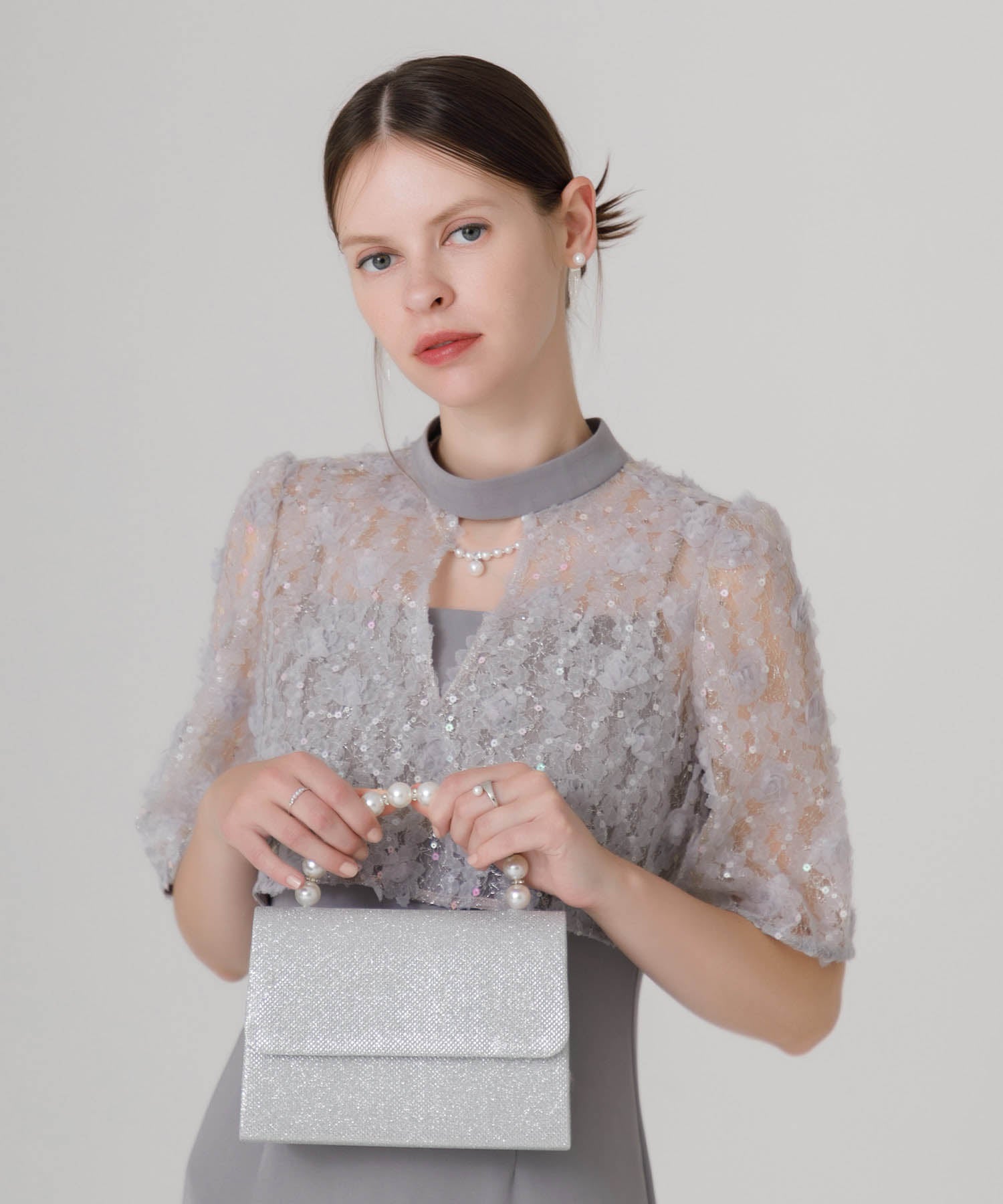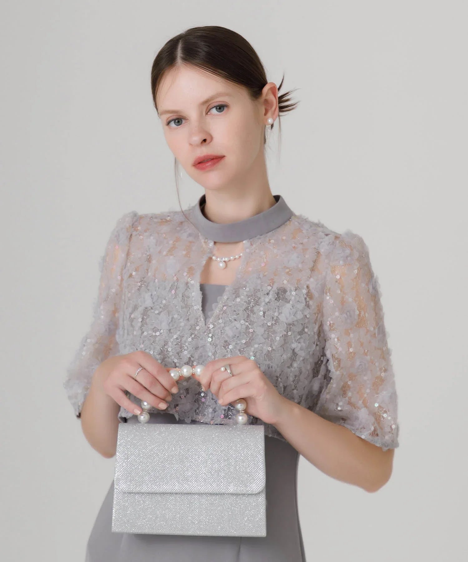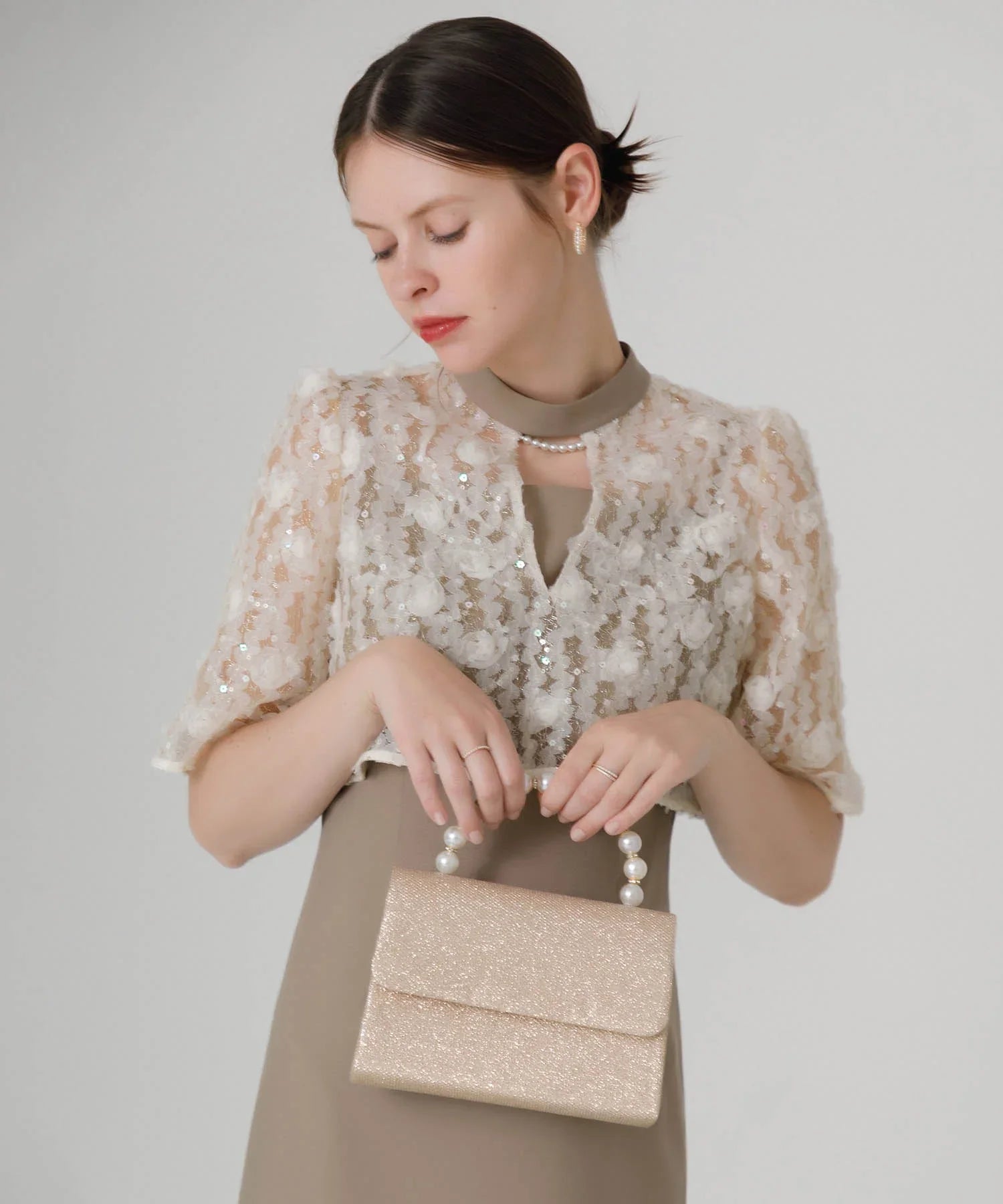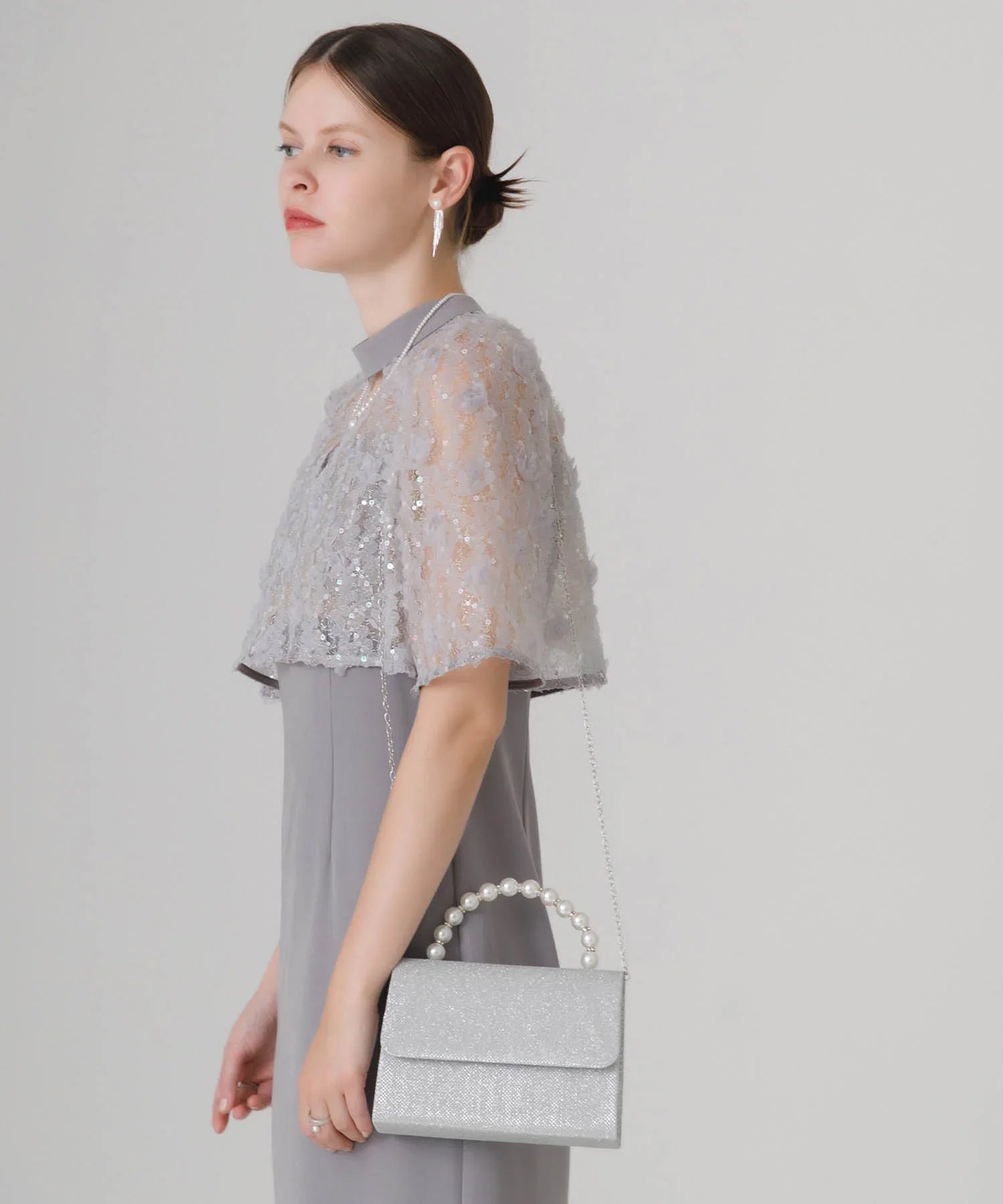 上質感のあるラメ素材にパールハンドルを組み合わせ、シーンを問わず品よく華やかな存在感を放ちます。