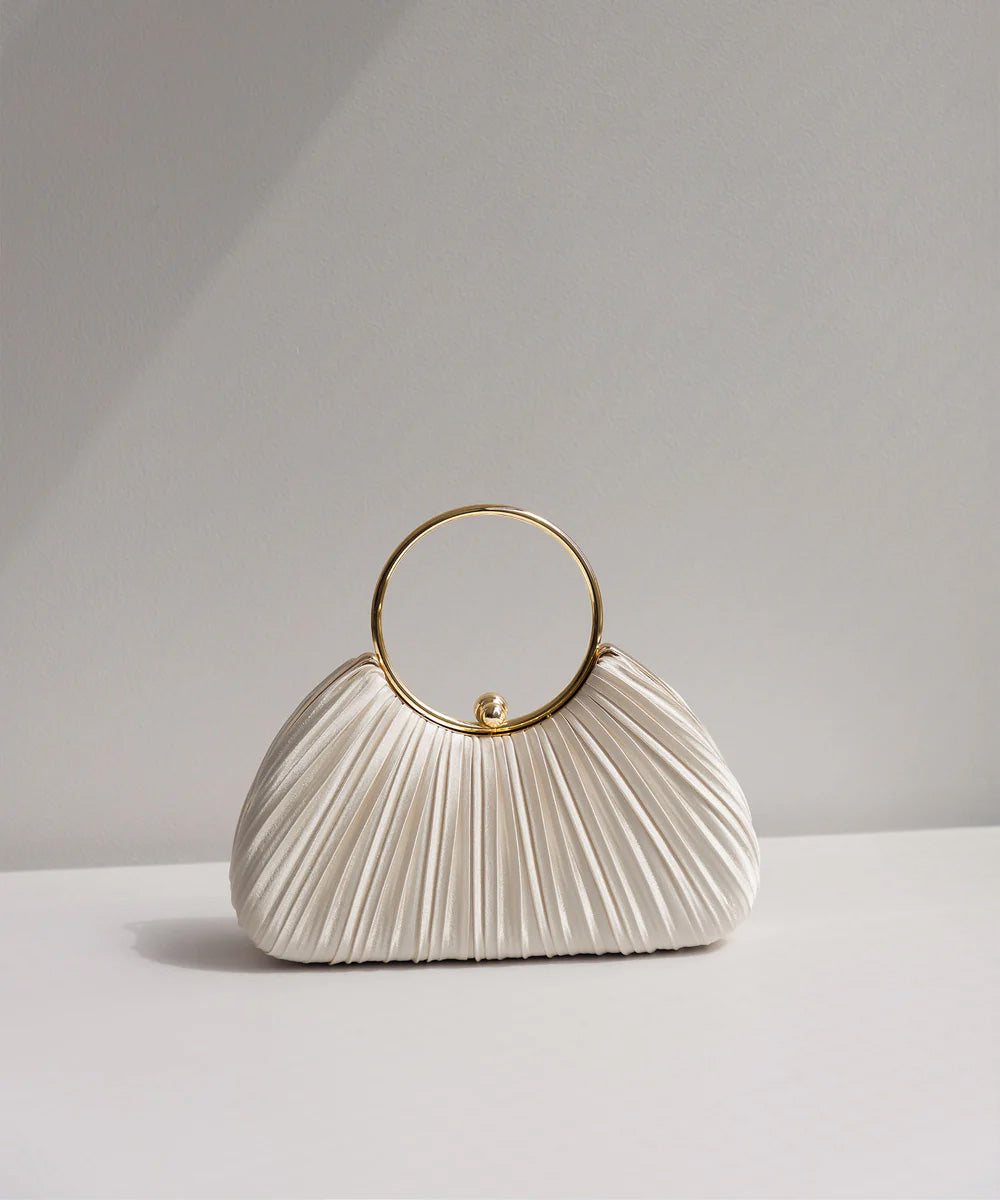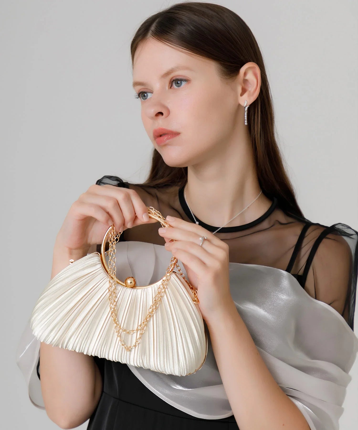 優雅なプリーツデザインと、ゴールドのリングハンドルが上品なアクセントとなる2WAYバッグ。