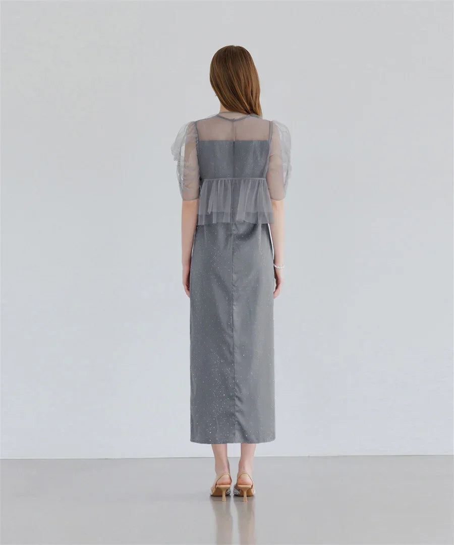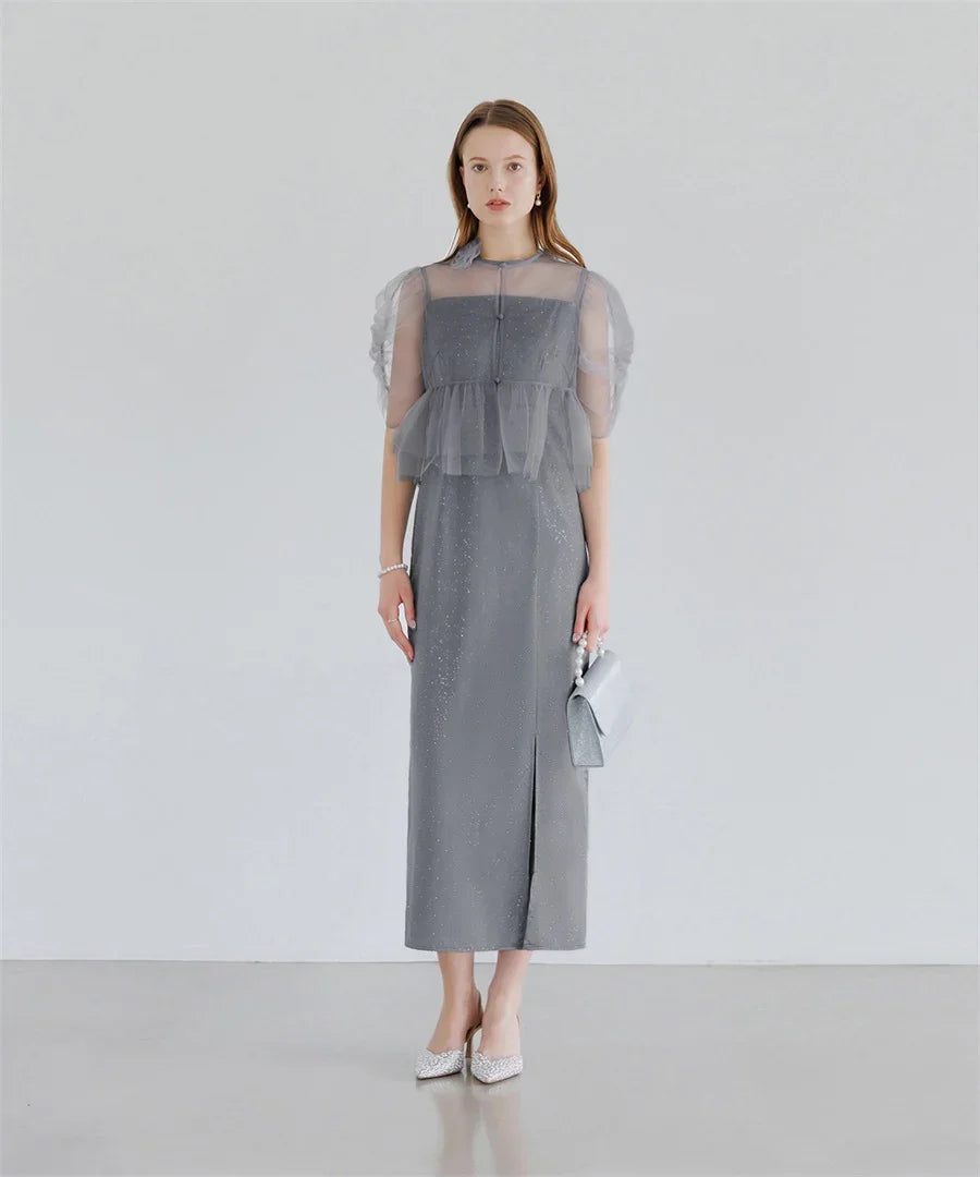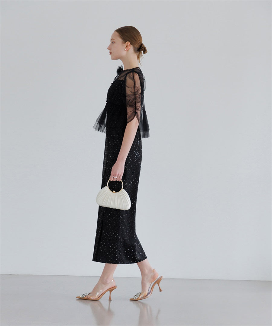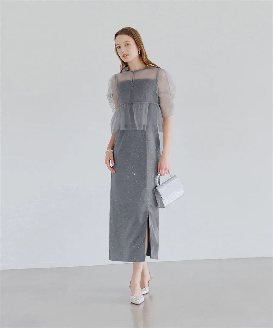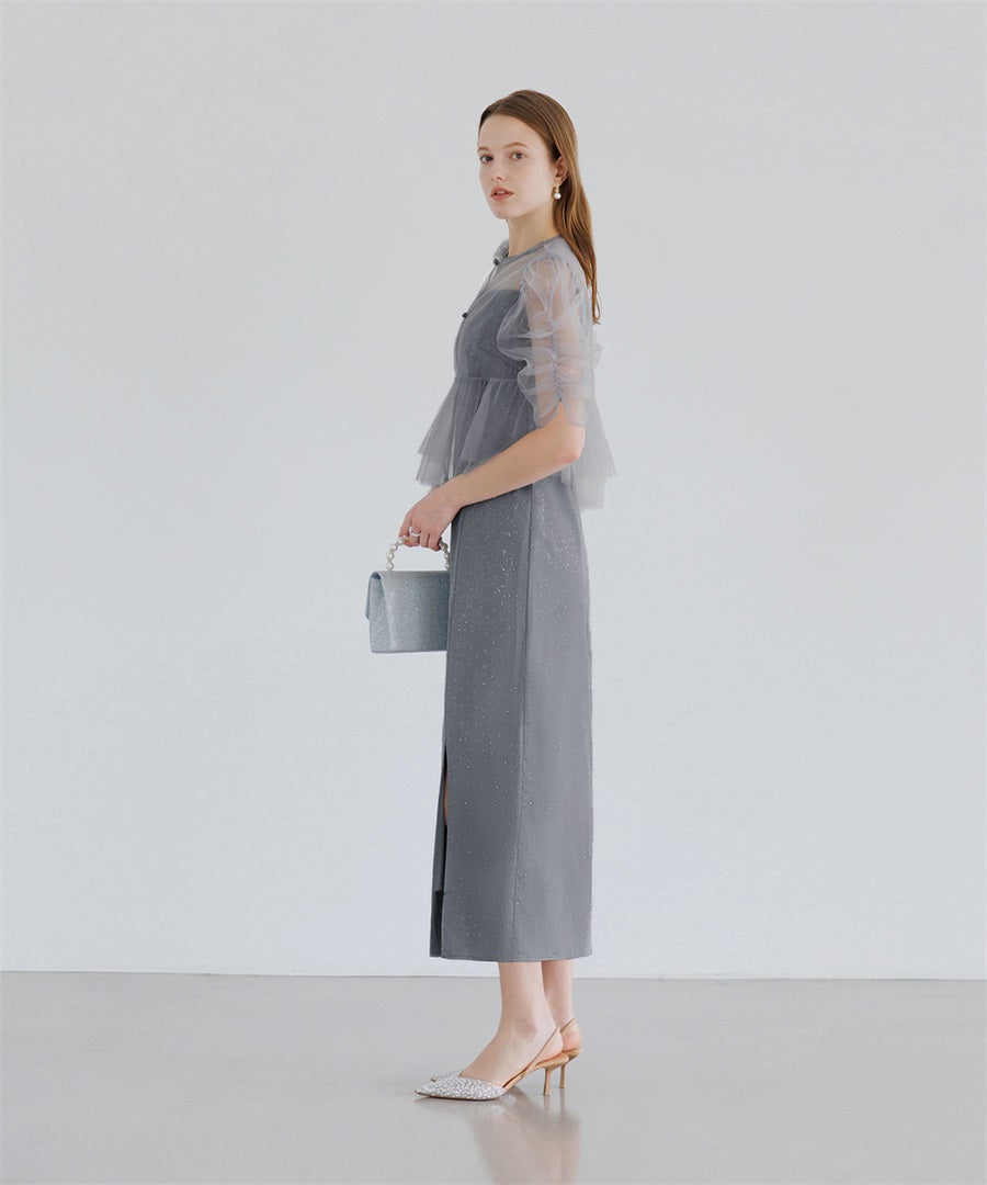 シアーなチュールに繊細なラメドットを散りばめたデザインが、フェミニンさとモード感を絶妙に融合。胸元には小さなフラワーモチーフをあしらい、さりげないアクセントとして華やぎを添えています。ワンピースはすっきりと仕上げたIラインシルエットで、甘さを抑えつつ大人の洗練された印象をキープ。胸元からふんわり広がるチュールペプラムがウエスト位置を高く見せ、自然なスタイルアップを叶えます。ボレロはエアリーなボリュームスリーブが特徴で、動くたびに優雅さが漂う華やかなシルエットに仕上がります。ワンピースとボレロはそれぞれ単品でも着用でき、コーデの幅を広げてくれる2点セットです。