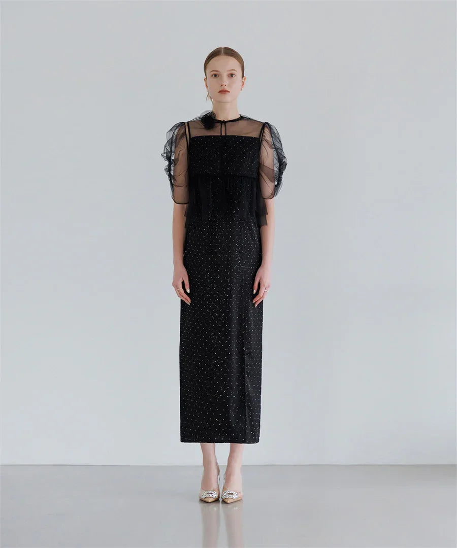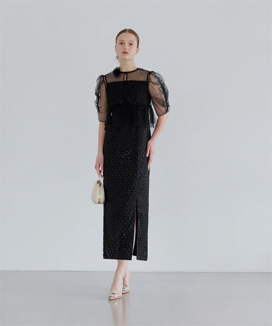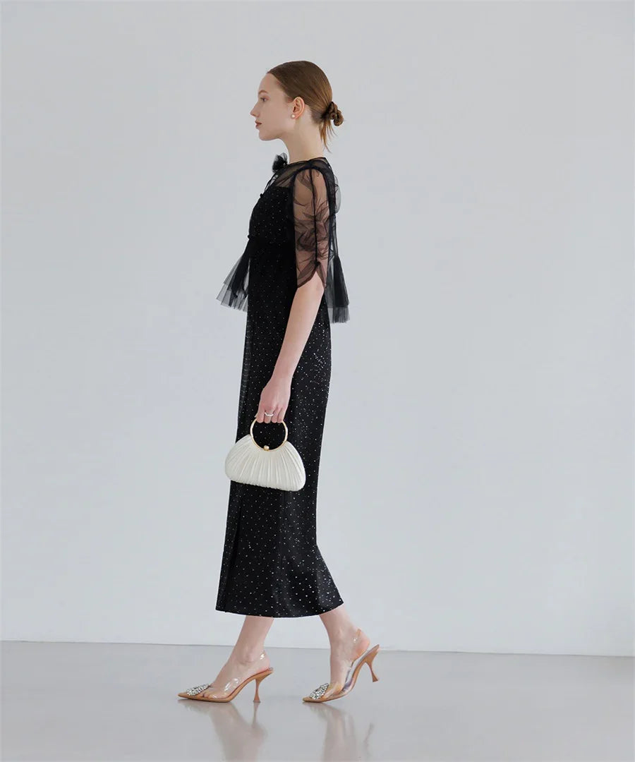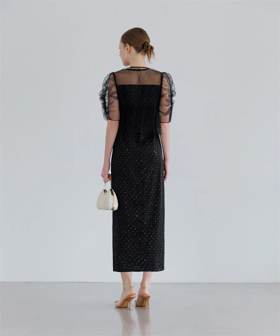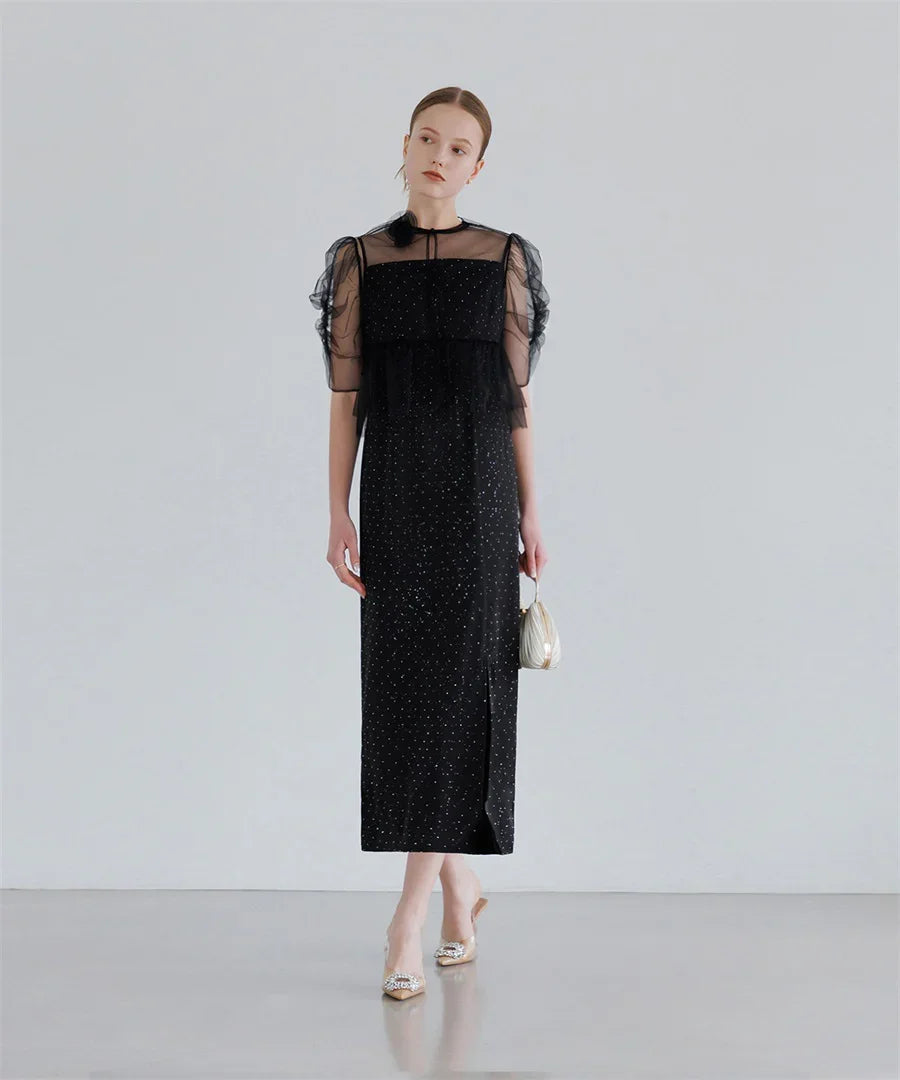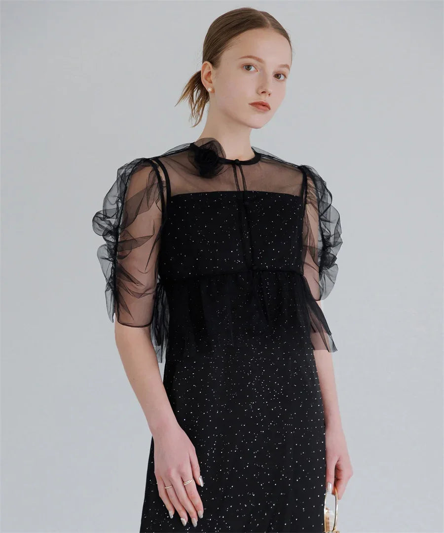 華やかなチュール袖と繊細なラメドットが目を惹く、上品でモードなブラックドレス。