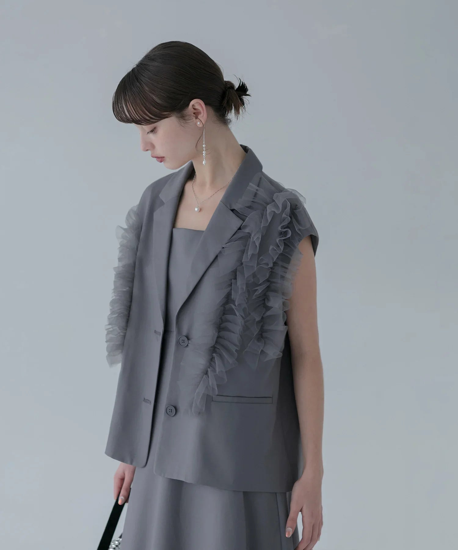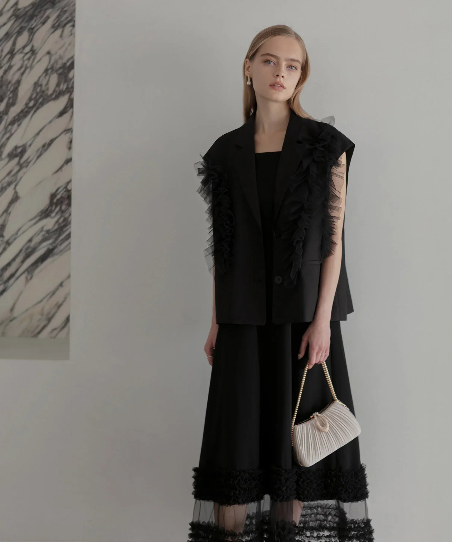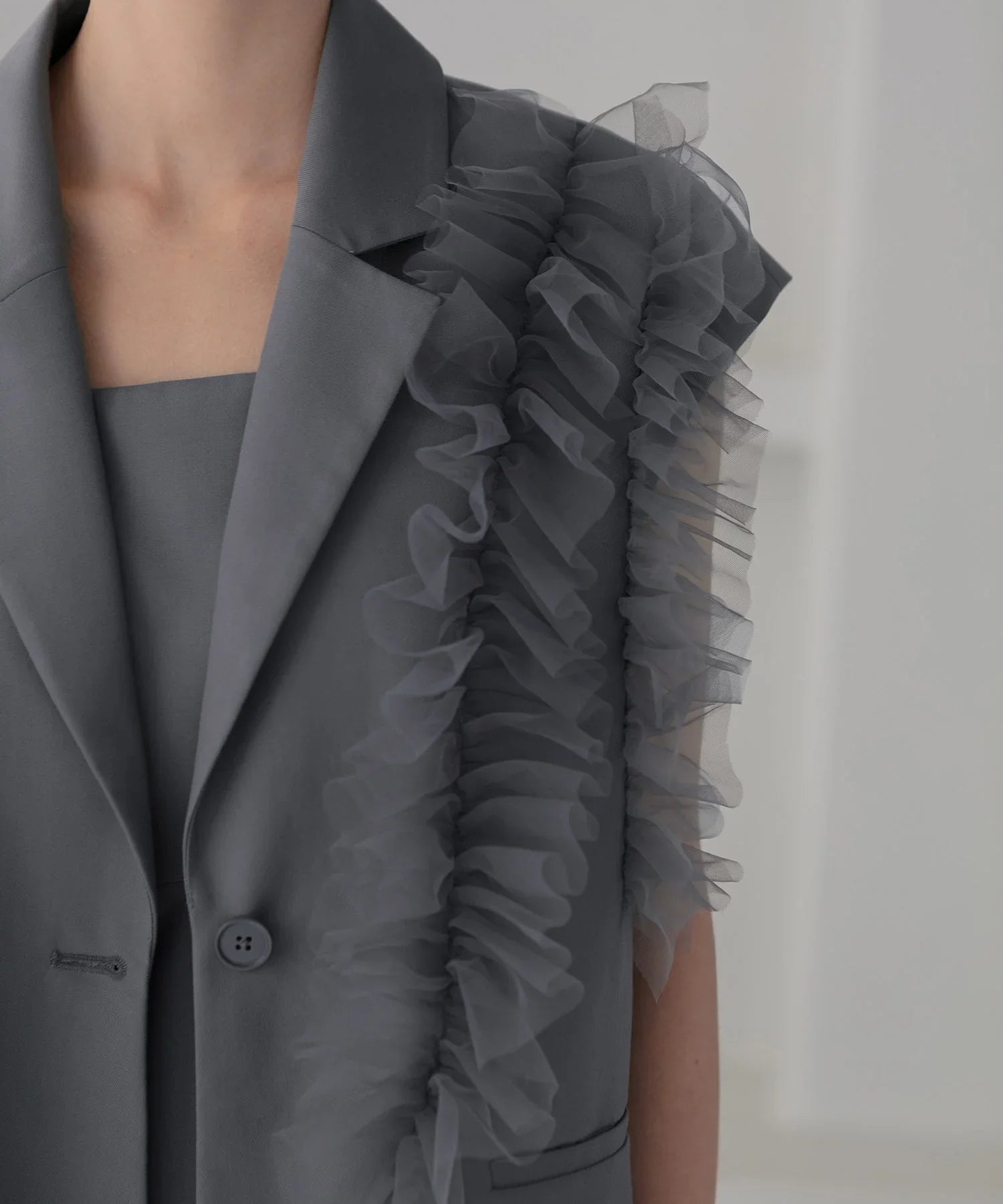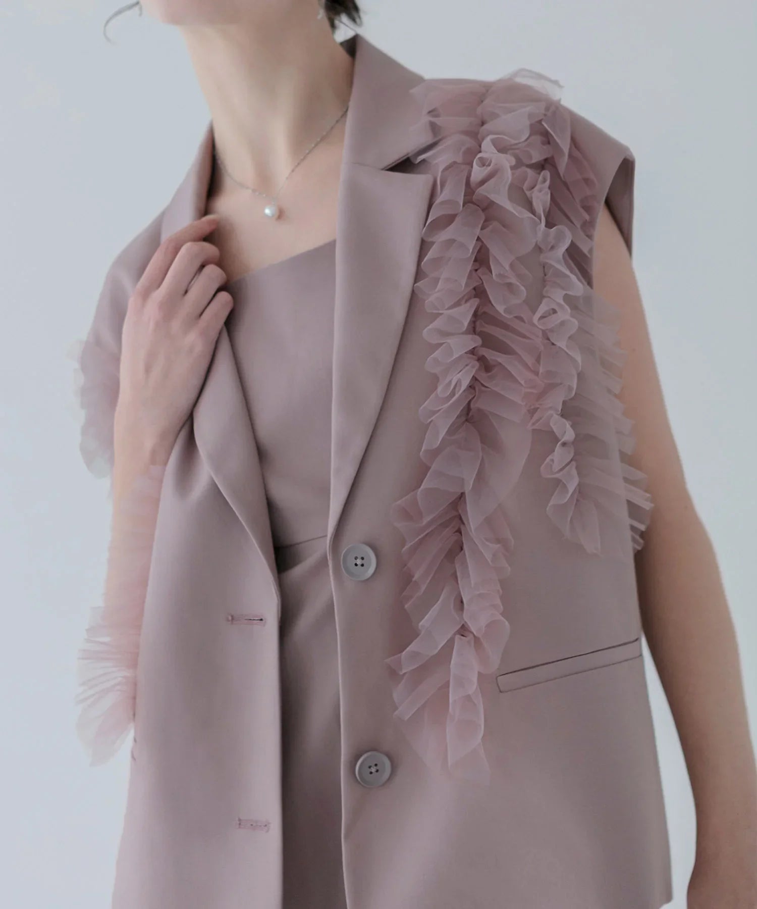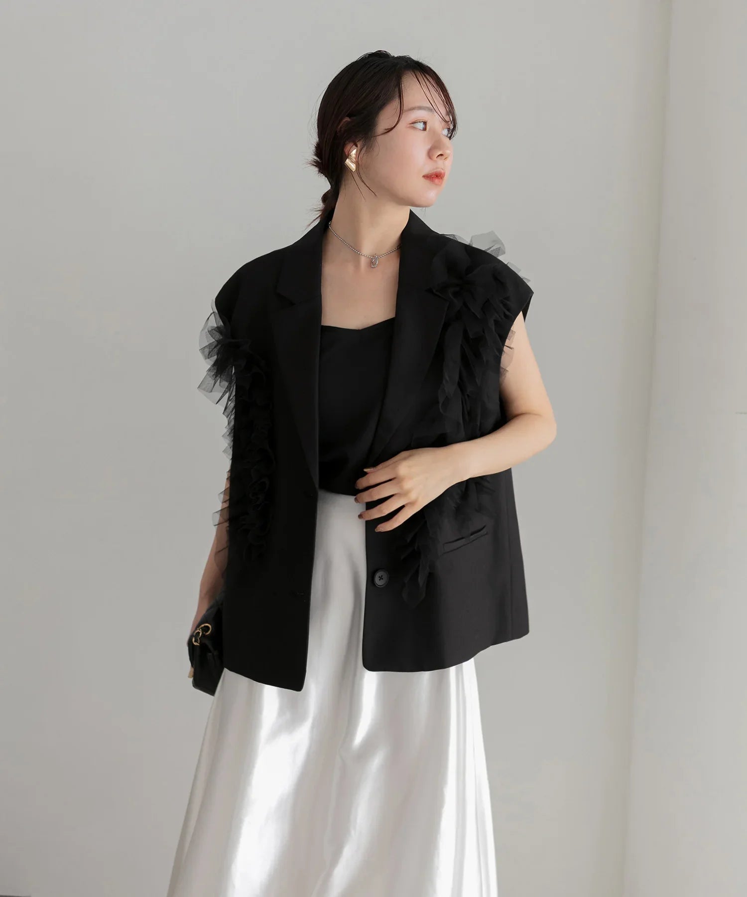 立体的なチュールフリルをあしらったジレと、