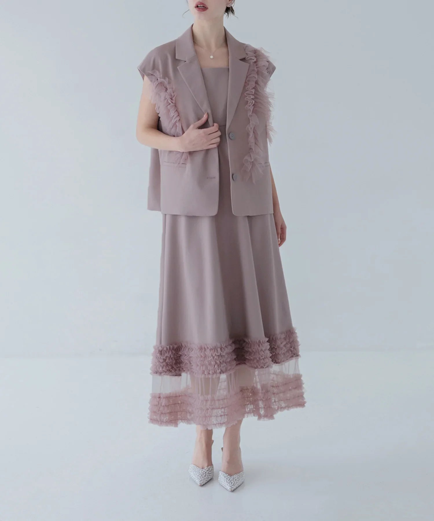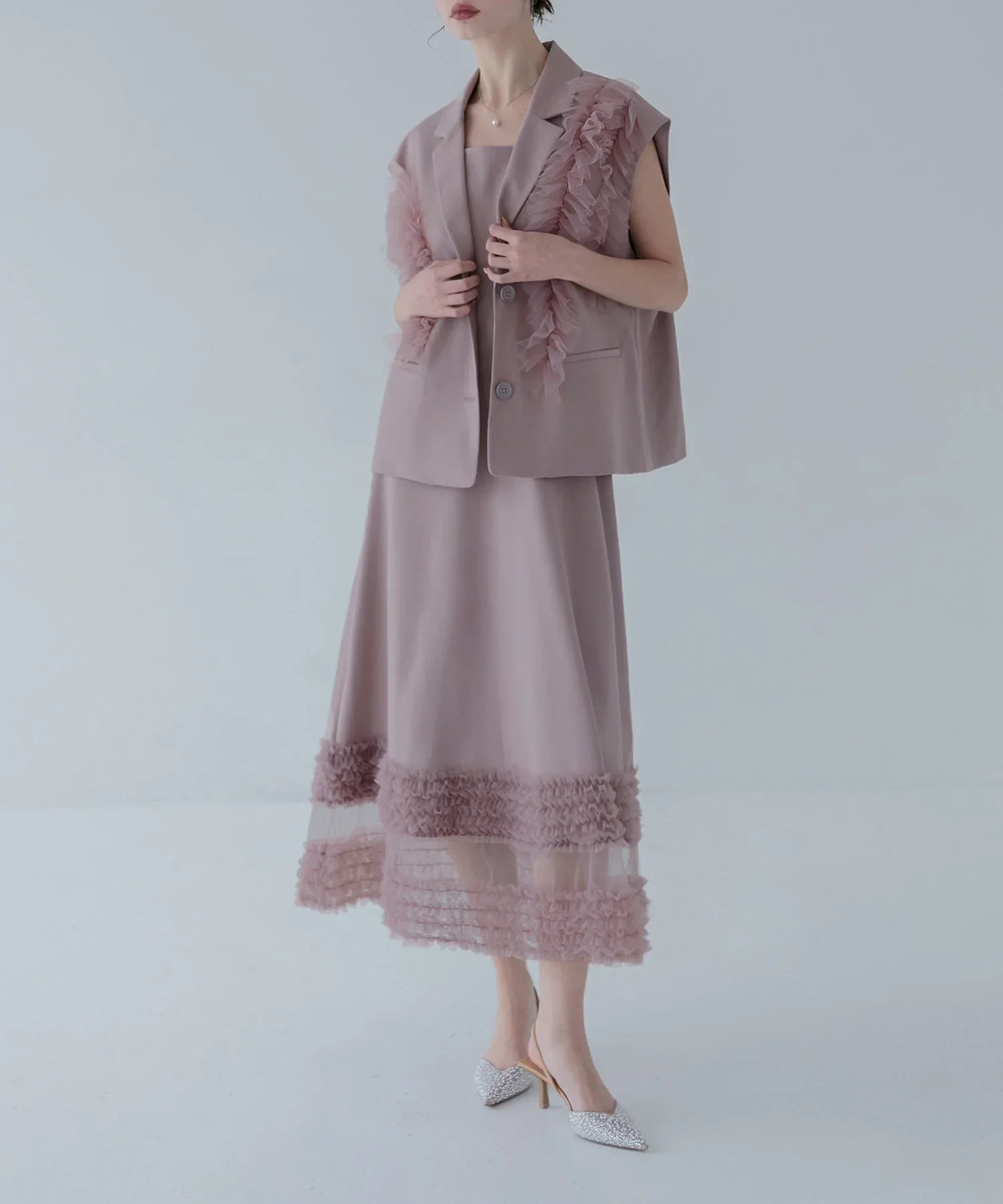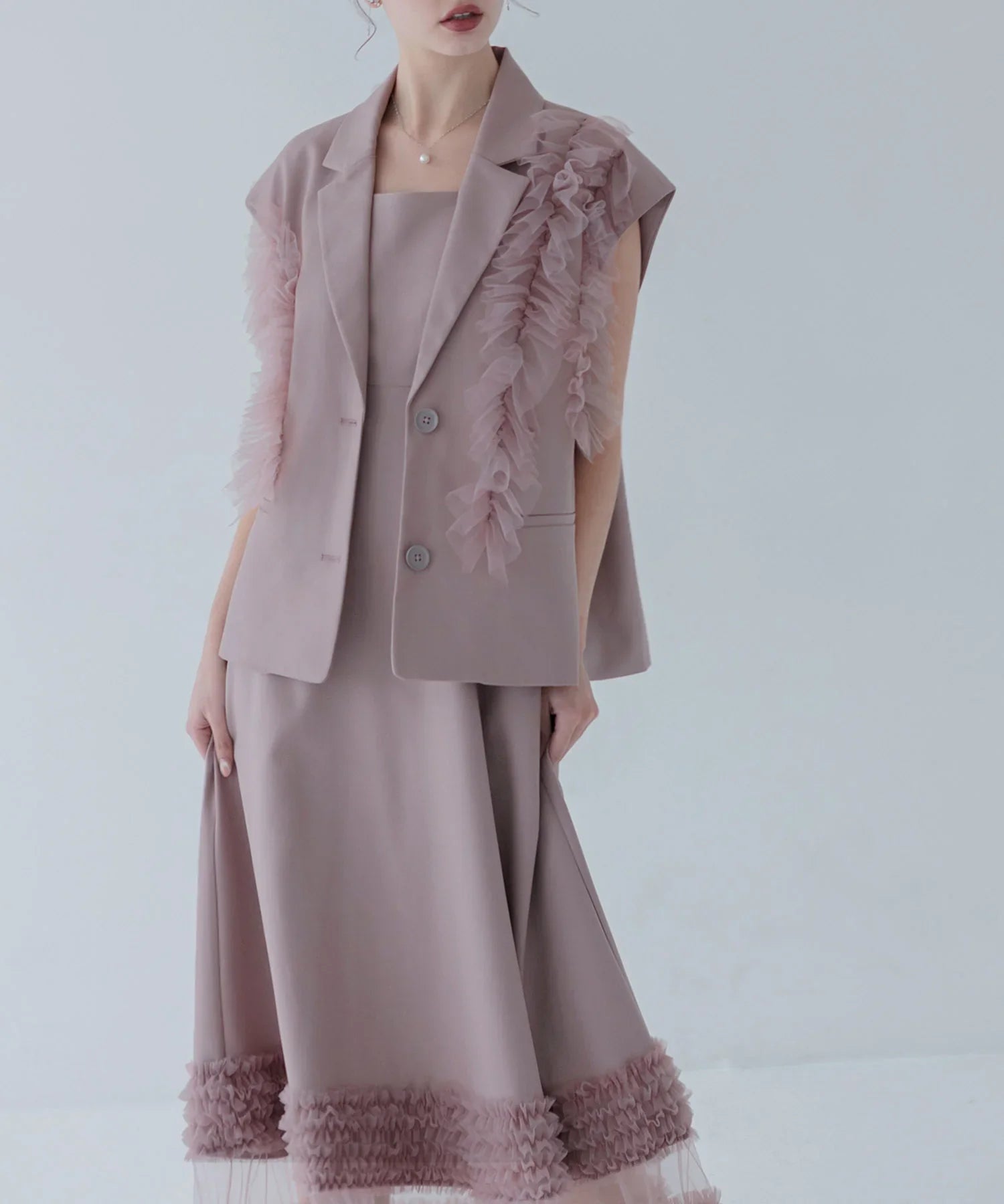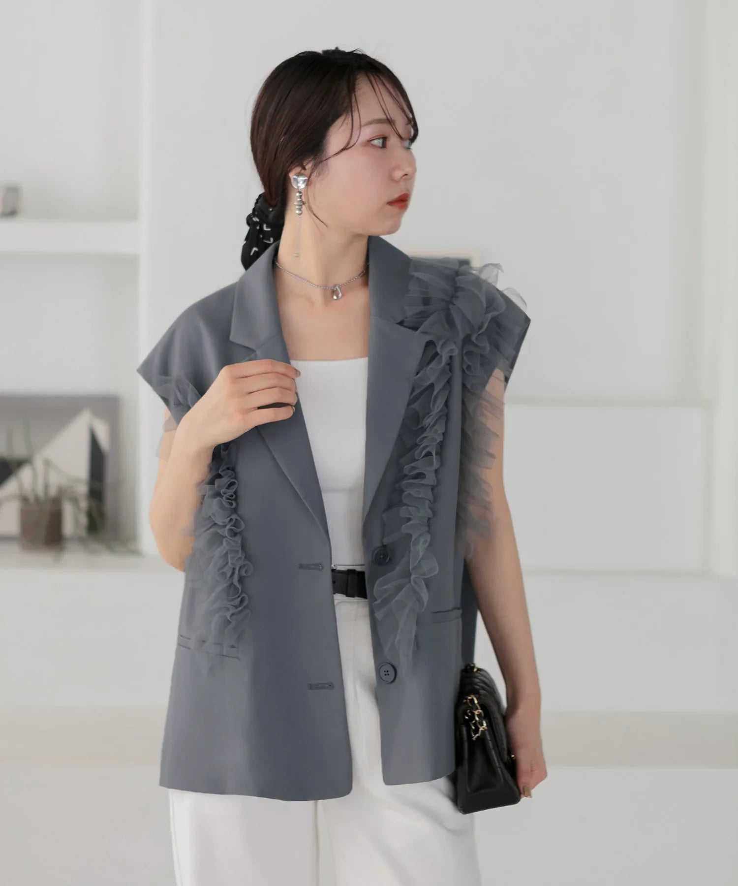立体的なチュールフリルをあしらったジレと、