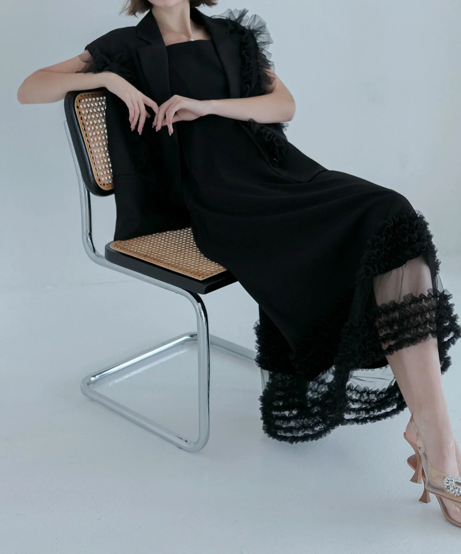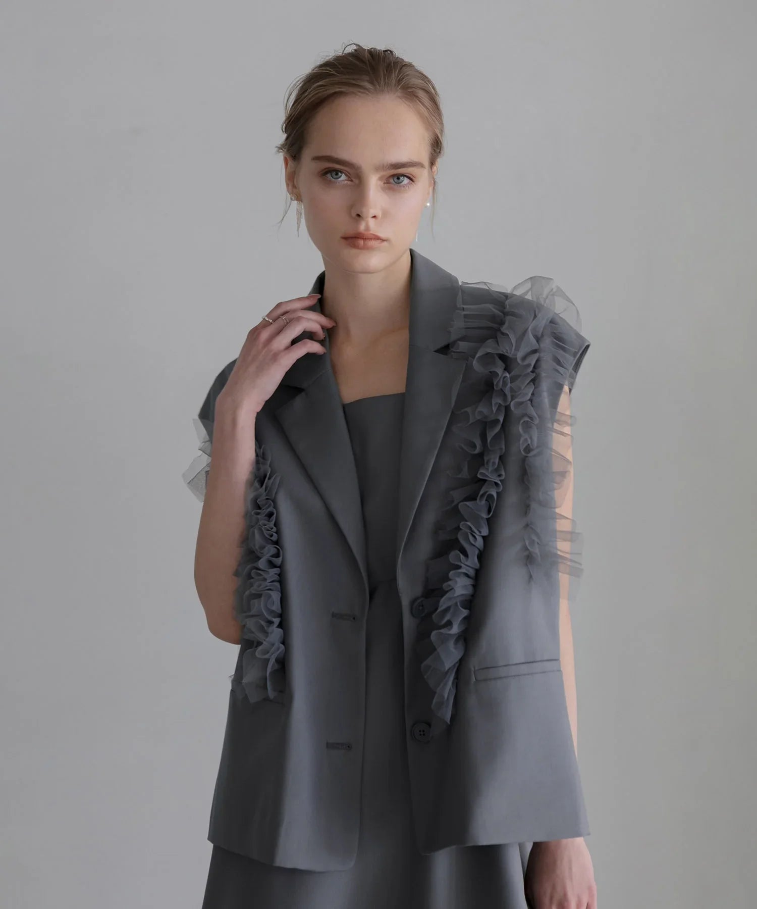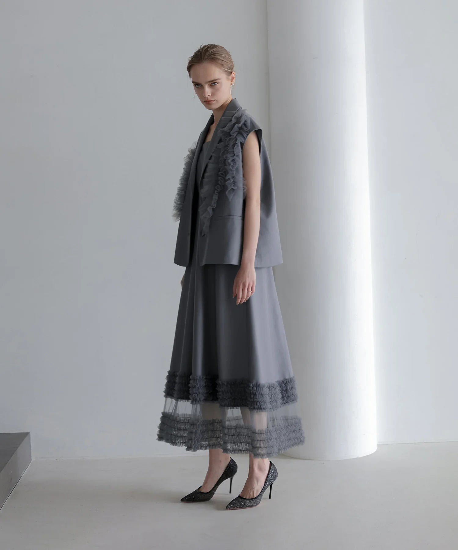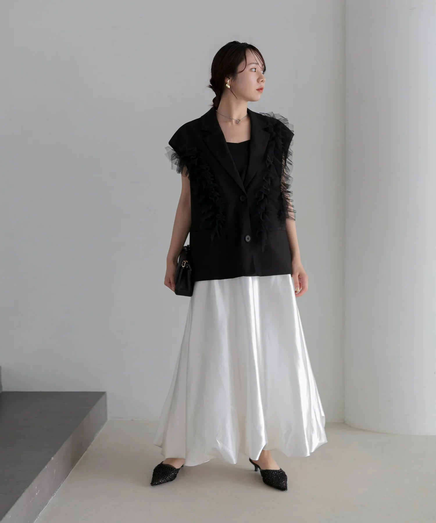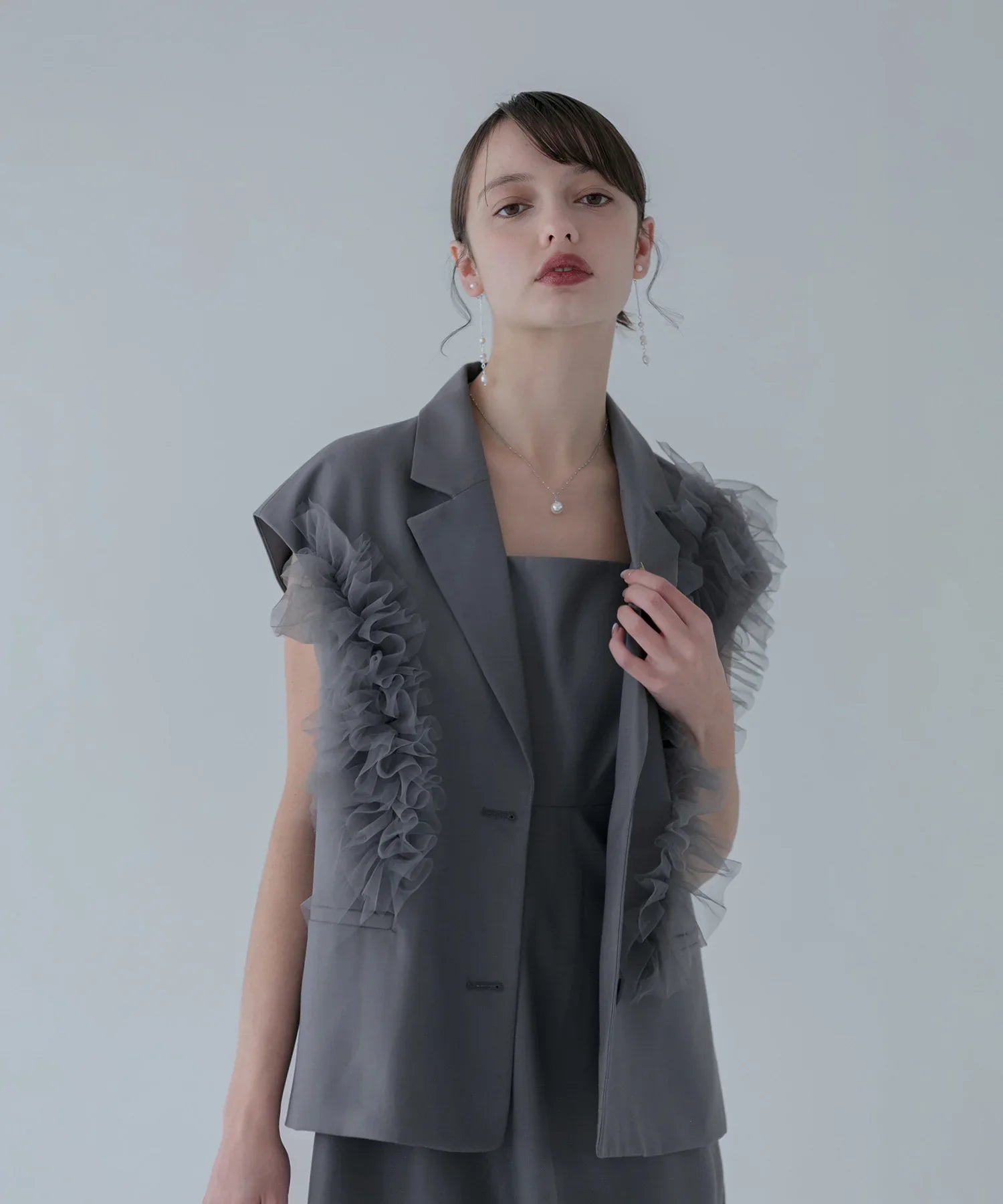 立体的なチュールフリルをあしらったジレと、