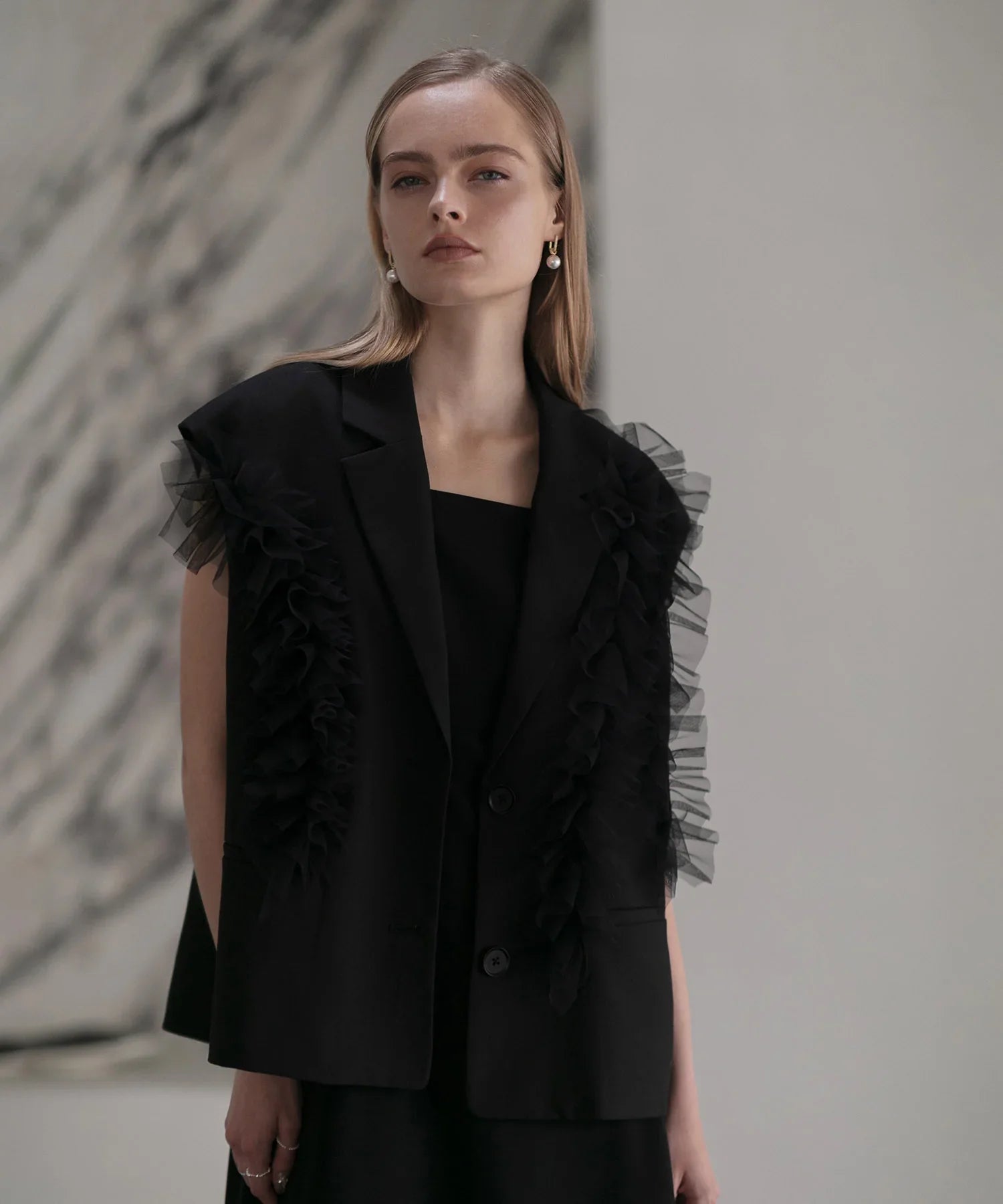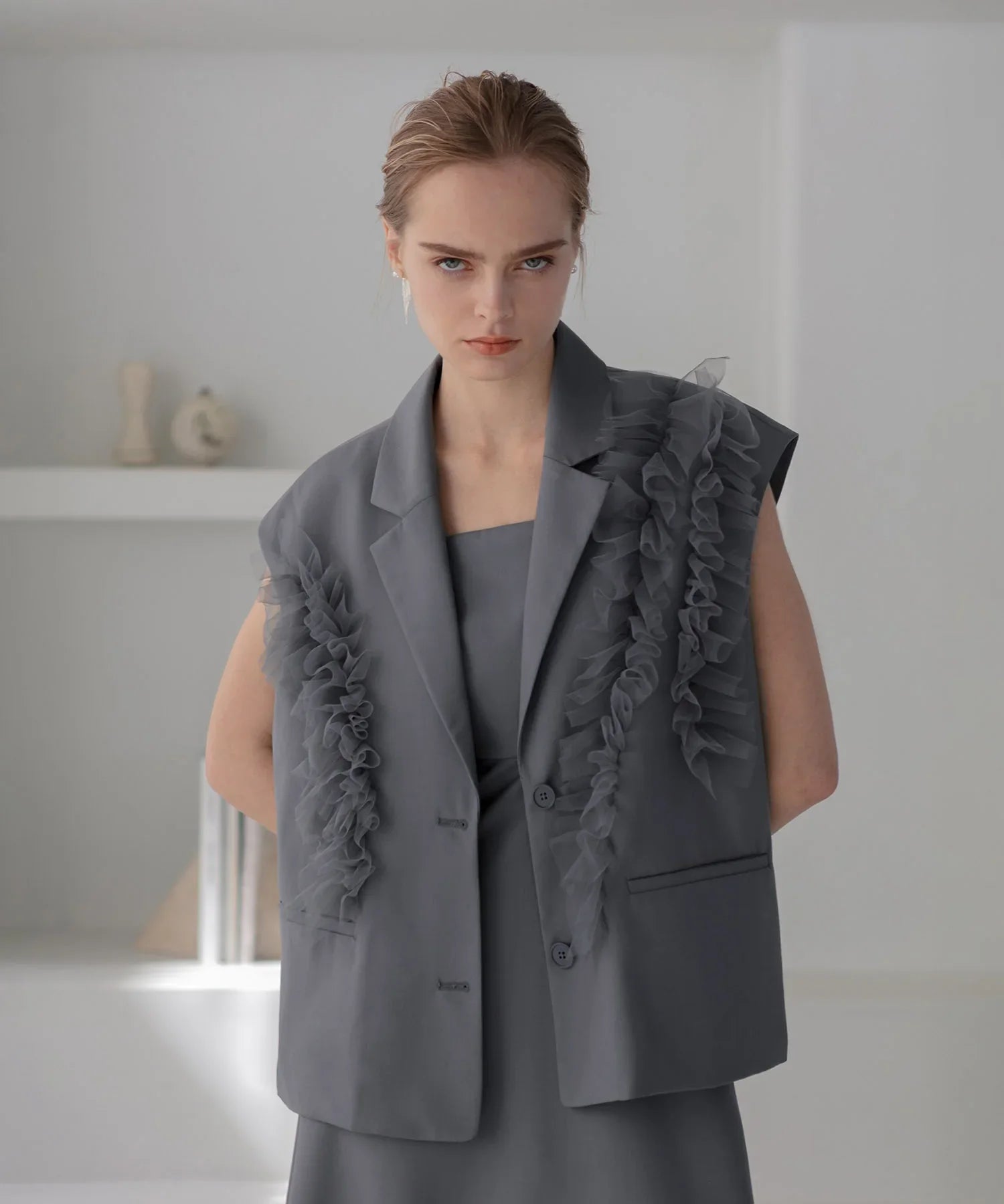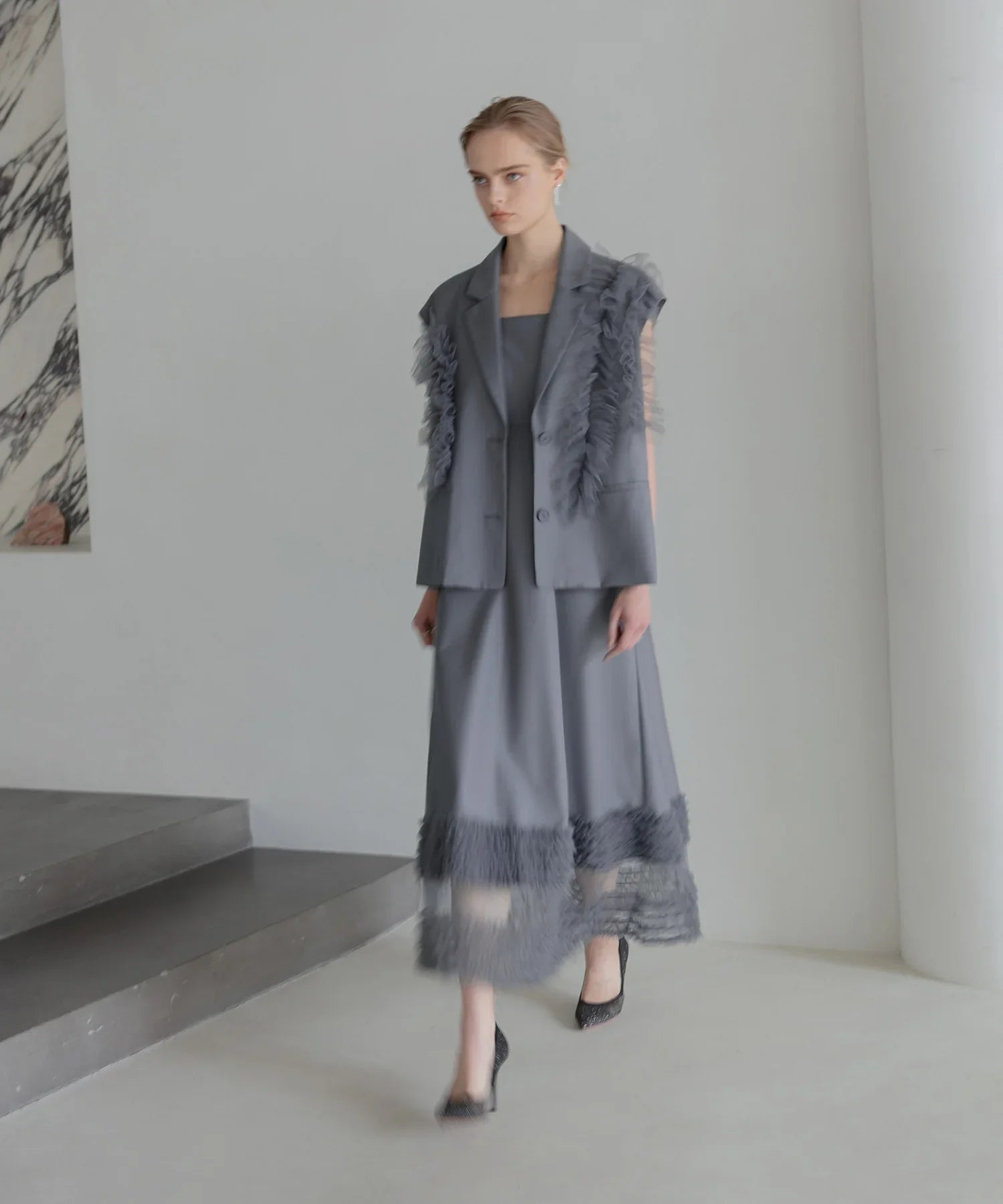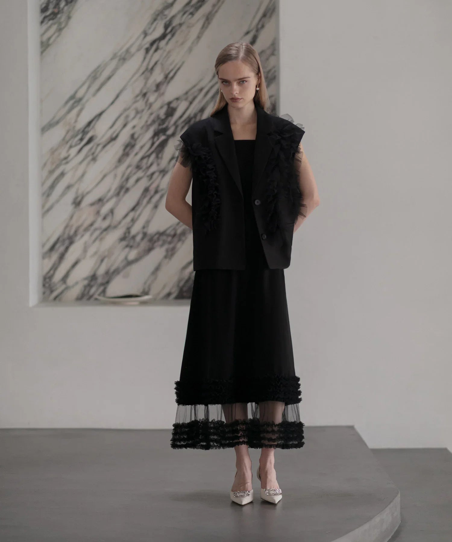 立体的なチュールフリルをあしらったジレと、