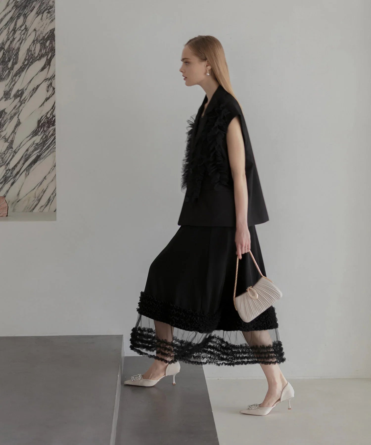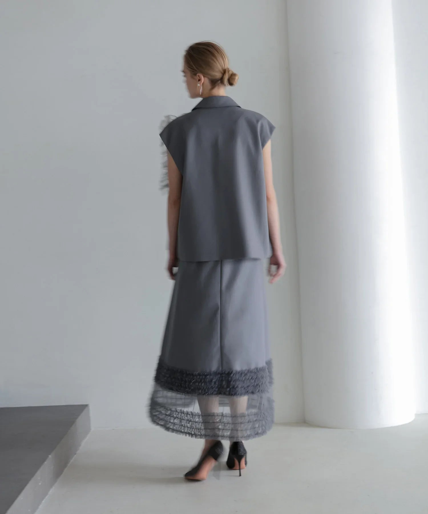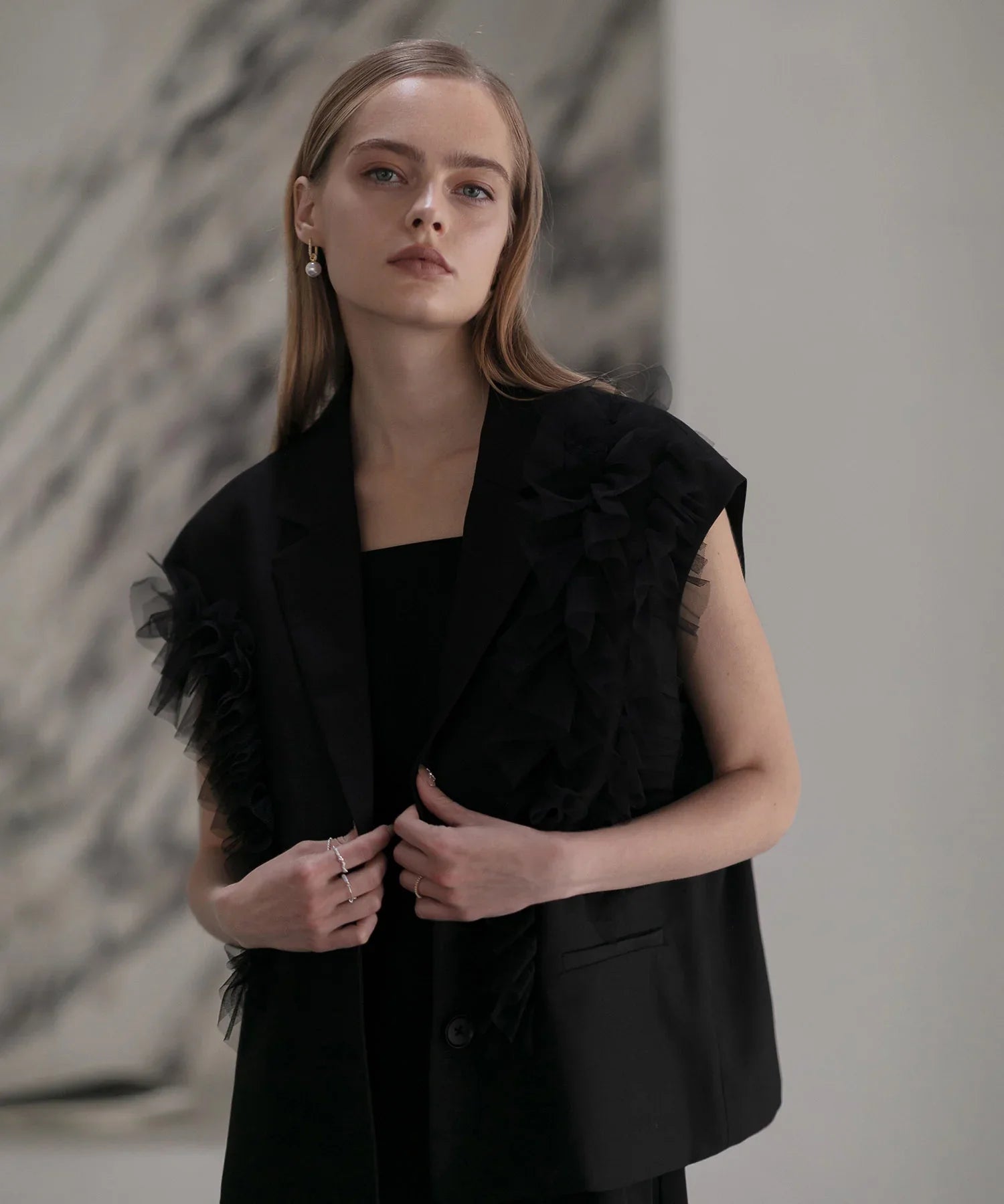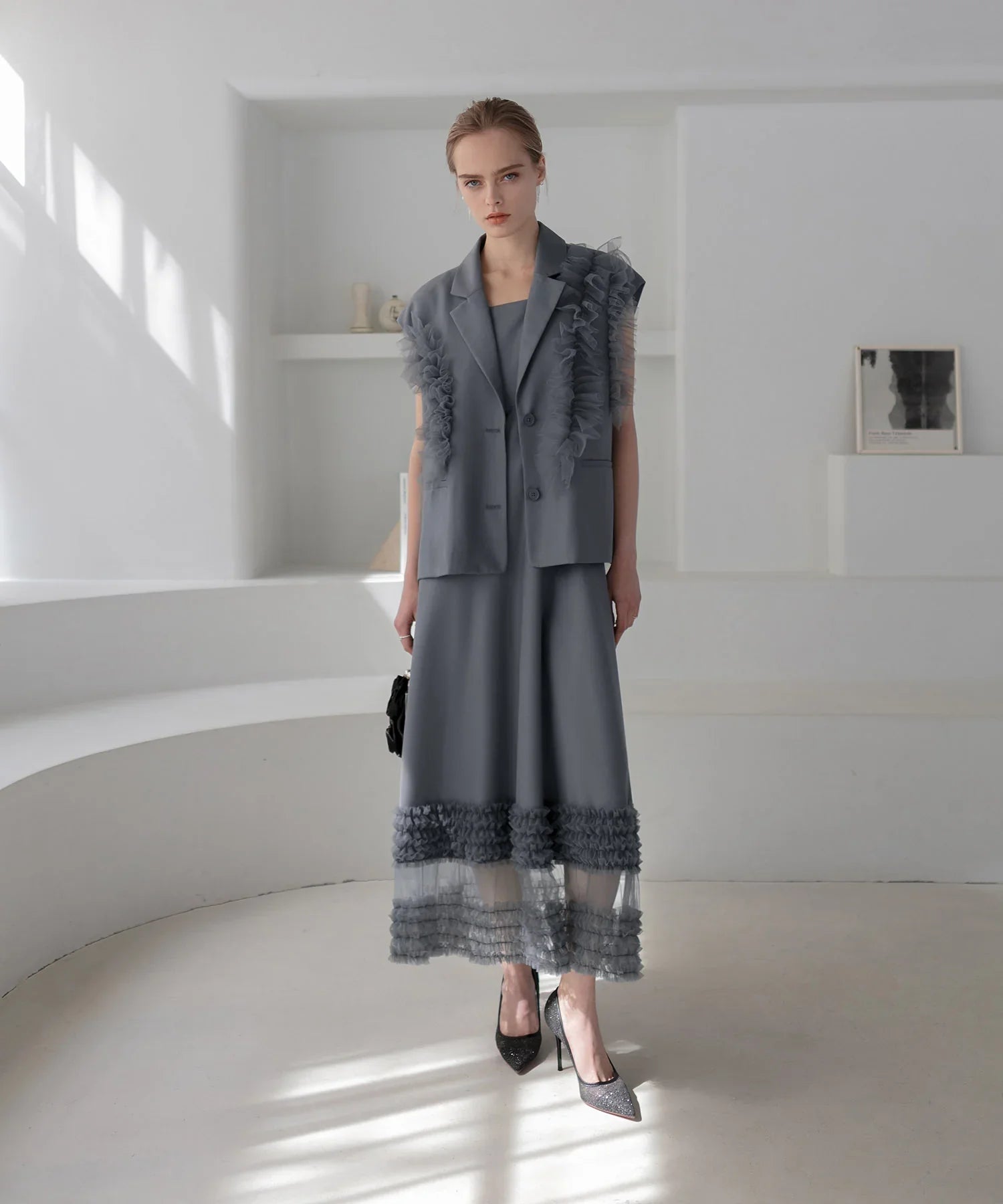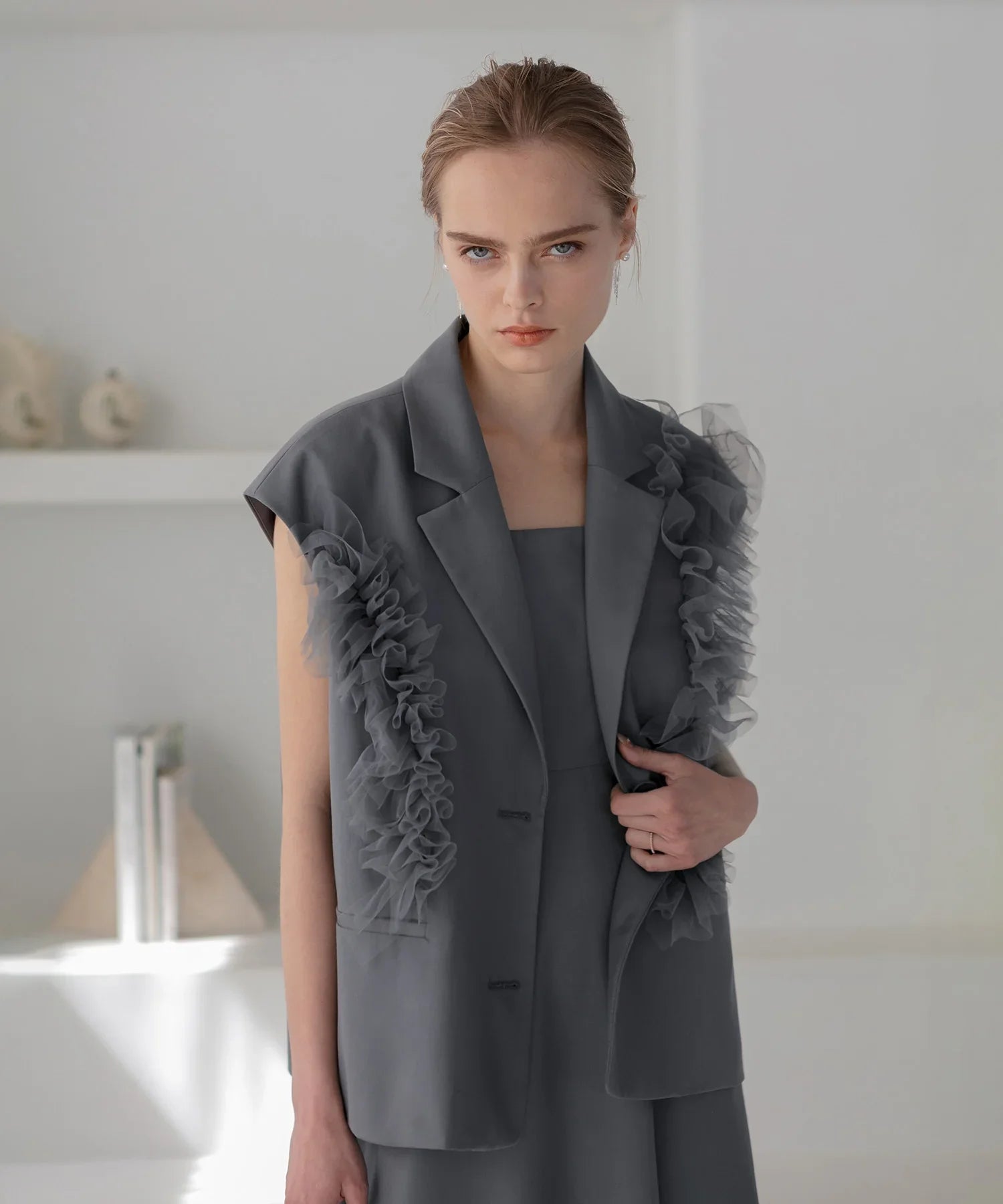 立体的なチュールフリルをあしらったジレと、