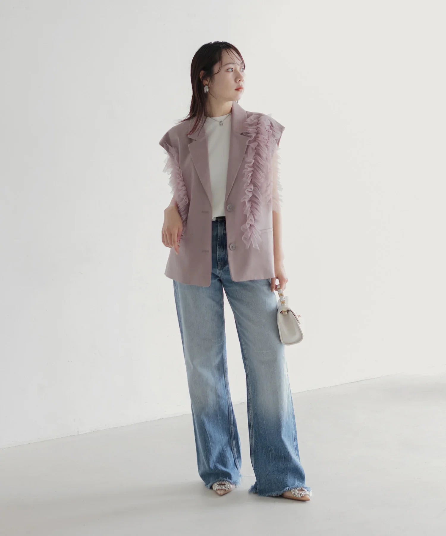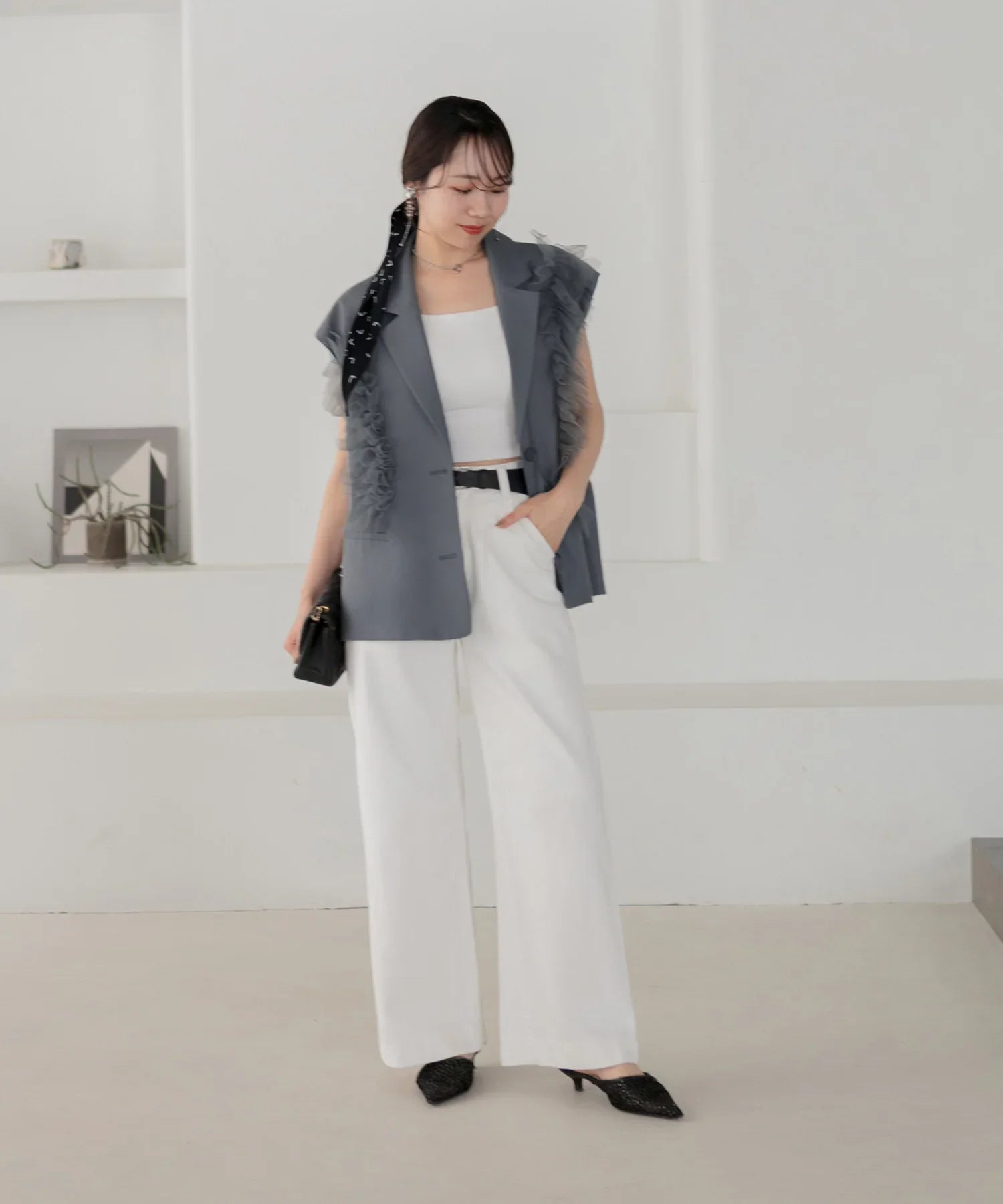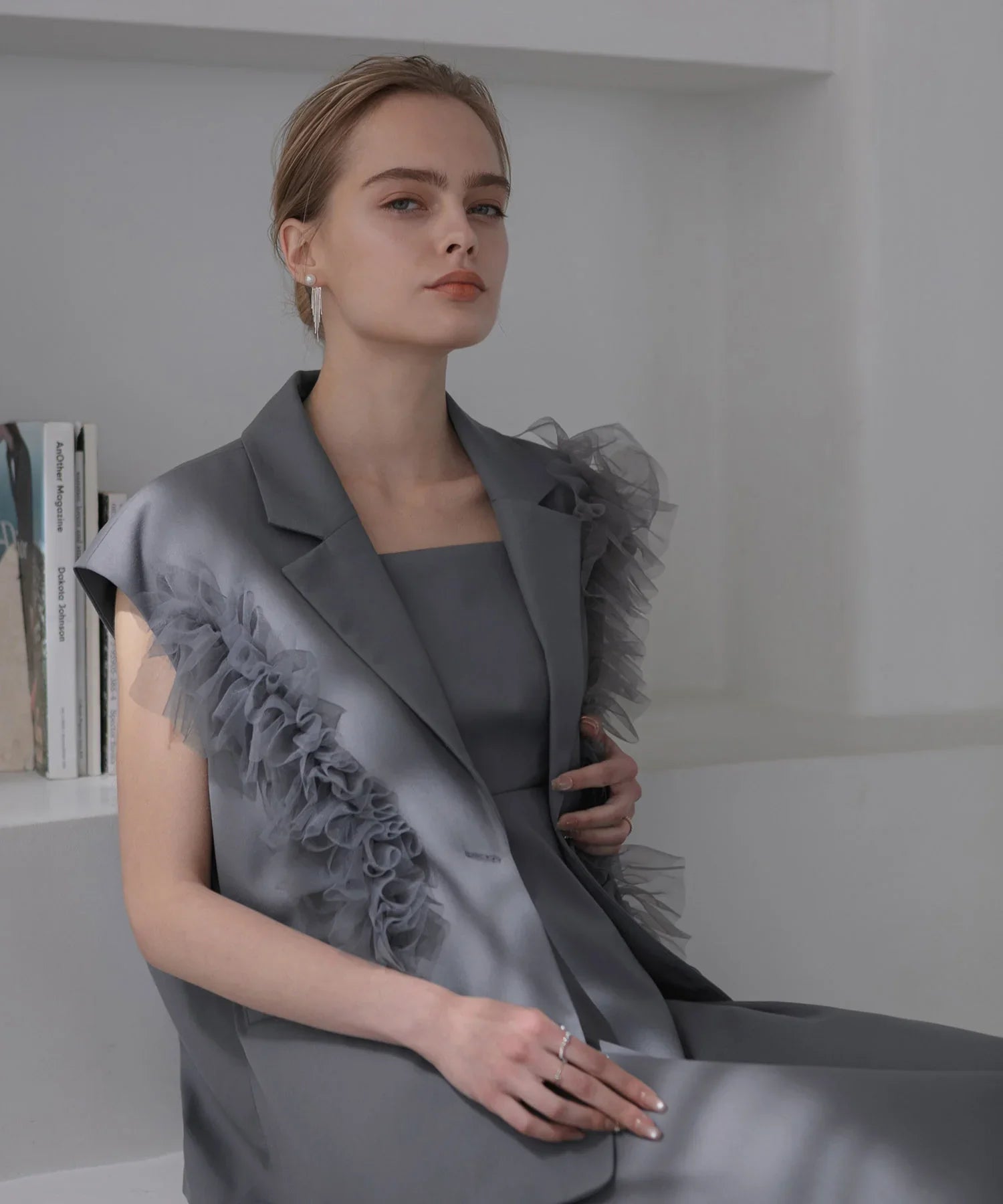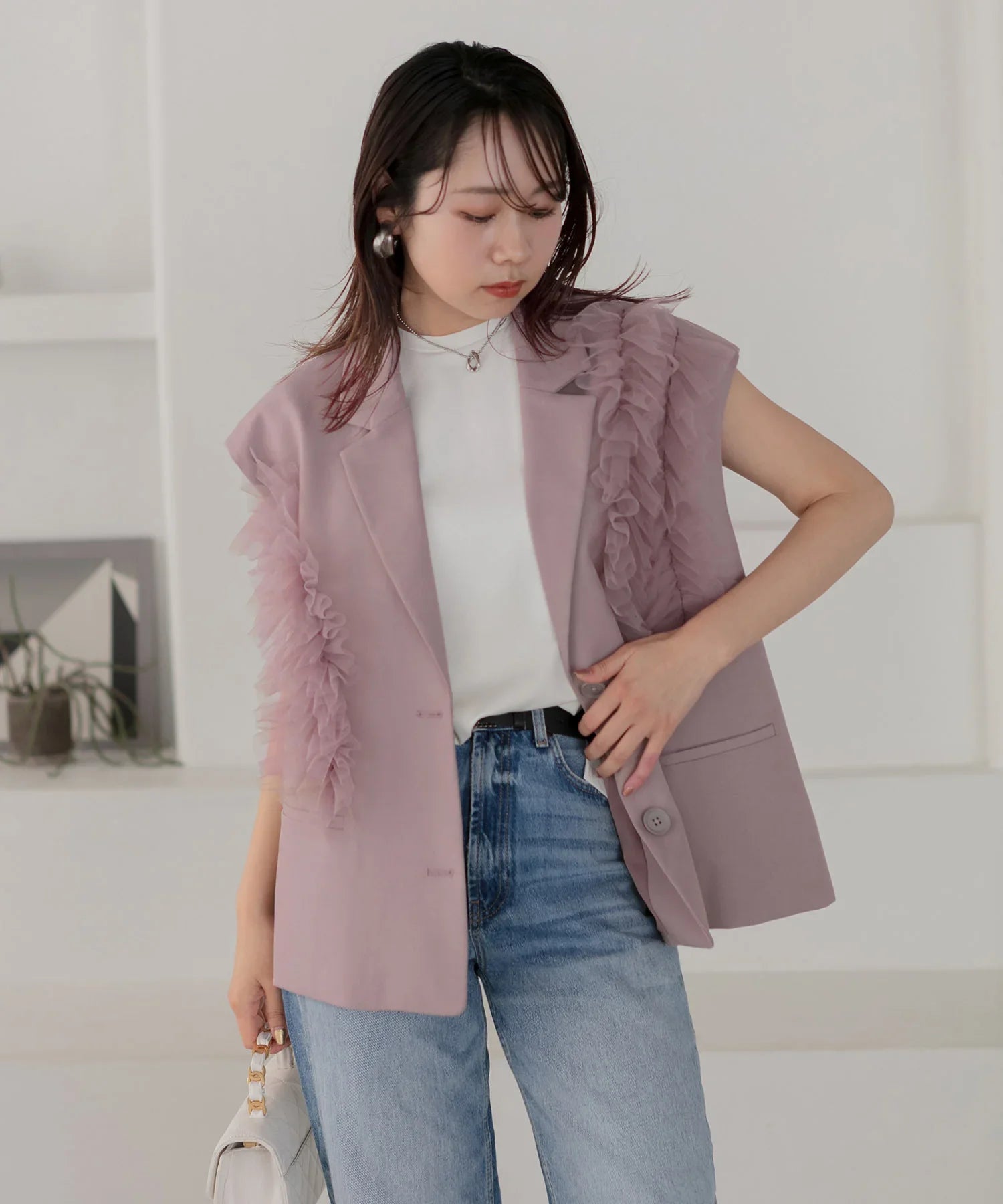 立体的なチュールフリルをあしらったジレと、