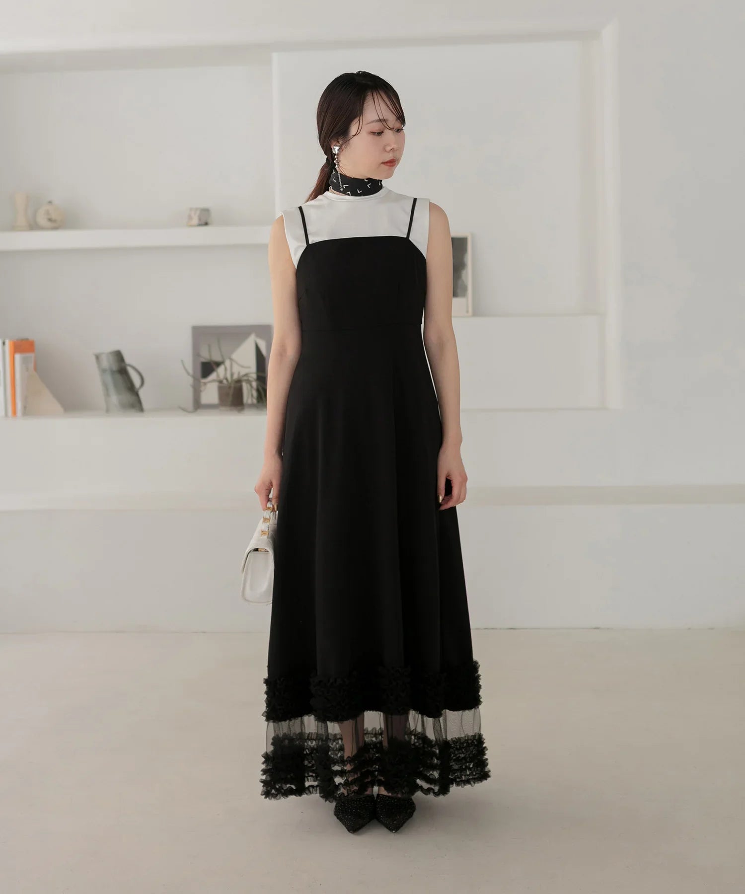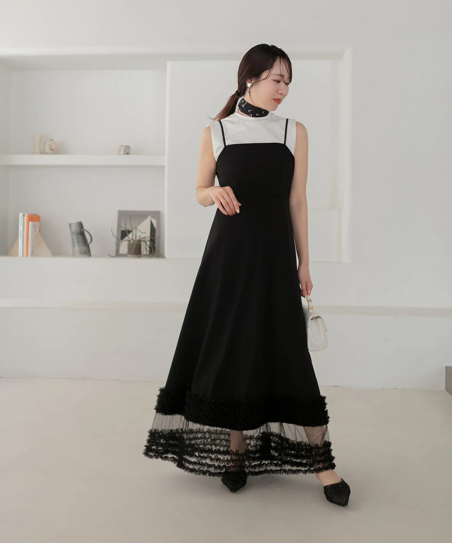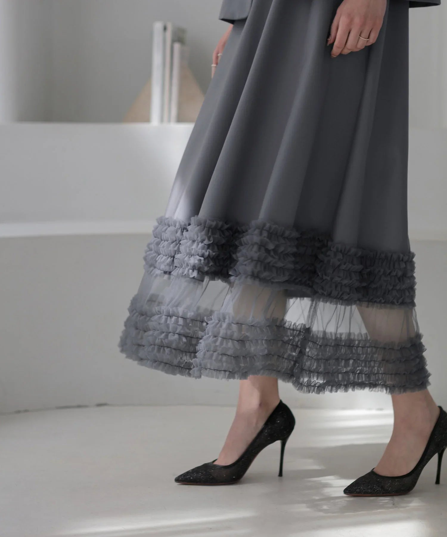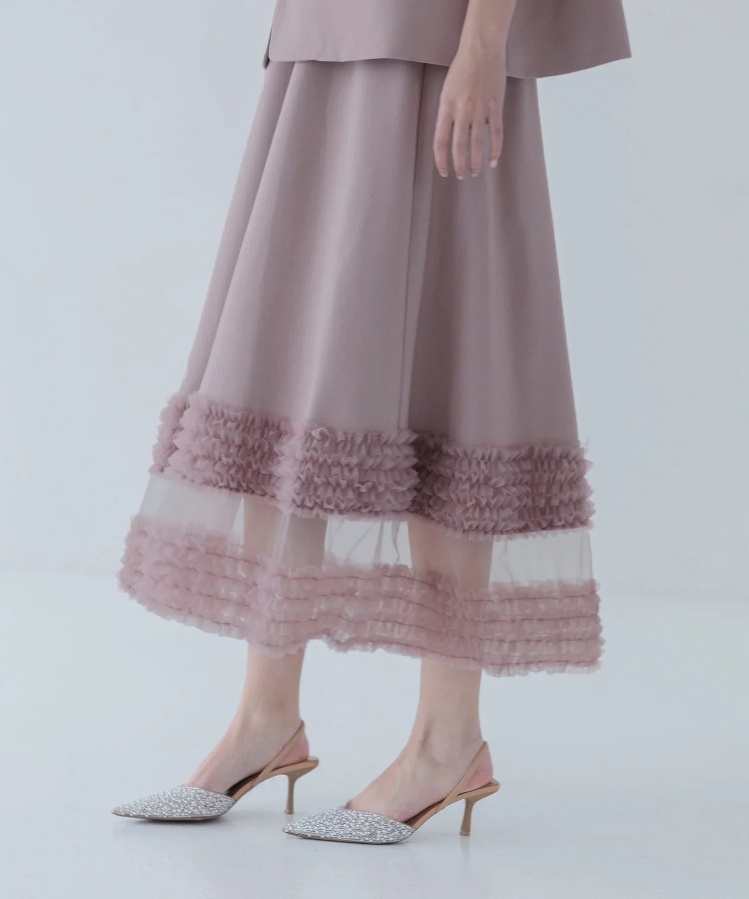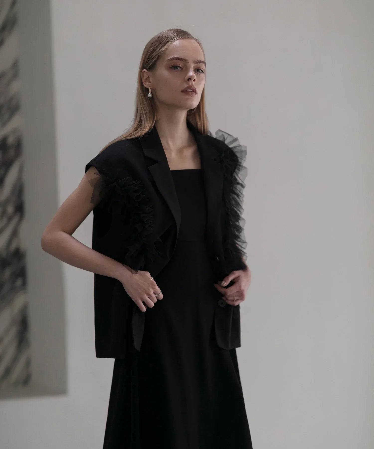 立体的なチュールフリルをあしらったジレと、