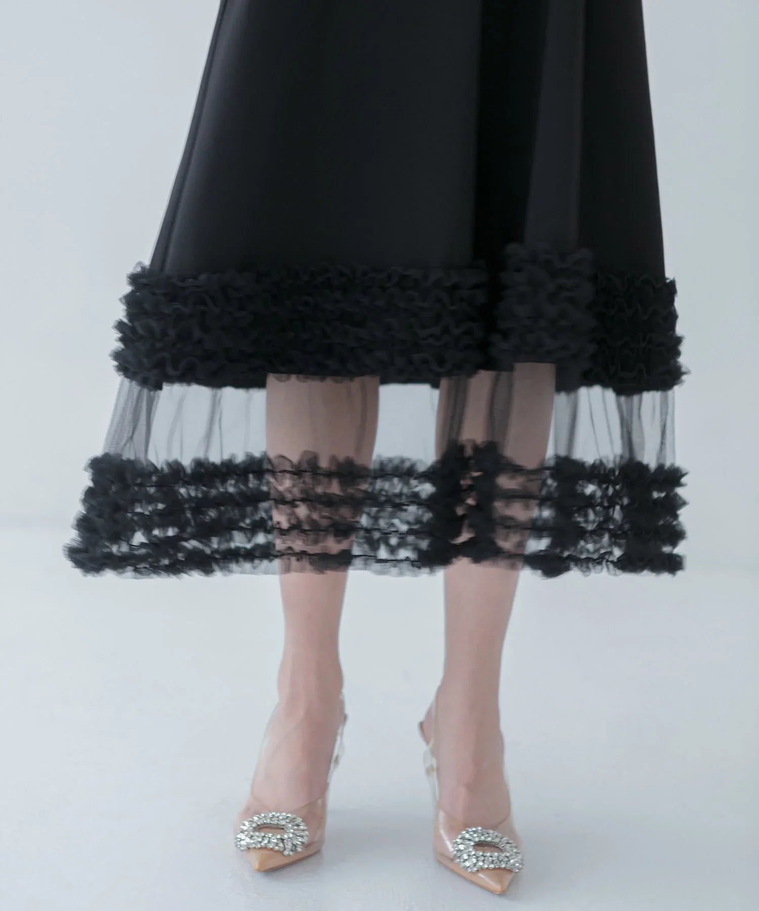 Aラインワンピースは、ふんわりと広がるシルエットが上品で、動くたびに美しいラインを描きます。裾には繊細なチュールが重ねられており、細やかなフリルが歩くたびに優雅に揺れ、自然な華やぎと上品さを引き立ててくれる一着です。