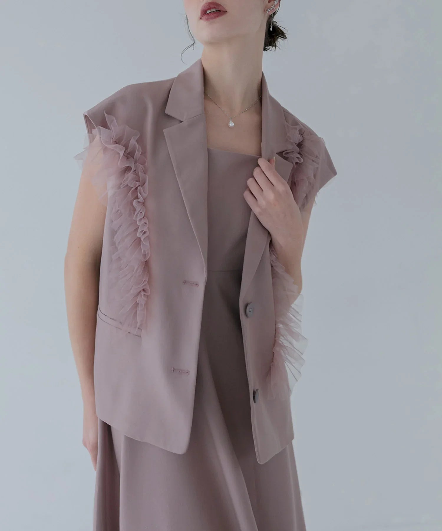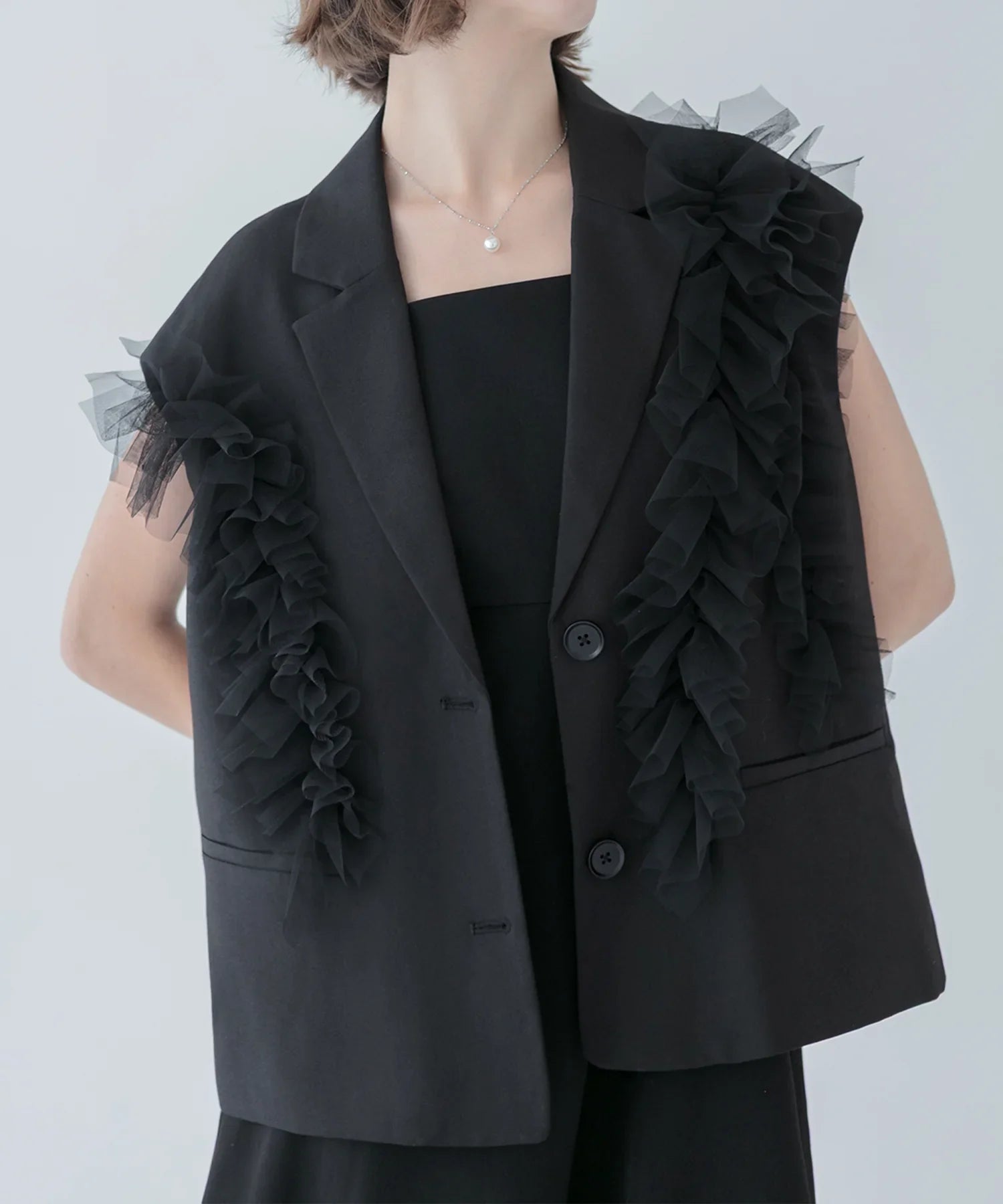 チュールフリルジレは、テーラードカラーが程よくきちんと感を漂わせつつ、肩から袖にかけて施された立体的なチュールフリルが華やかで女性らしいアクセントに。フロントはボタン留めのクラシカルなデザインながら、袖なし仕様による軽やかさも兼ね備え、フォーマルシーンでも存在感を放つ仕上がりです。