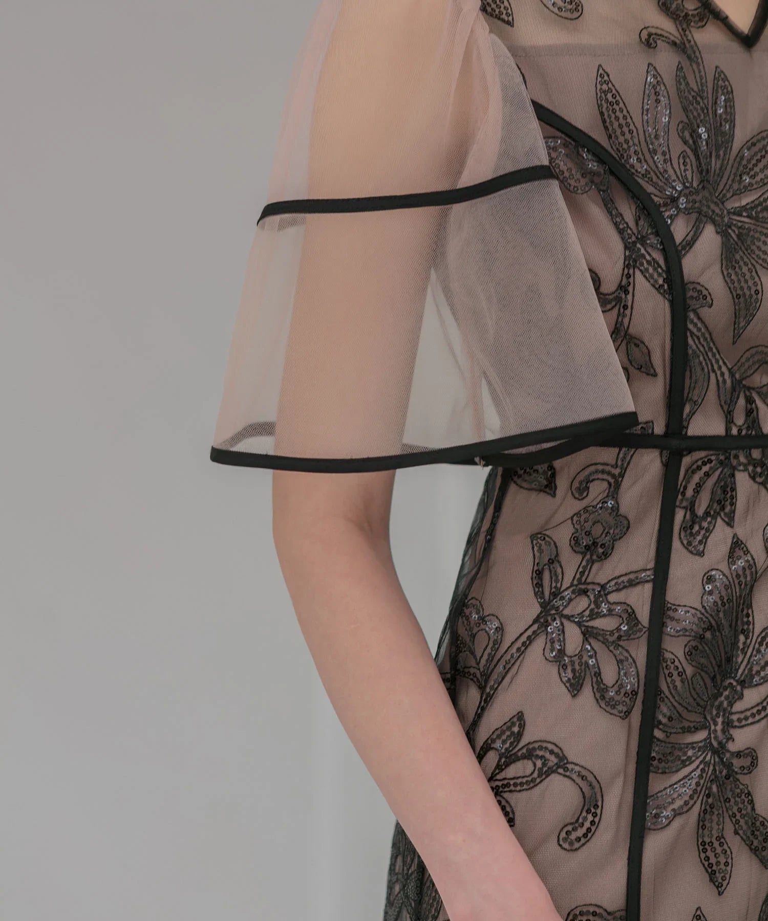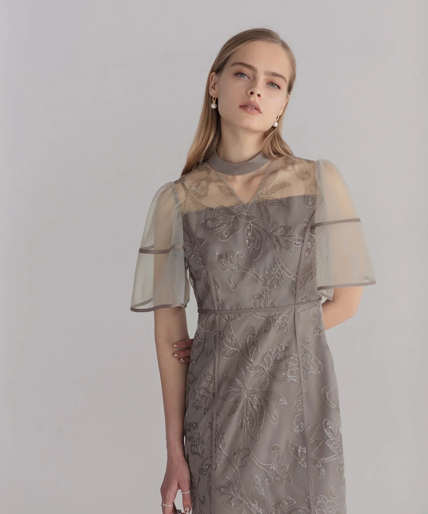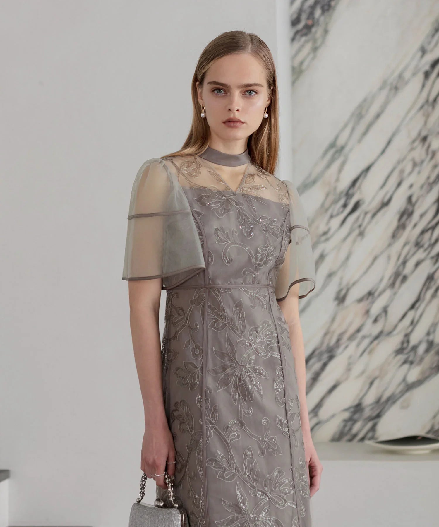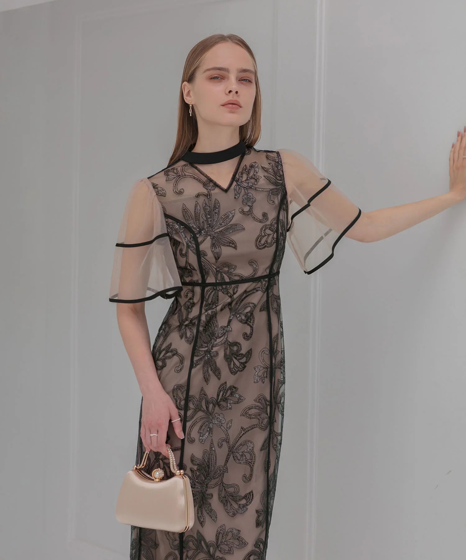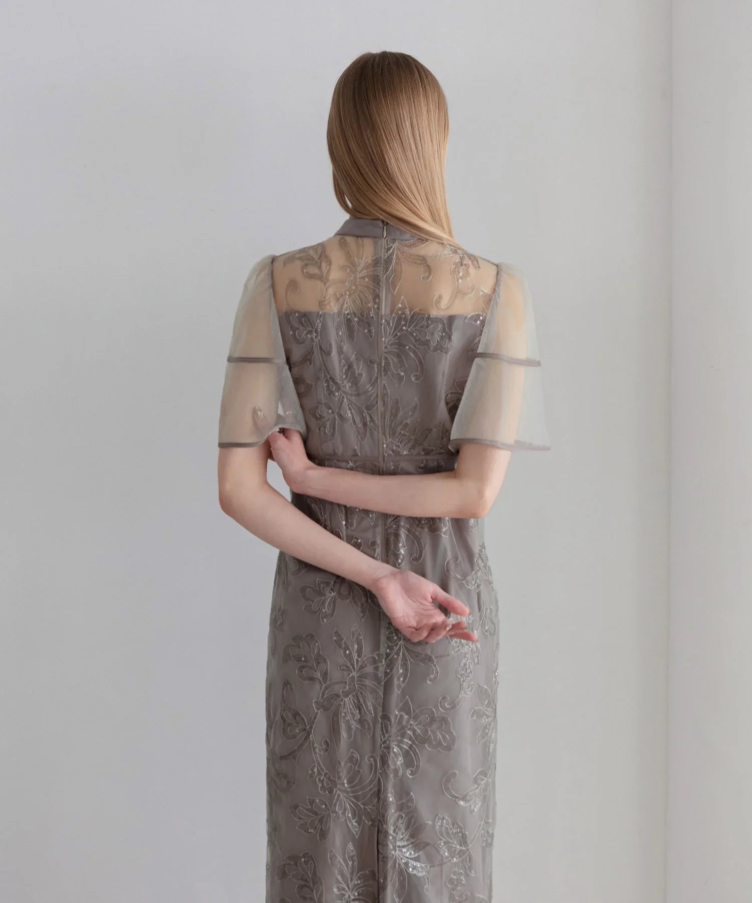 繊細なフラワー刺繍にスパンコールが施された、上品なIラインドレス