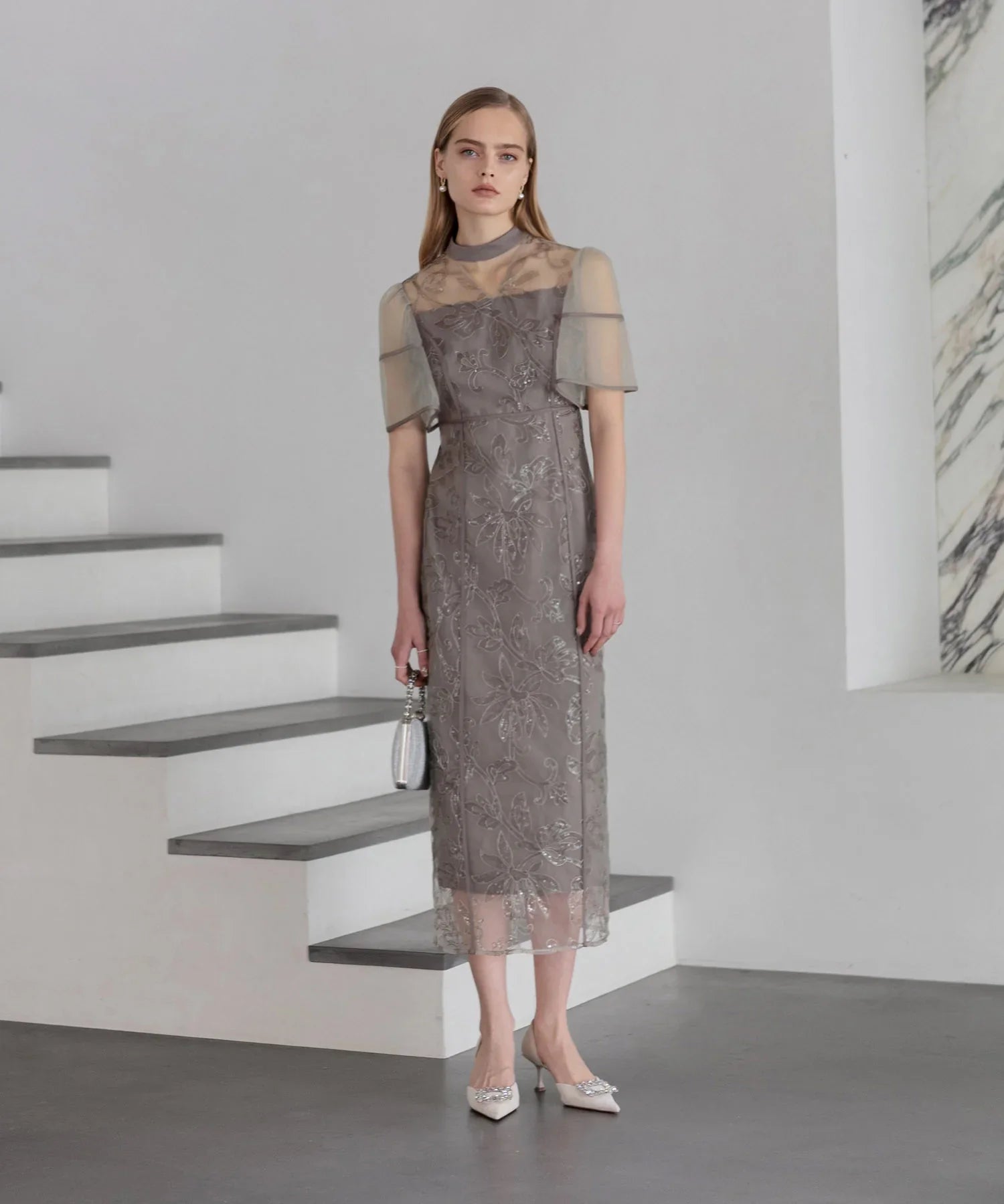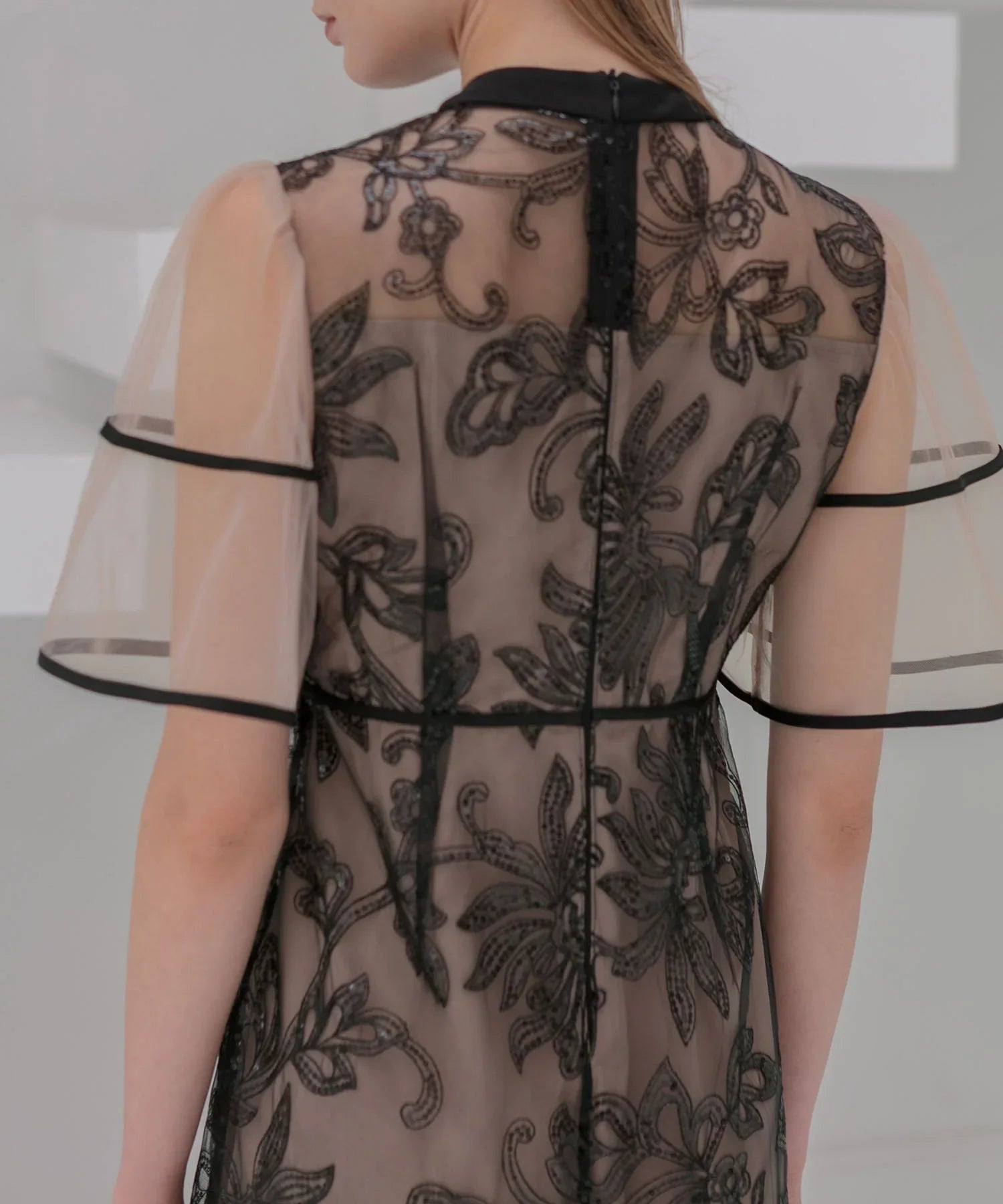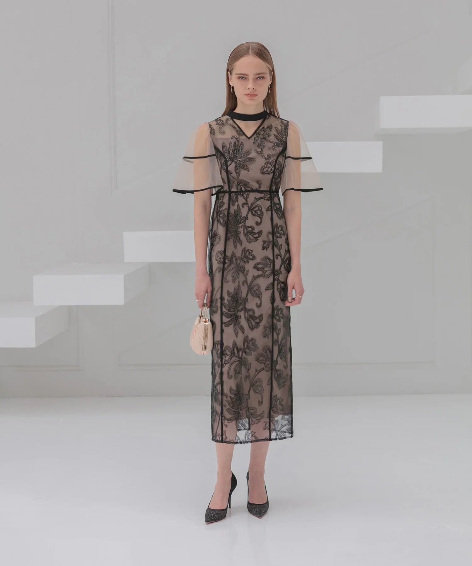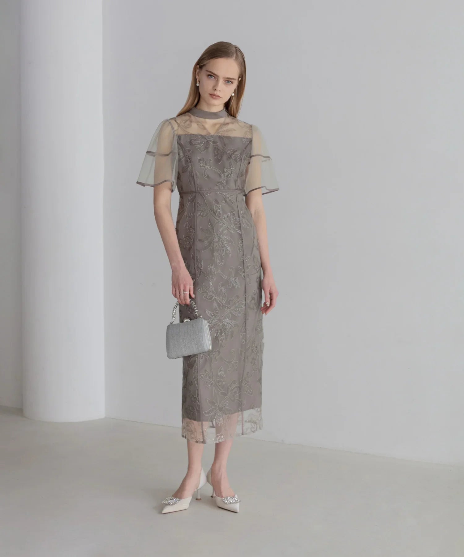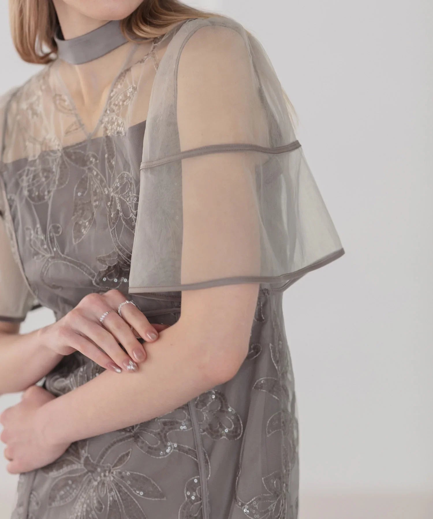 繊細なフラワー刺繍にスパンコールが施された、上品なIラインドレス