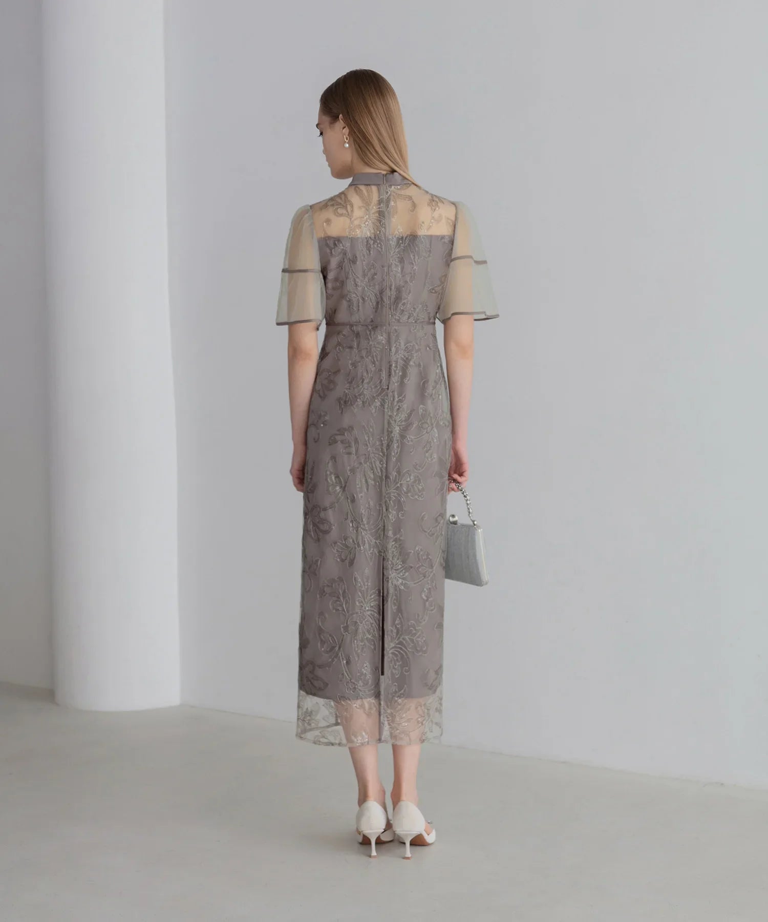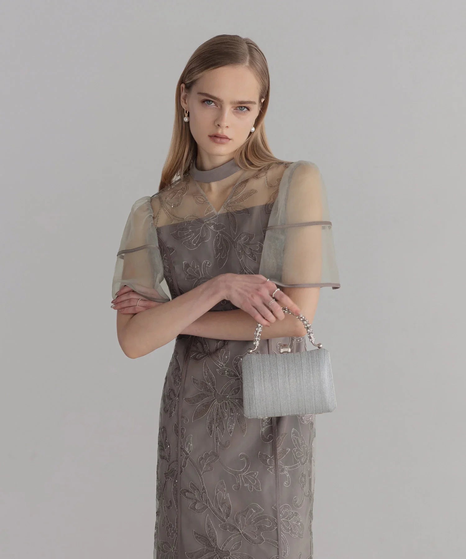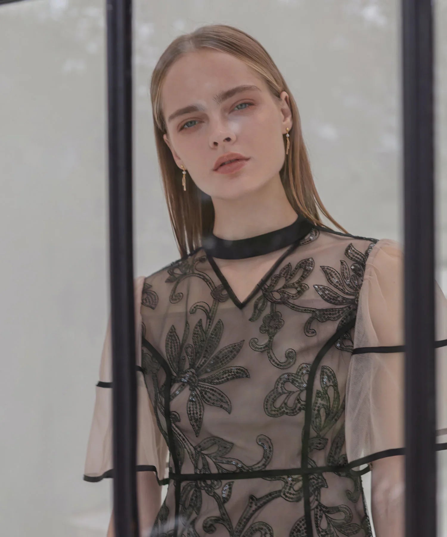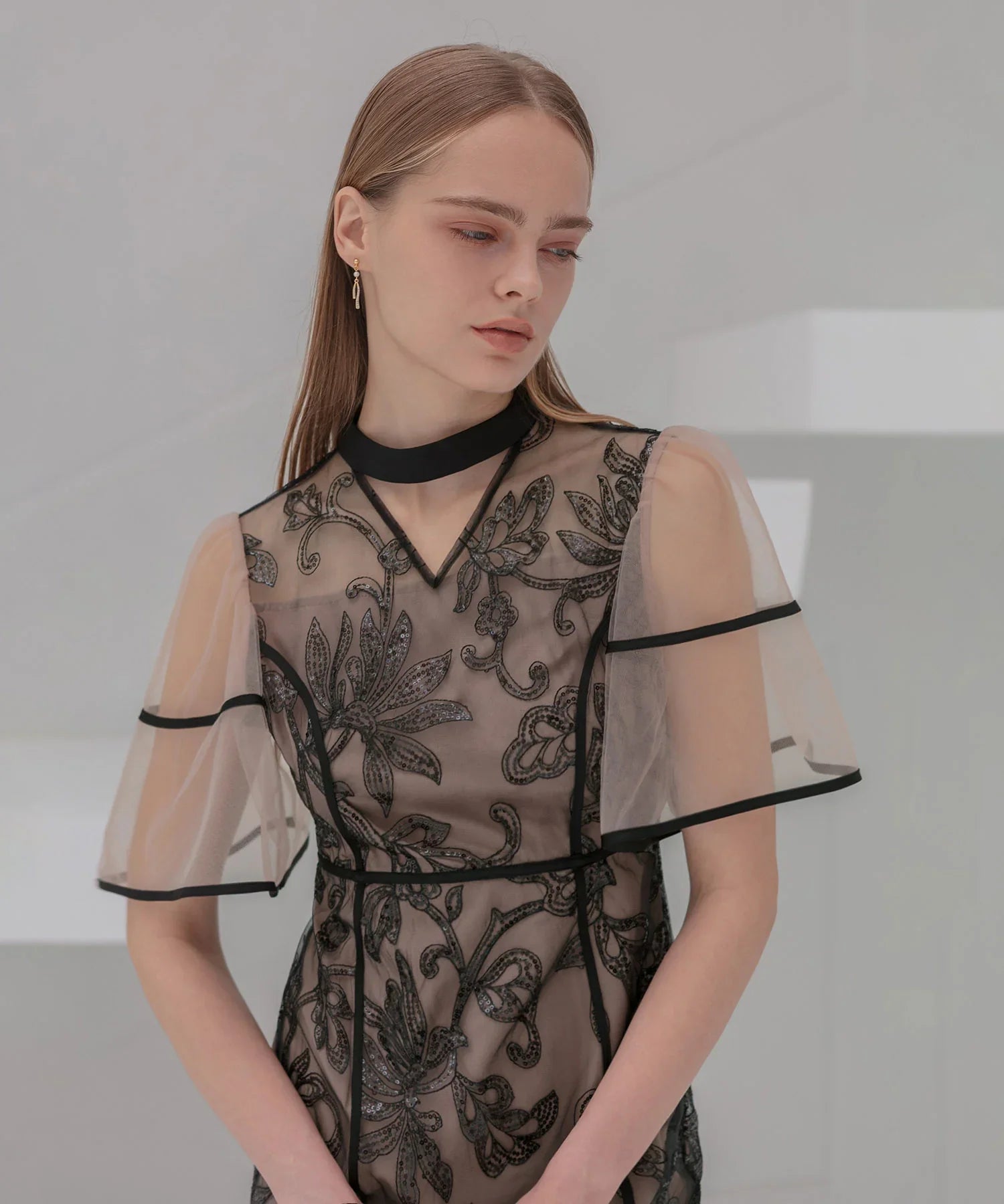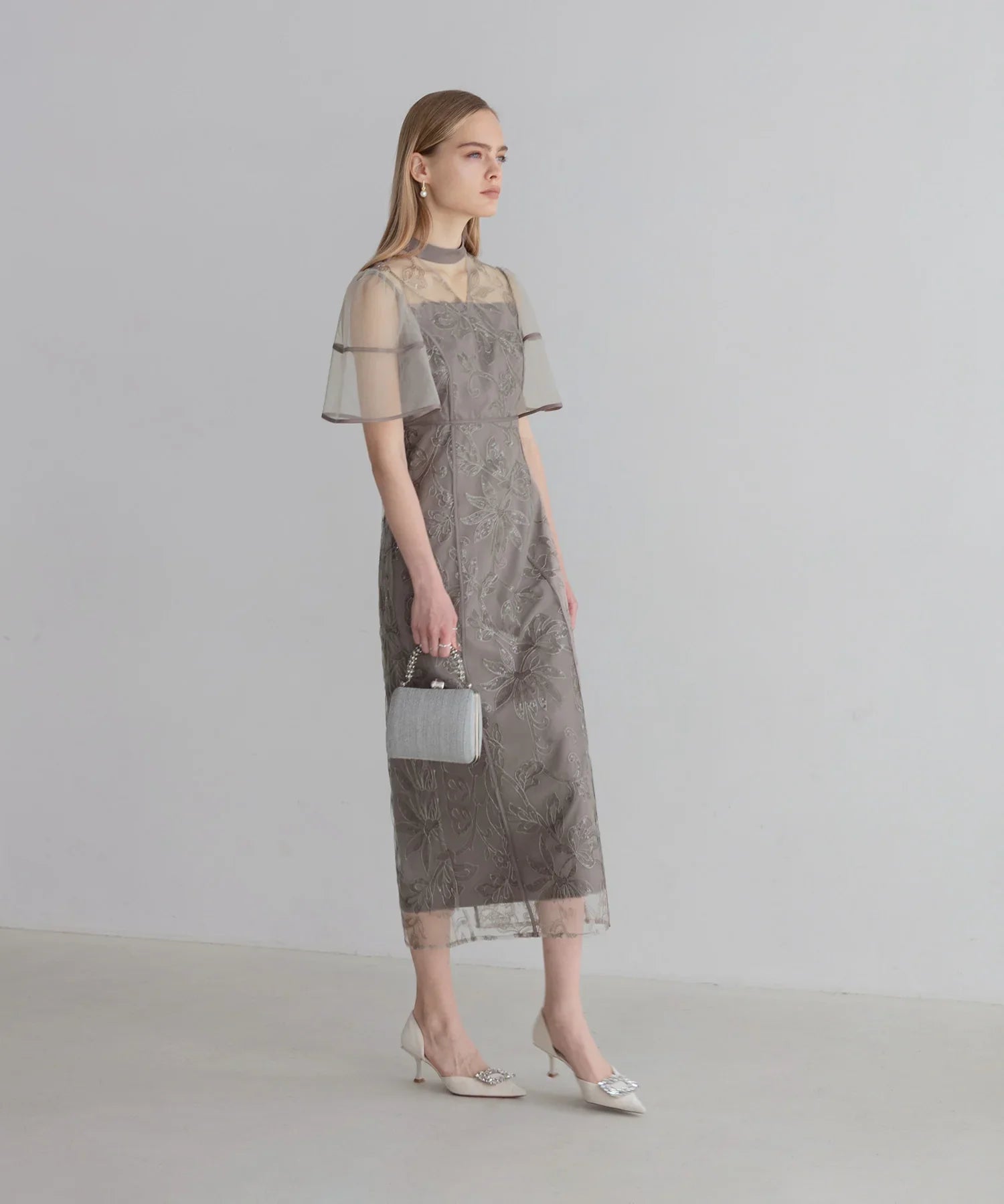 繊細なフラワー刺繍にスパンコールが施された、上品なIラインドレス
