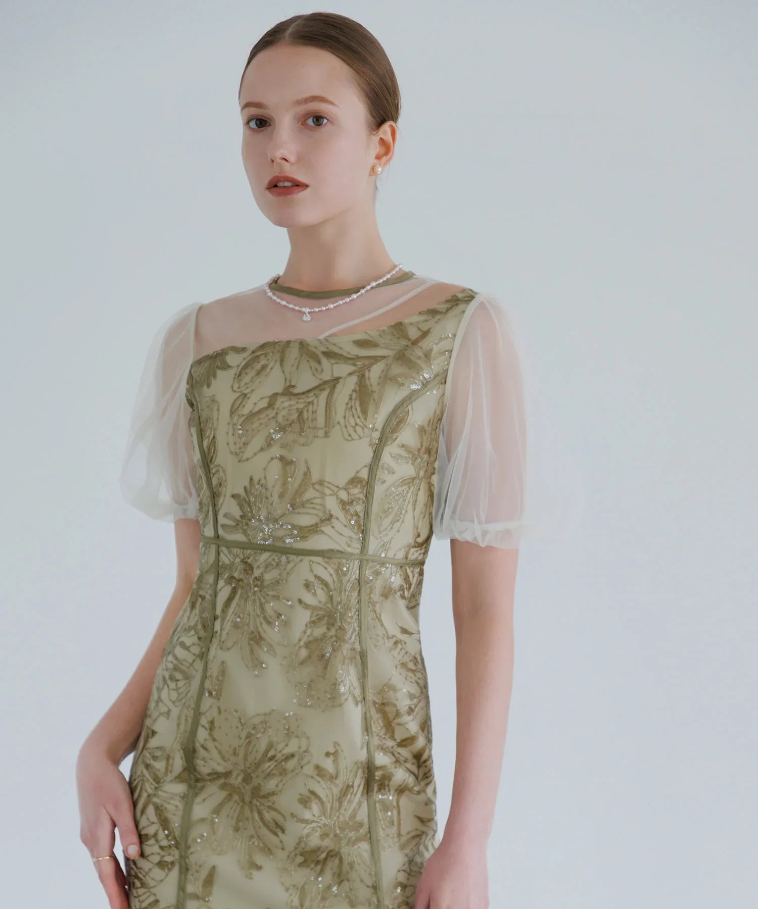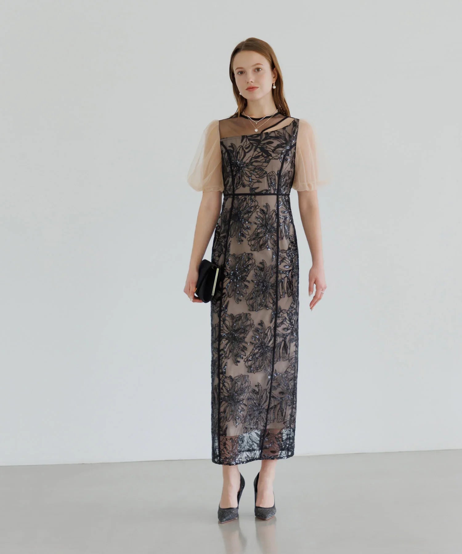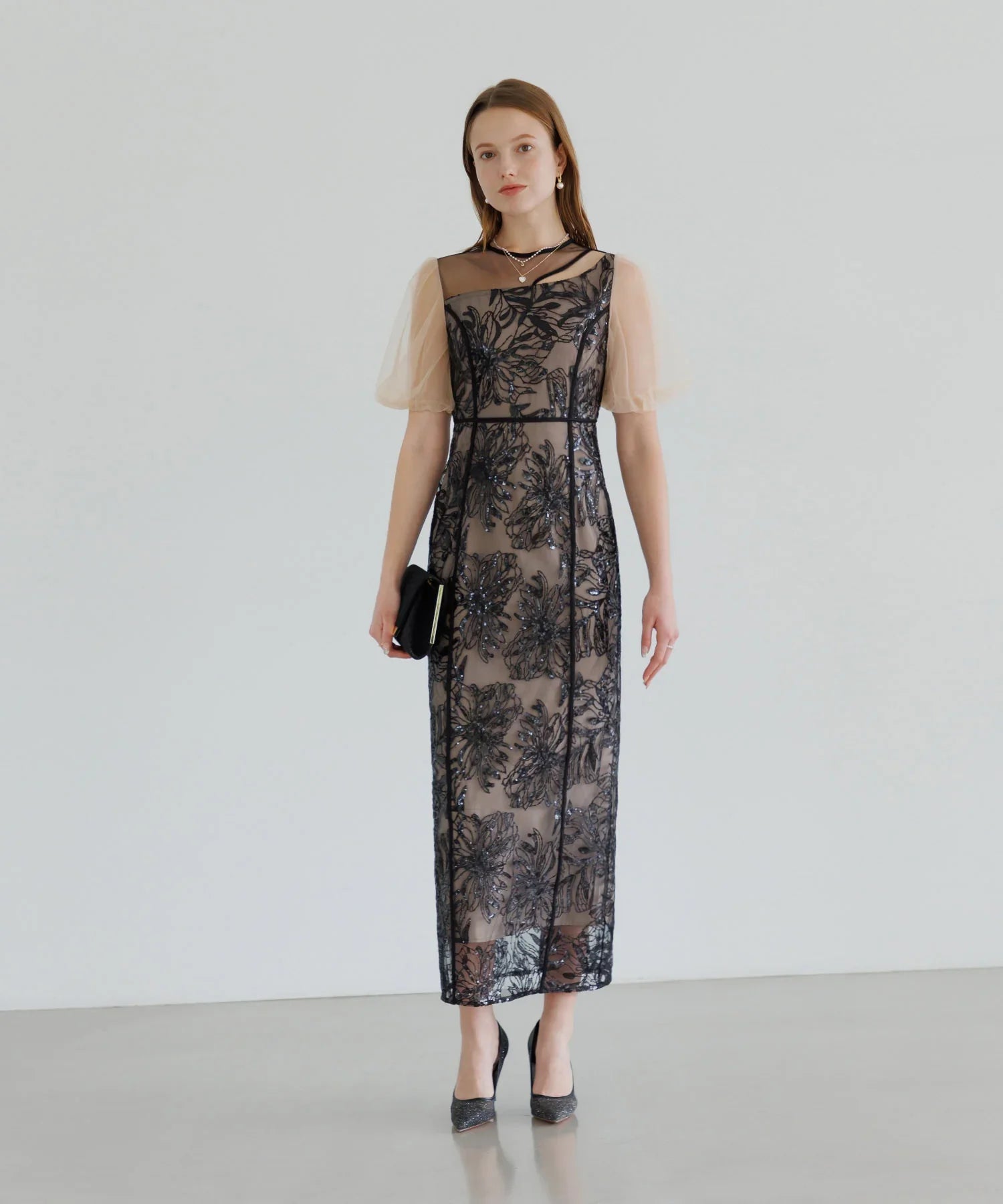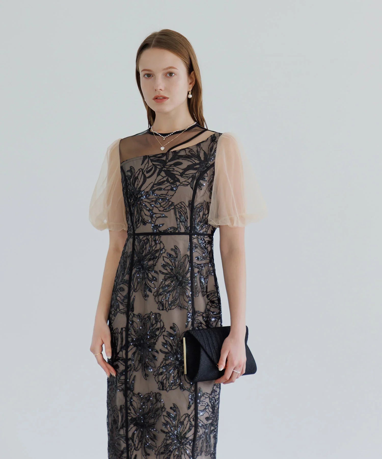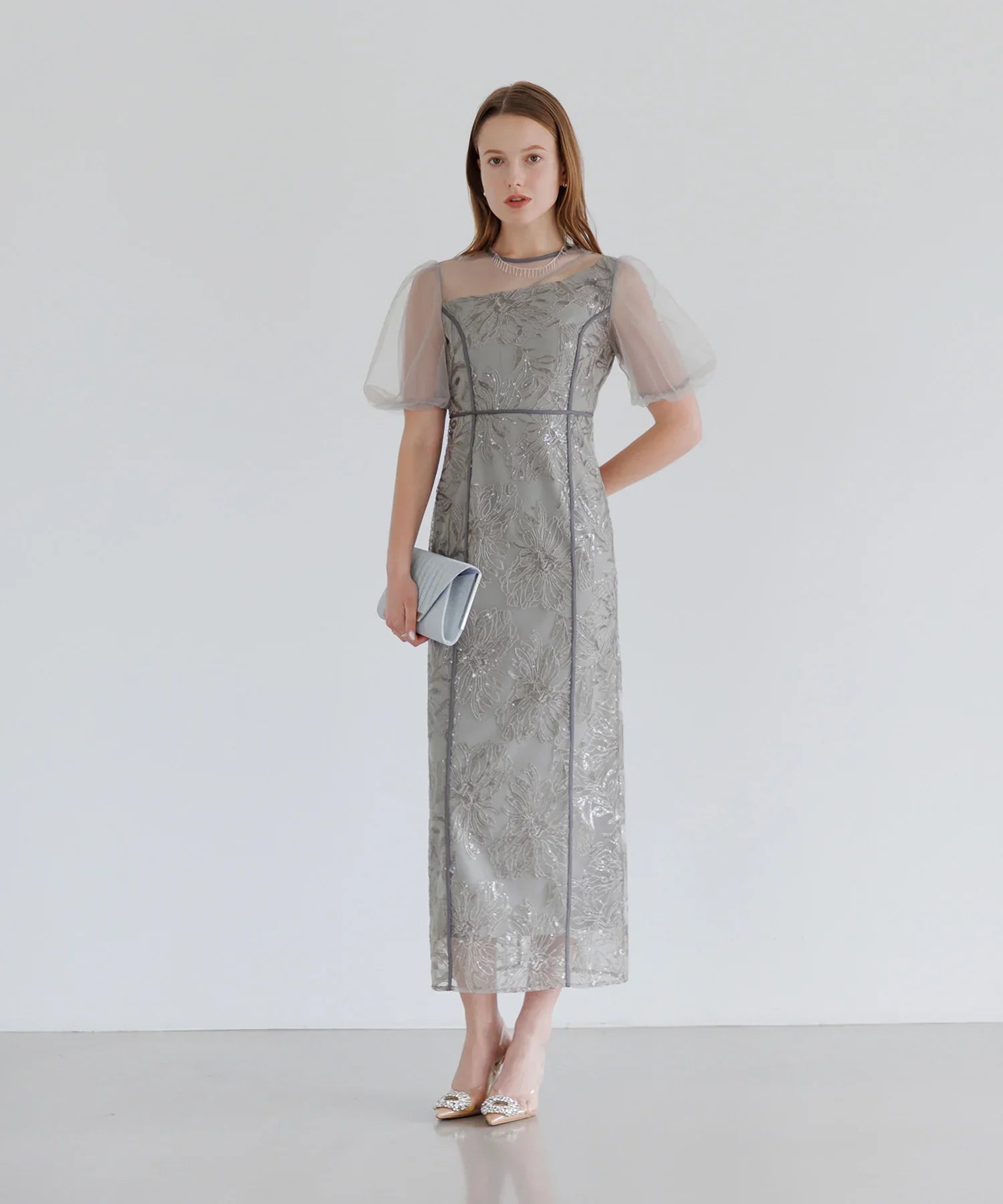 立体感のある花柄刺繍と透け感のあるチュールスリーブが、纏うだけで上品さと存在感を引き立ててくれます。