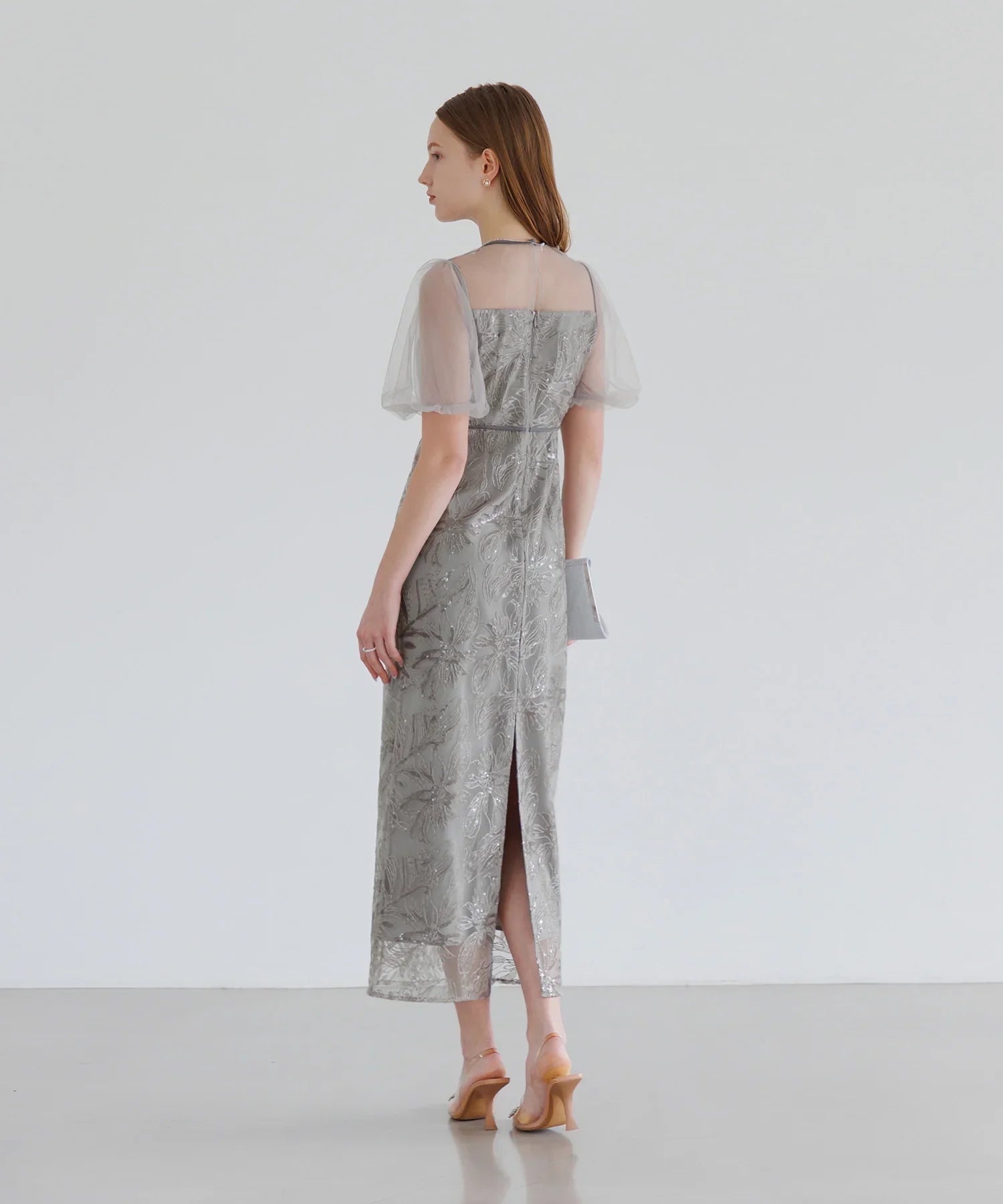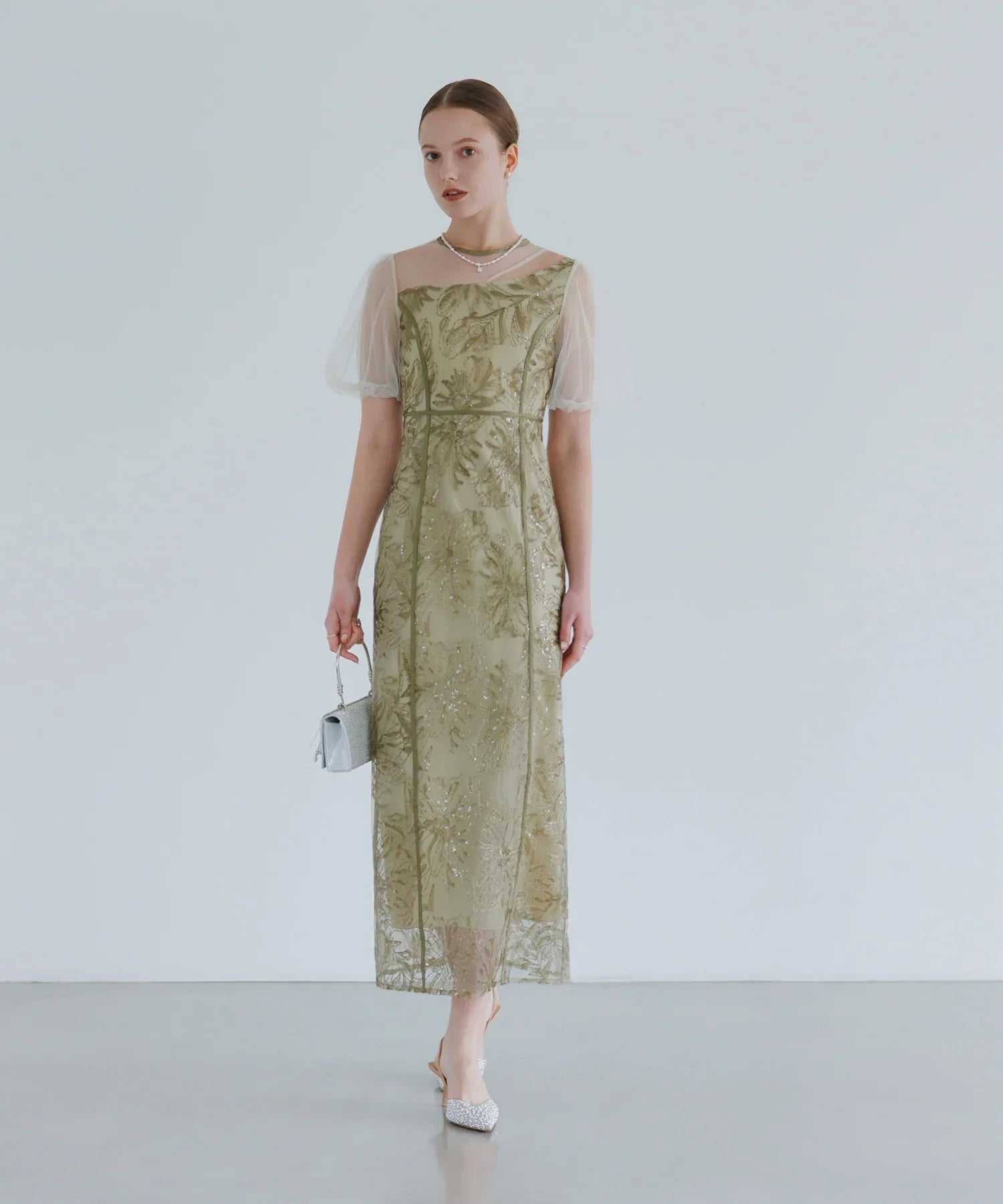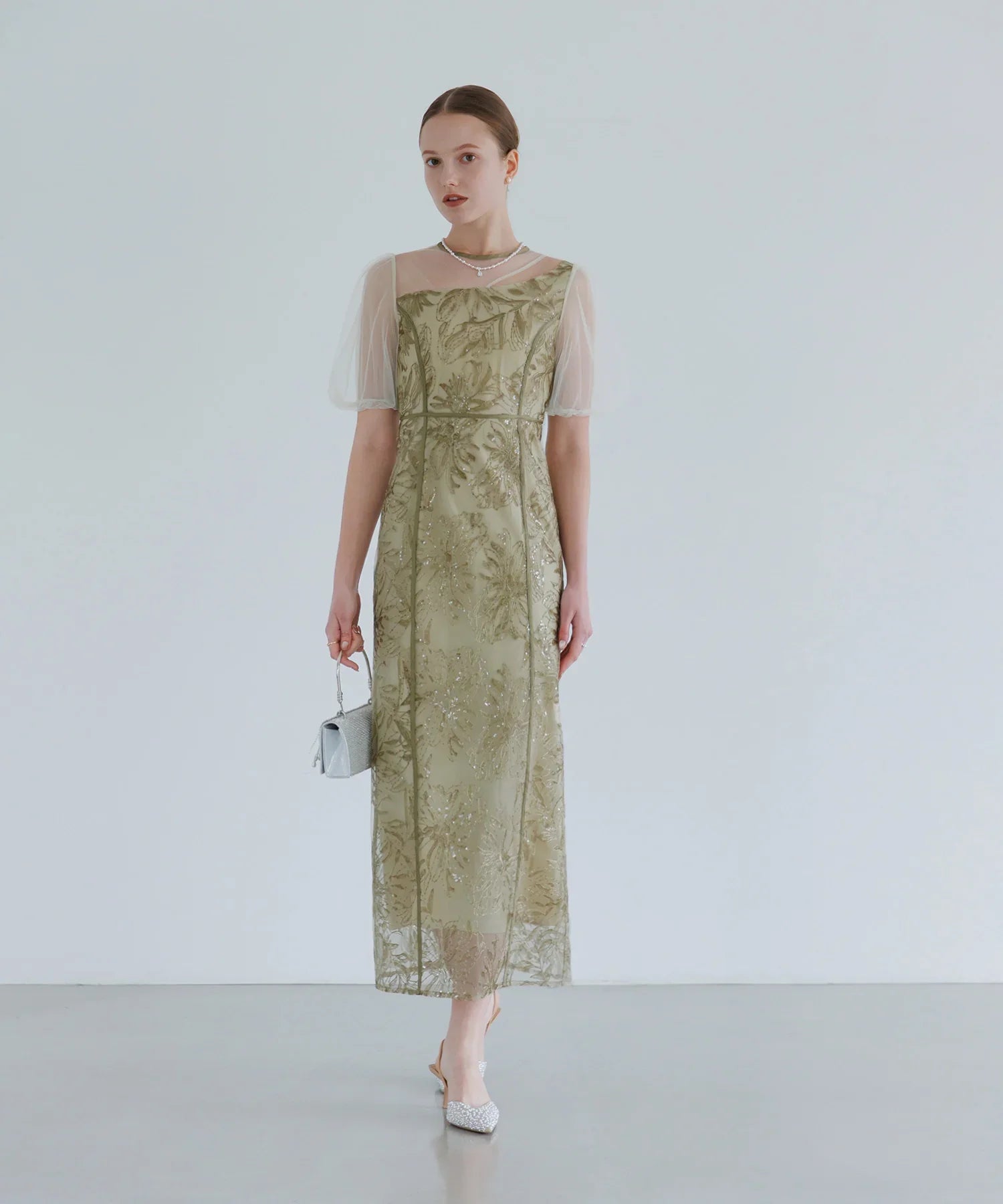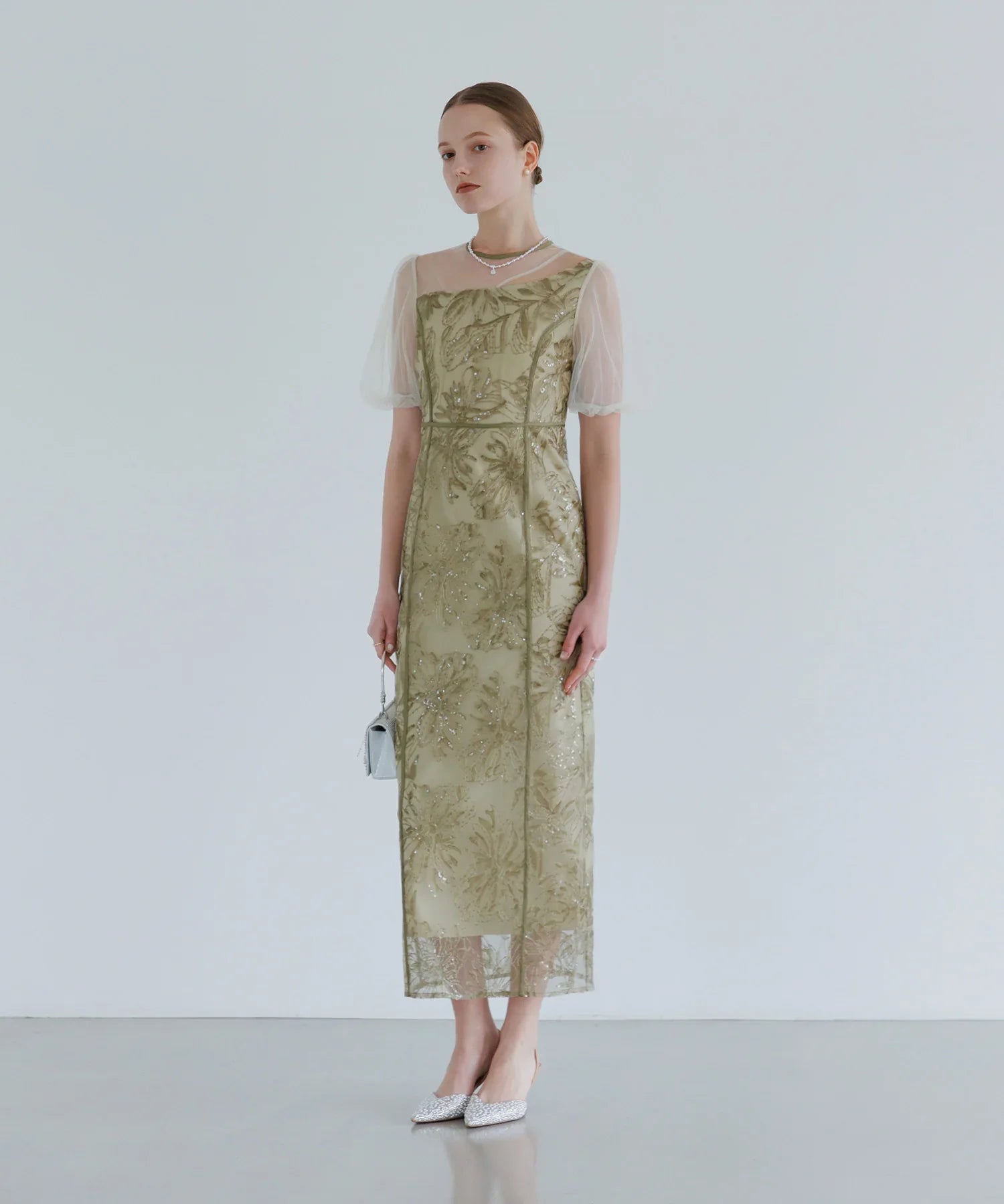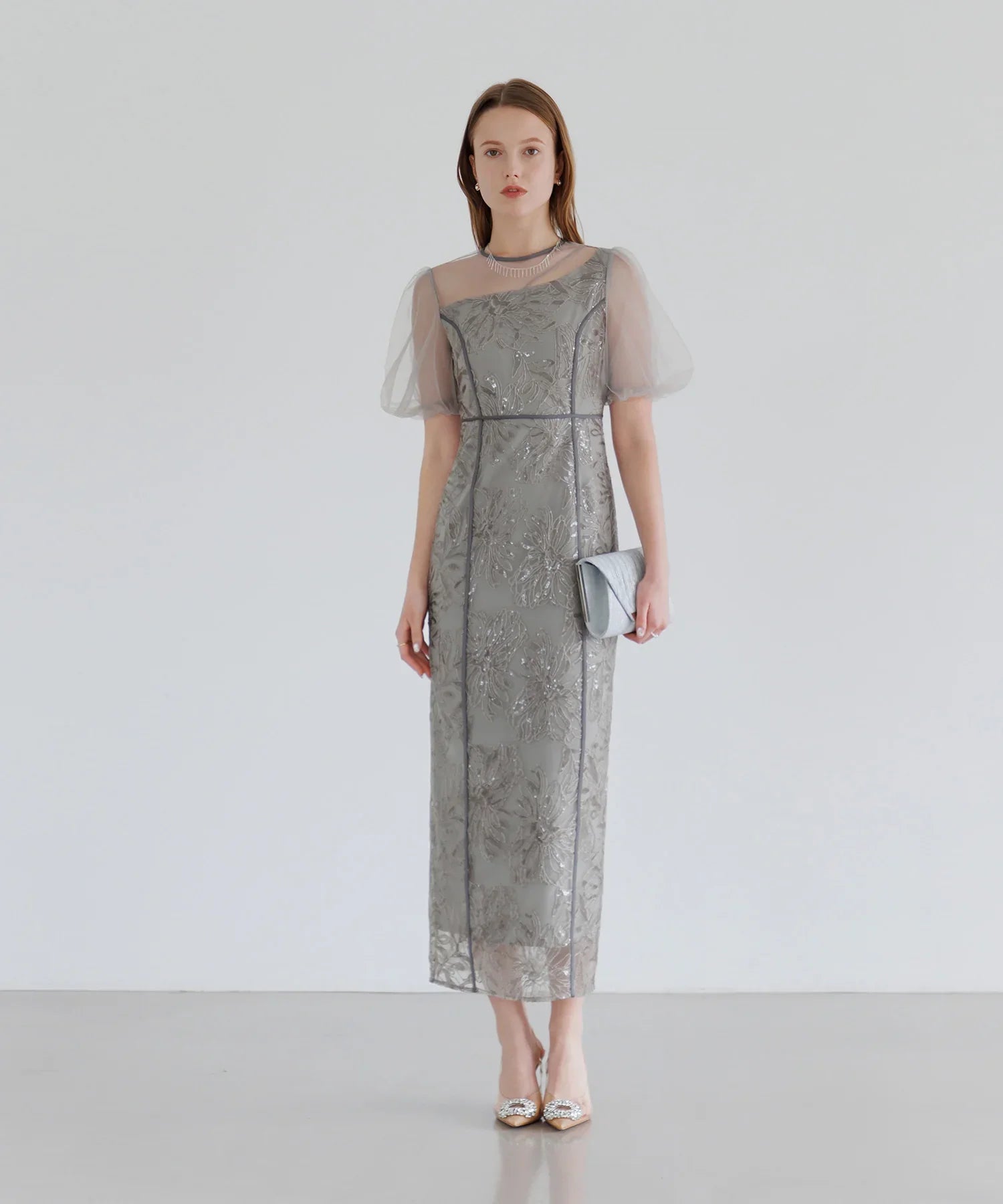 立体感のある花柄刺繍と透け感のあるチュールスリーブが、纏うだけで上品さと存在感を引き立ててくれます。