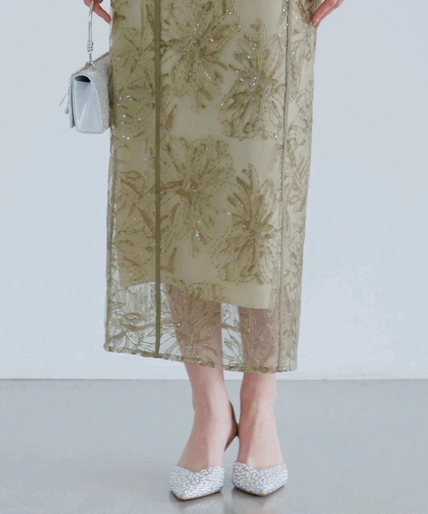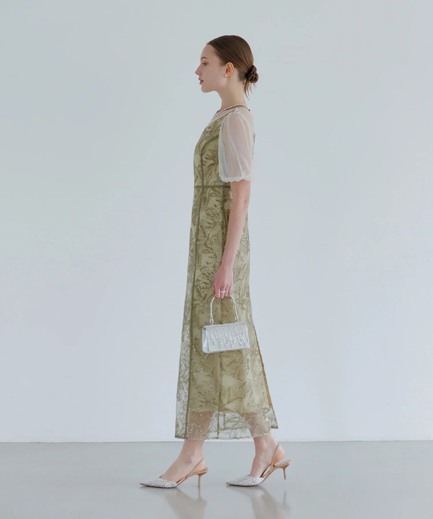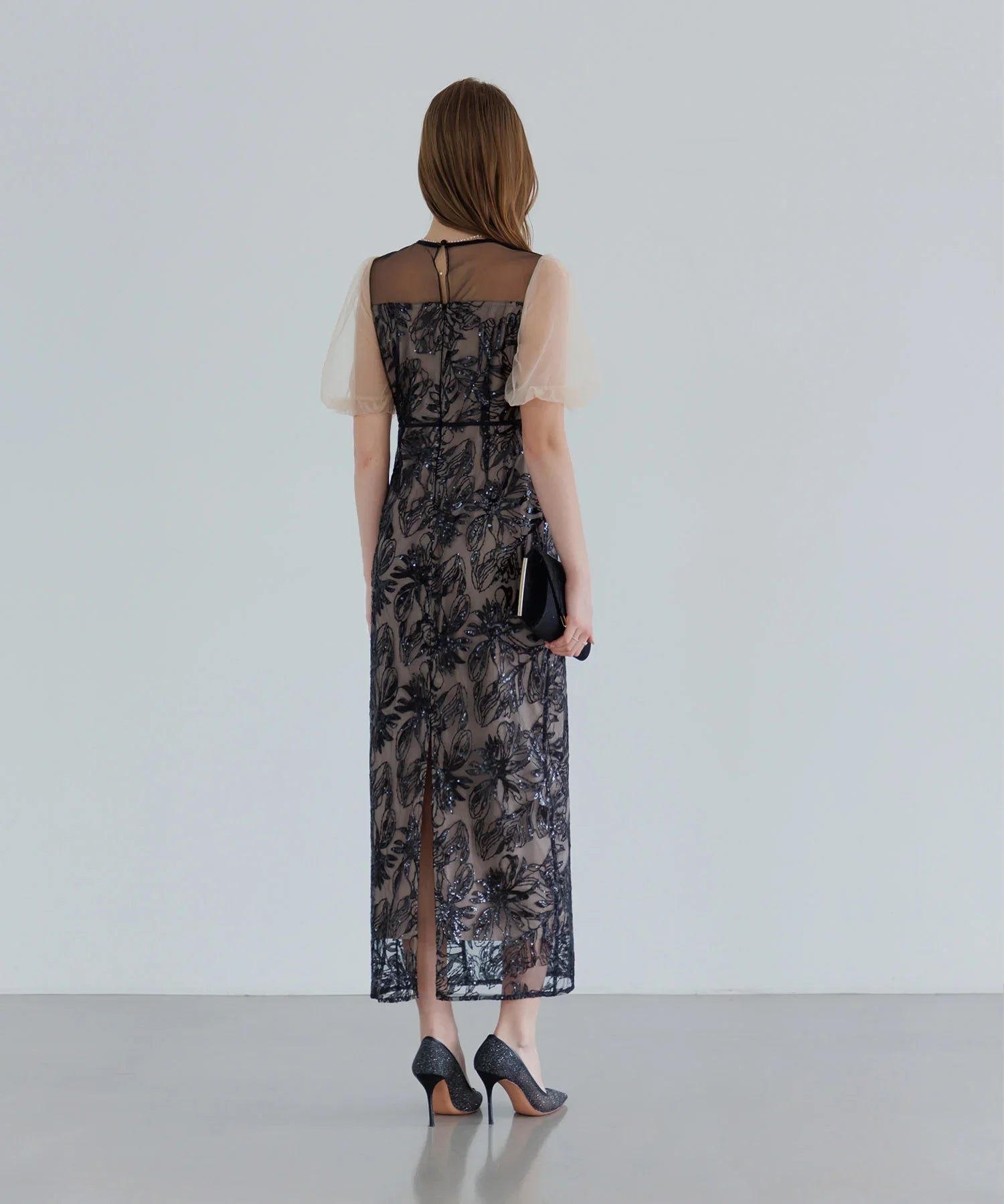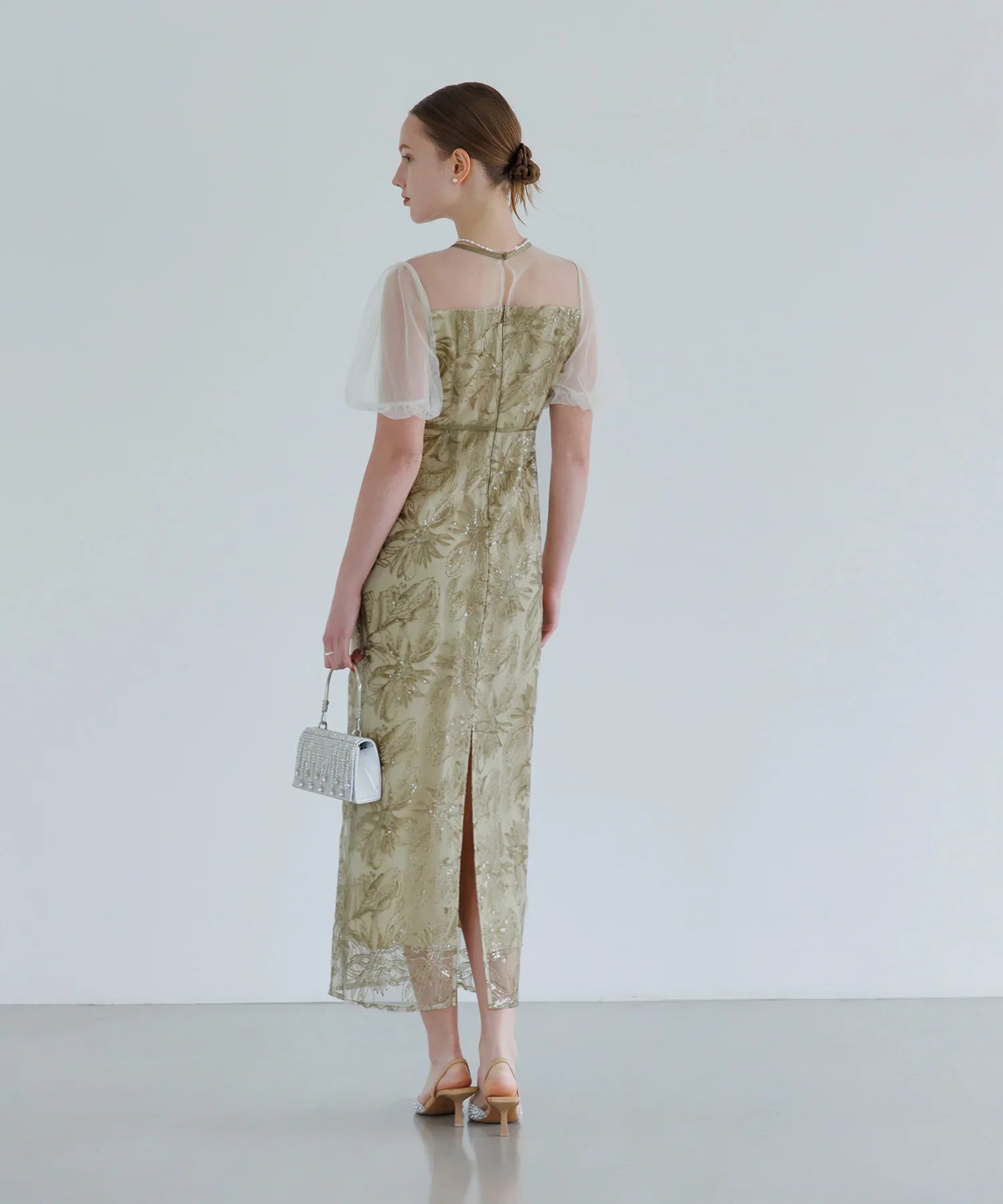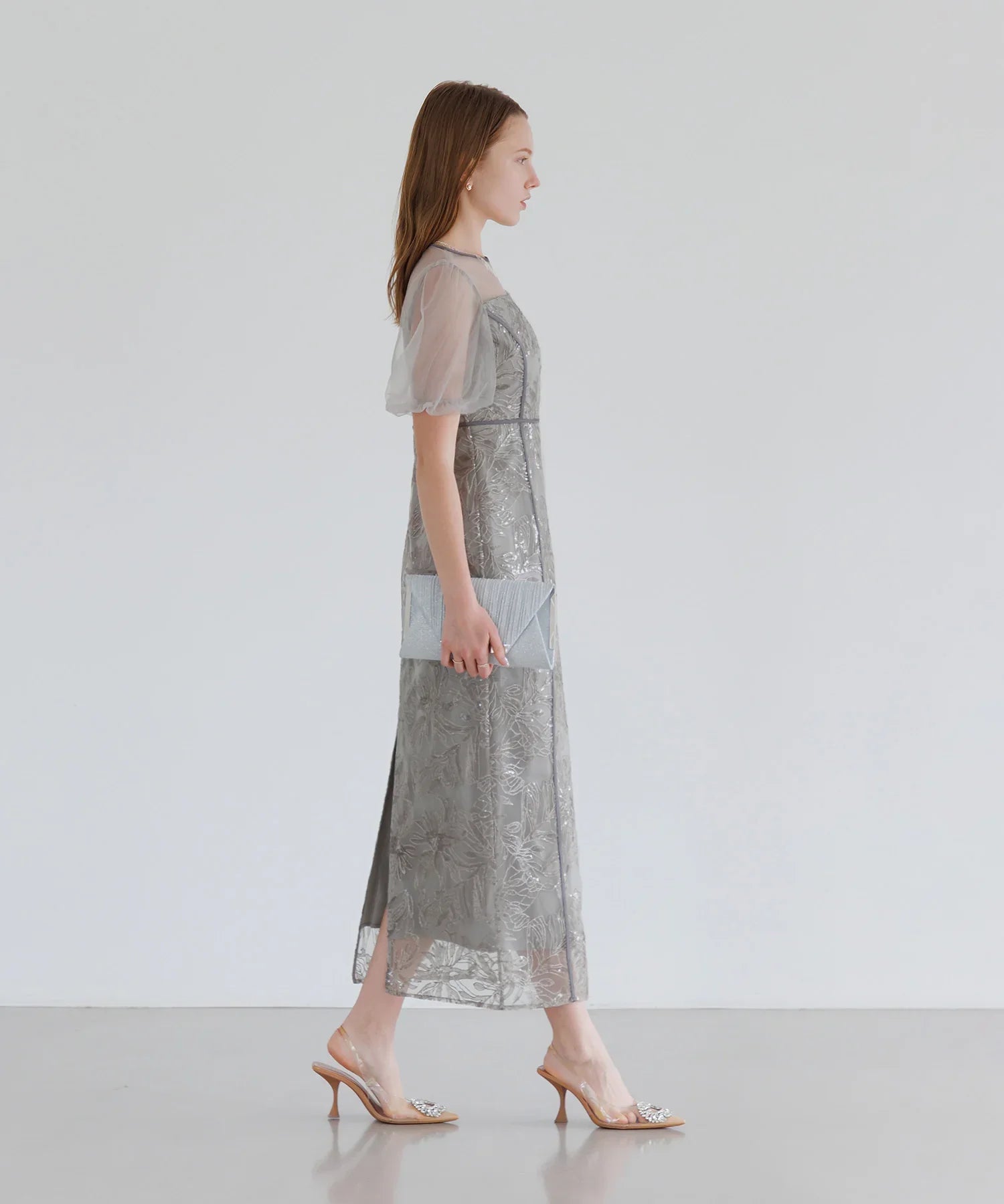立体感のある花柄刺繍と透け感のあるチュールスリーブが、纏うだけで上品さと存在感を引き立ててくれます。