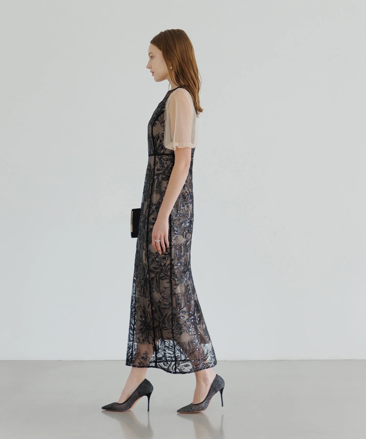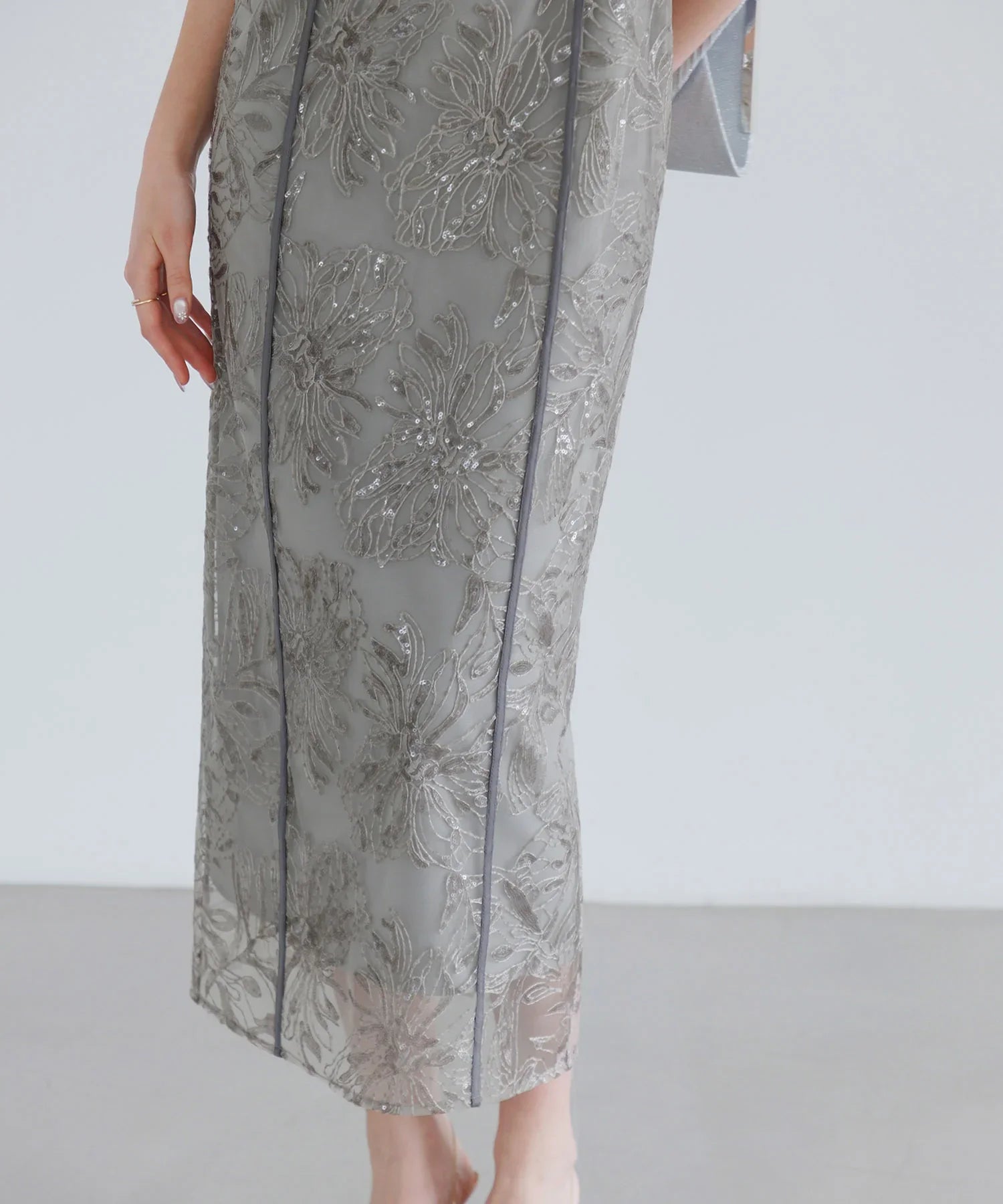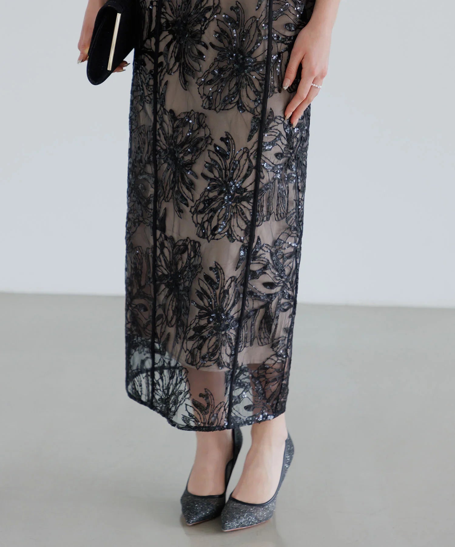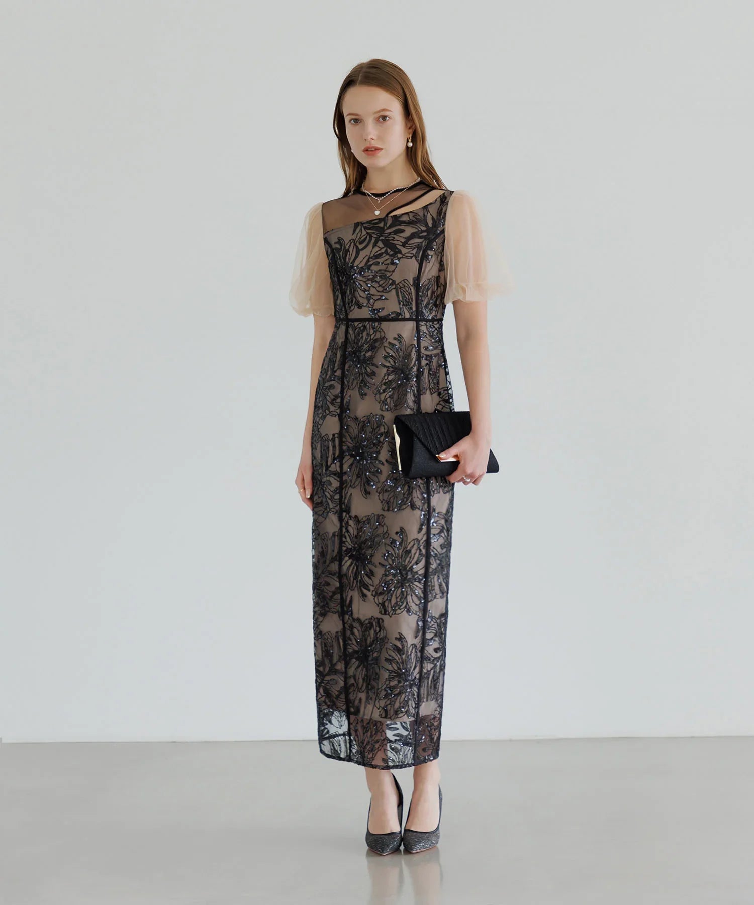立体感あるフラワー刺繍を贅沢に施したクラシカルなデザインが特徴です。アシンメトリーに仕上げたデコルテラインは肌を美しく魅せ、シンプルな中にも洗練された印象をプラス。ふんわりと広がるチュールスリーブは、女性らしい柔らかさと軽やかさを添えています。さらに、全体に散りばめられたスパンコール刺繍が動くたびにきらめき、華やかな存在感を演出します。縦のラインを強調するIラインシルエットにより、自然とスタイルアップが叶うのも嬉しいポイントです。